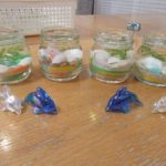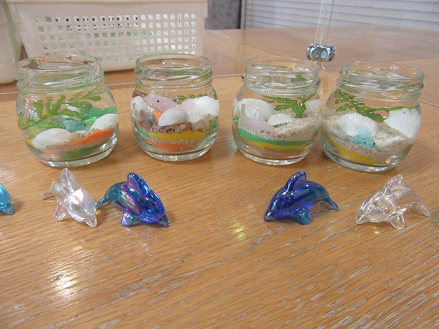 本日は星の砂や貝殻、ガラスでできたイルカ等を使い、