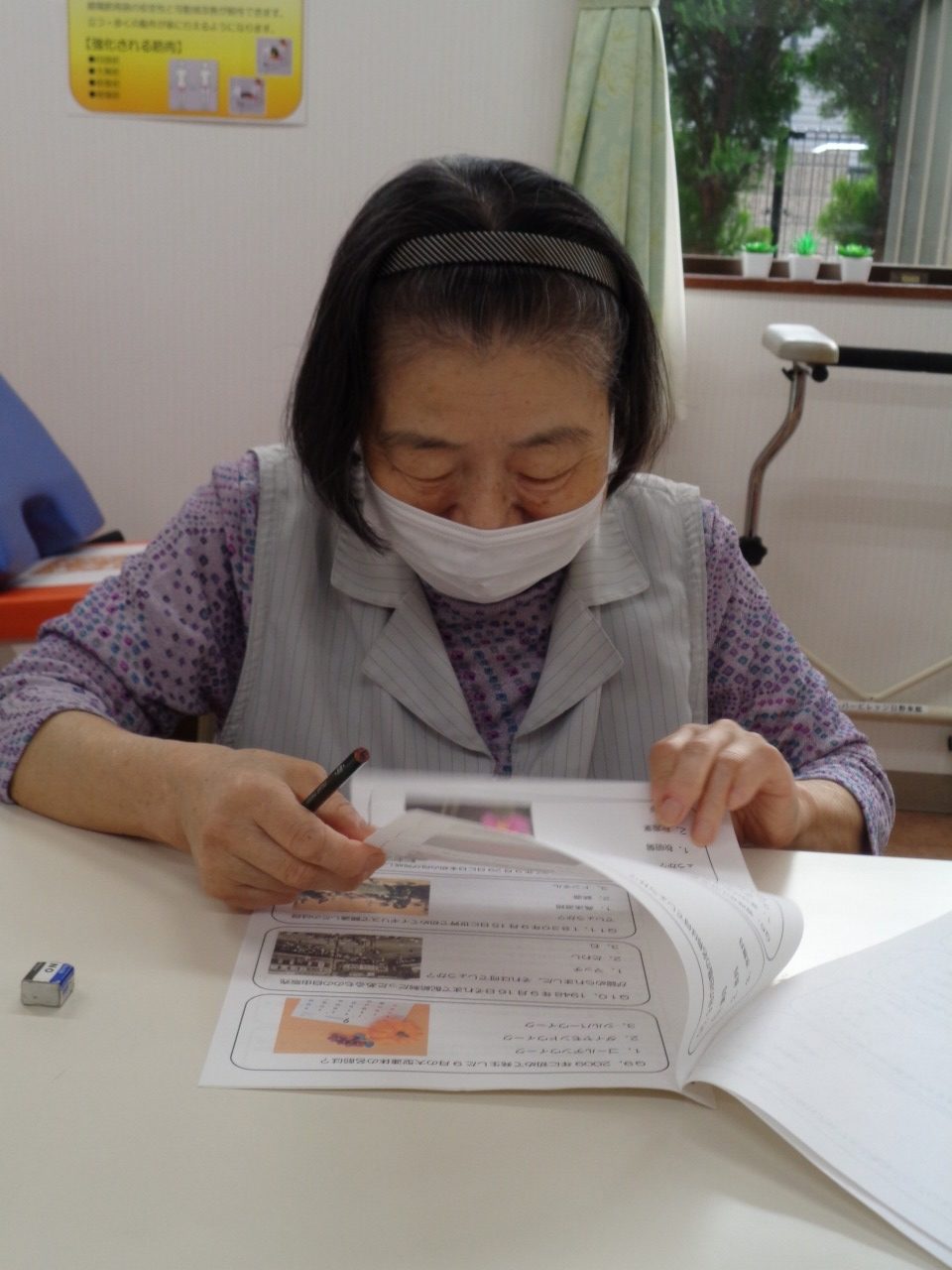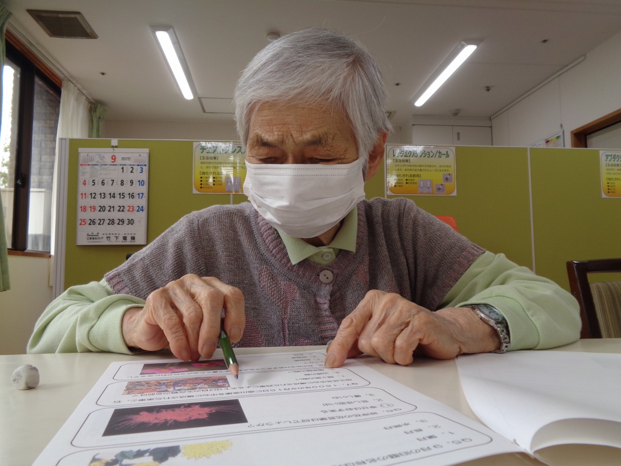 「なんだったかなぁ~」「あってるかなぁ」と悩みながらも真剣に取り組んで下さいました。その中で、普段は伺うことができないご家族のお話や、昔話を聴かせていただき、とても貴重な時間になりました。次回も、皆様とお話をしながら楽しく過ごせるようにしたいと思います。