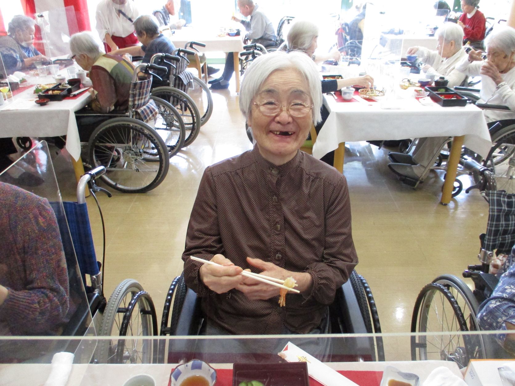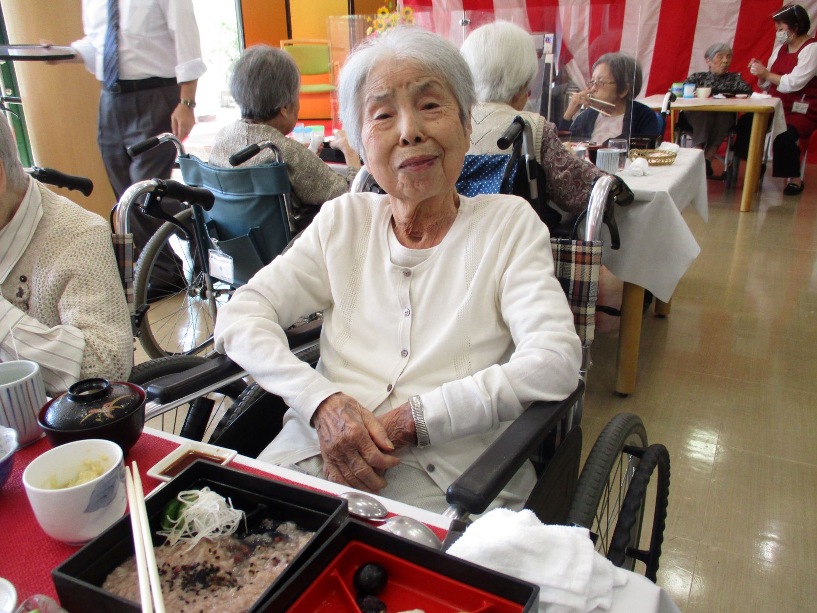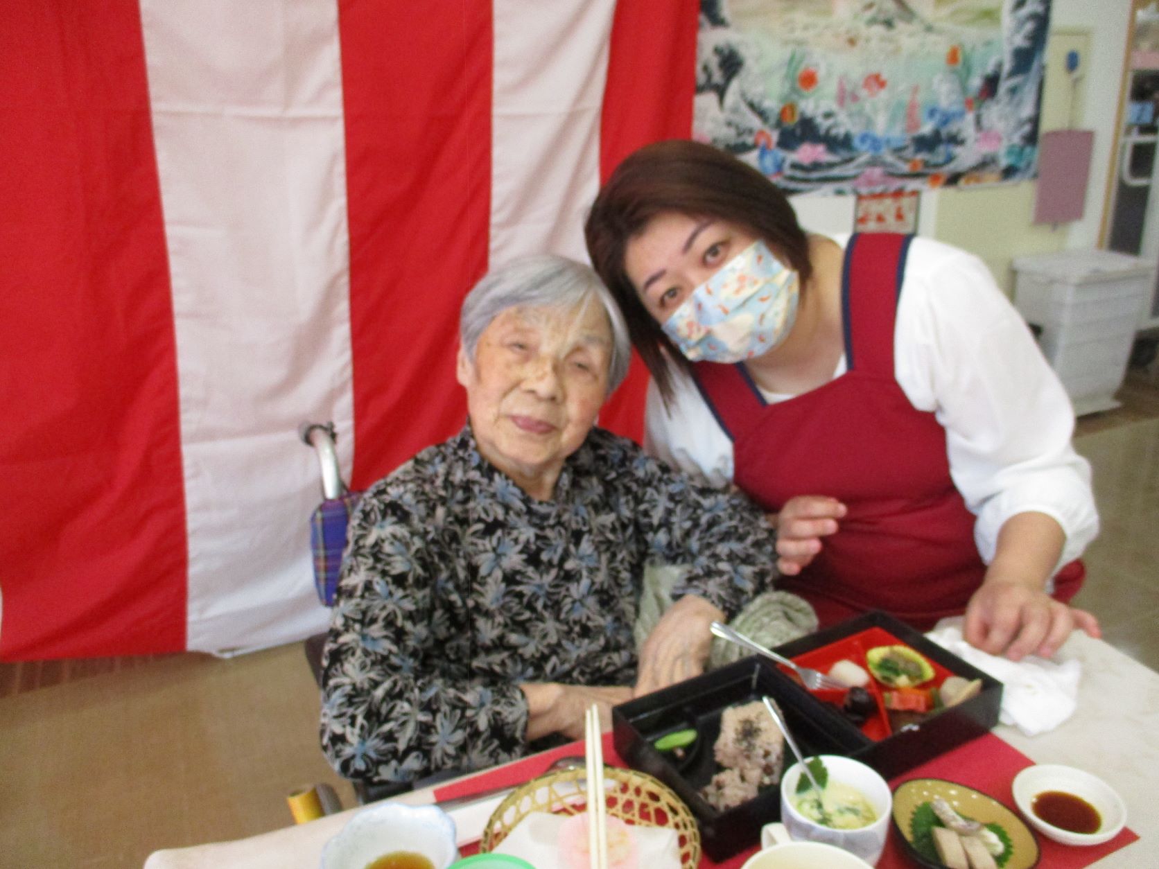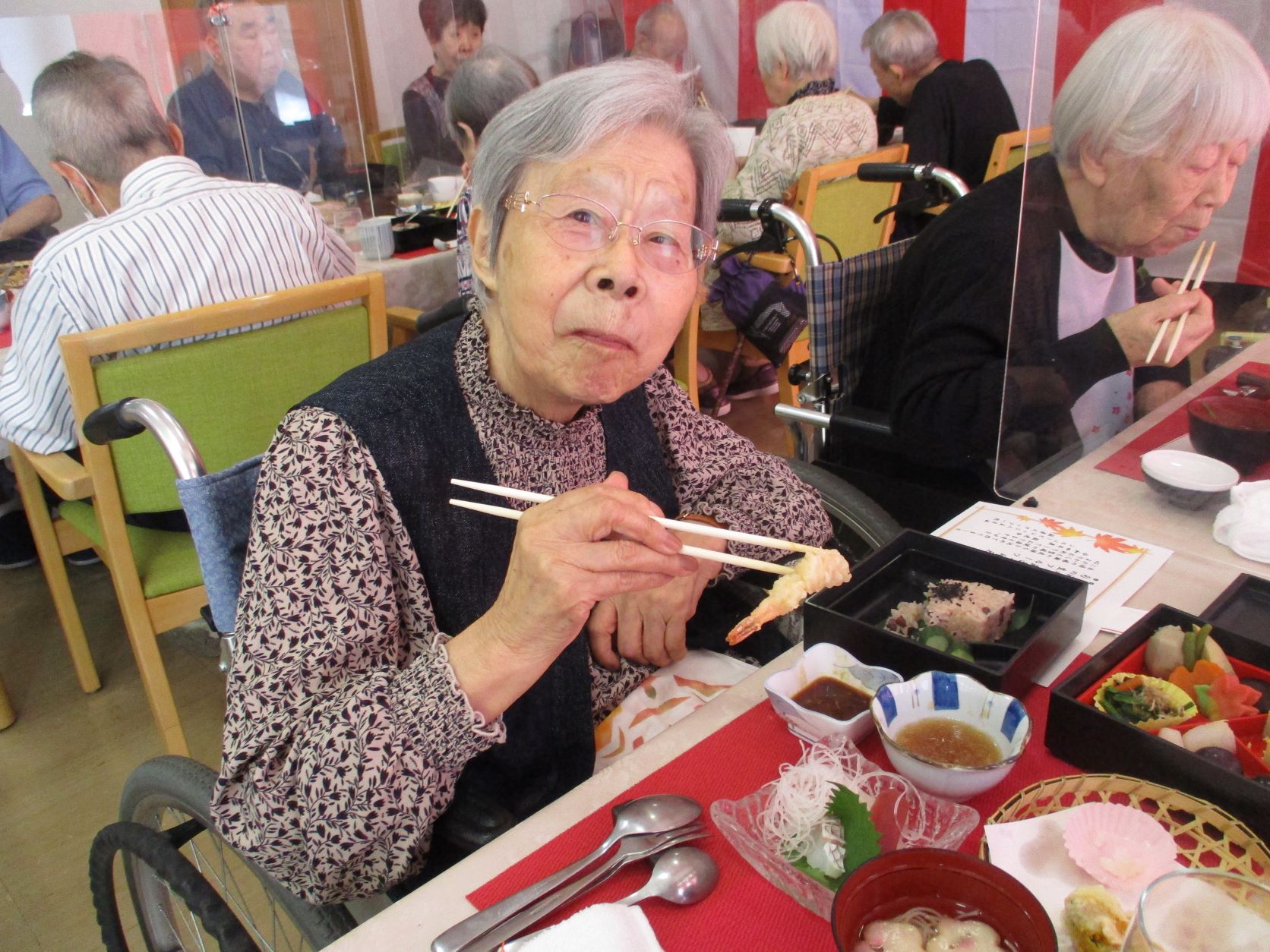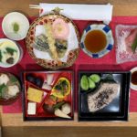 お食事はお赤飯、煮物やてんぷら、お刺身など豪華なメニュー