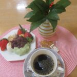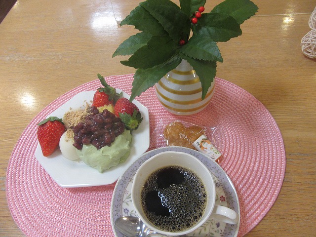きな粉をトッピングした和風のおやつをお召し上がりいただきました。