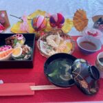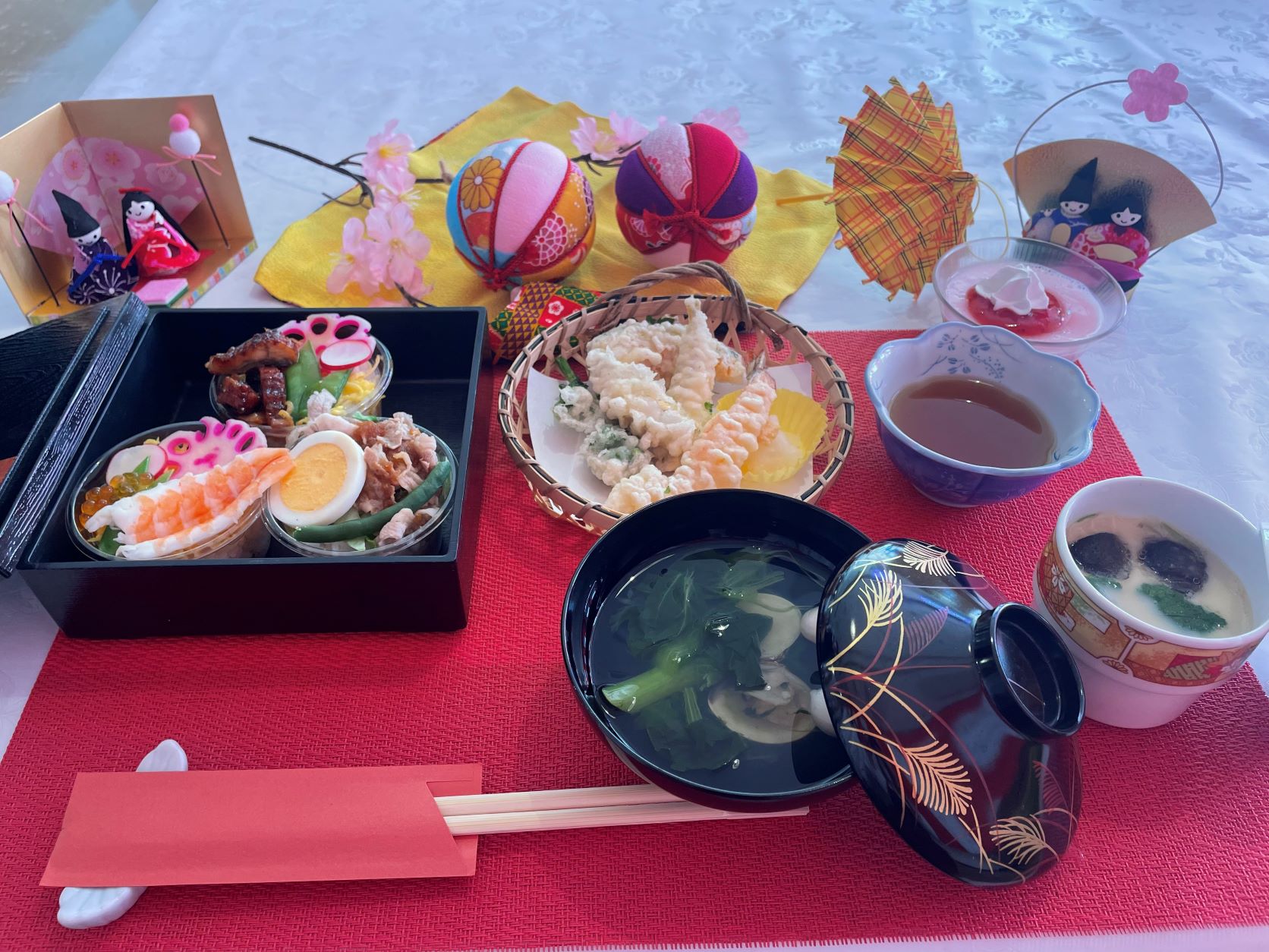 メニューは「3種のカップちらし寿司」「はまぐりの御吸物」「若鷺と菜の花の天ぷら盛り」「具材たっぷり茶碗蒸し」