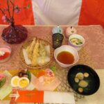 天ぷら盛り合わせ、茶碗蒸し、蛤のお吸い物、2色ムースです。