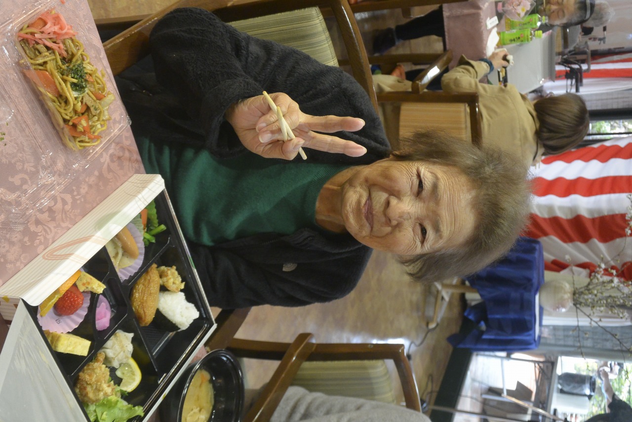 唐揚げ、卵焼き、焼売、ウインナー、小松菜の和物、おにぎり、デザート(^^)