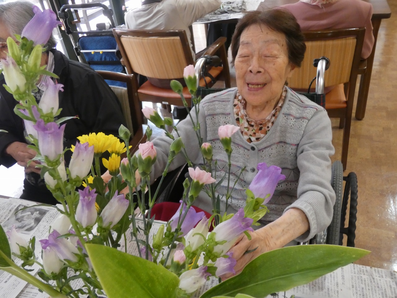カンパニュラ(紫)、スプレー菊(黄)、ドラセナ、