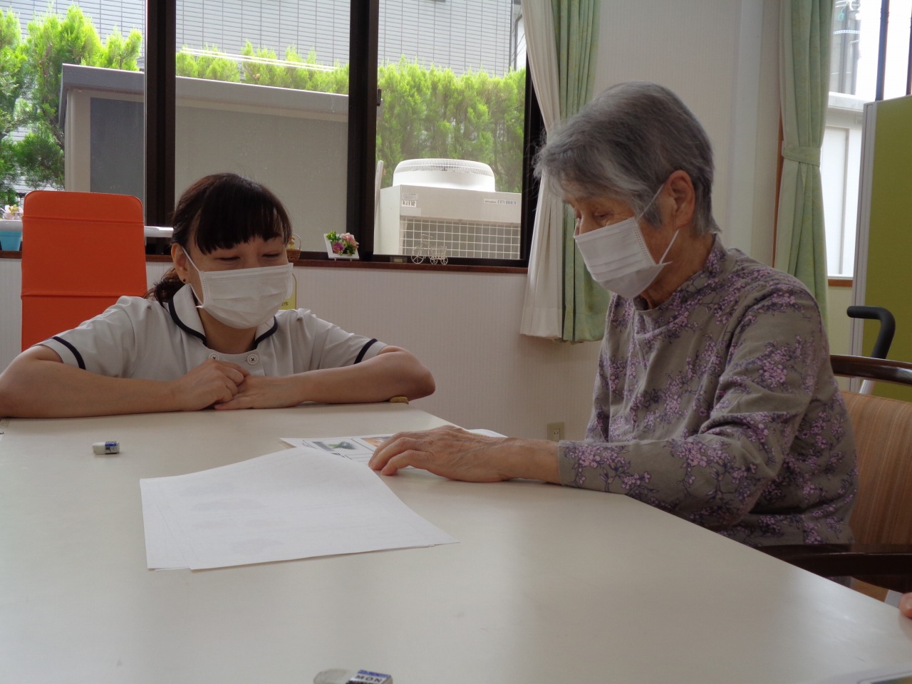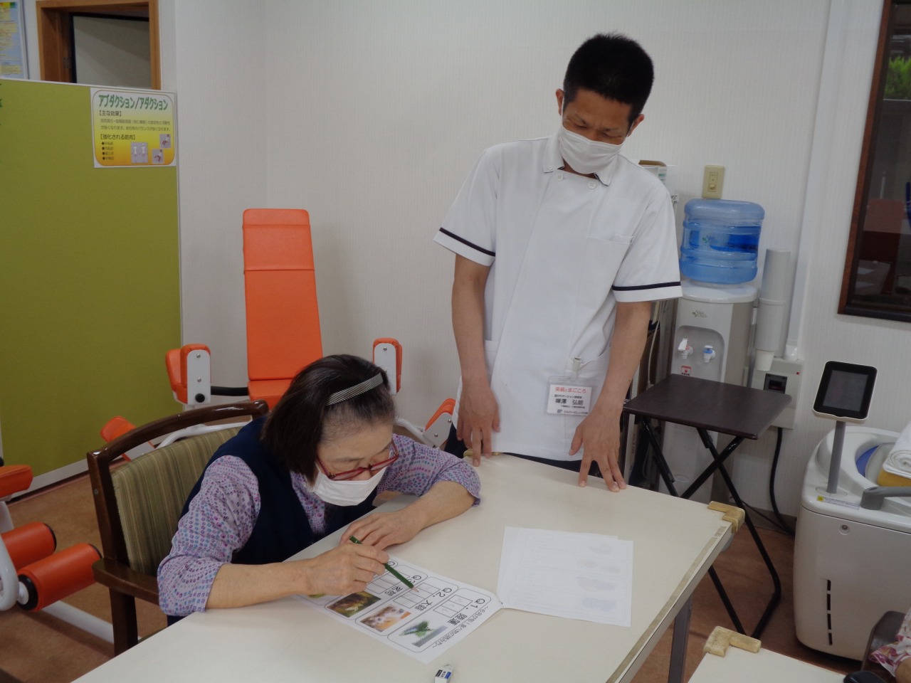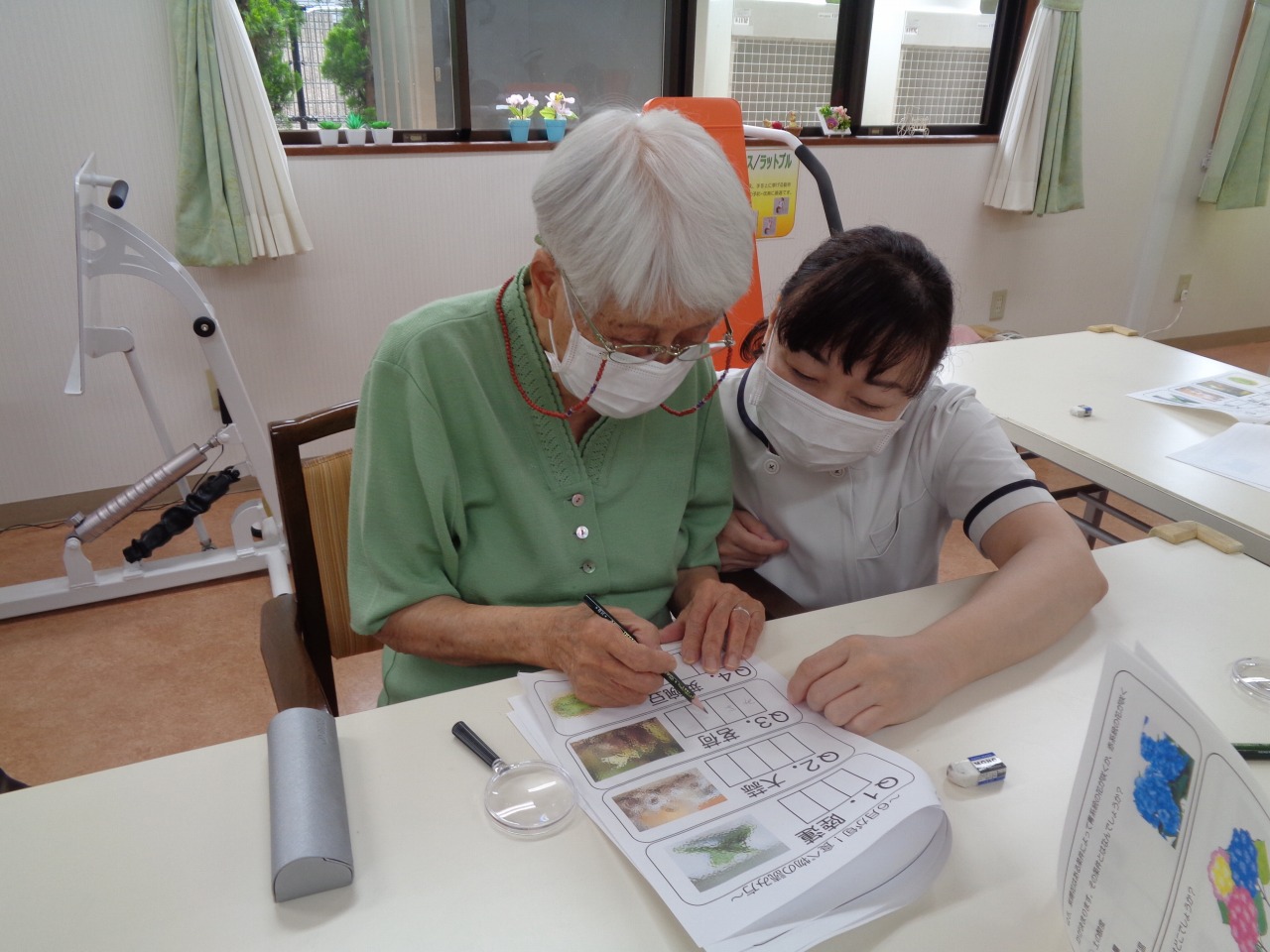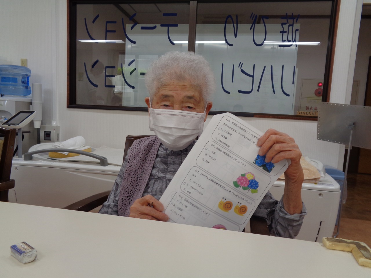 本日は日野リハビリ室にて学習クラブを開催しました。6月、梅雨真最中という事で、梅雨や季節の花に関する問題と、お野菜の読み方クイズをご用意しました。今回は真剣に考えるあまり、閃いた答えを叫んでしまう方や、「これは分かるわ!」と自信満々な方もいて、皆様のお陰で、和やかな笑顔溢れるクラブ活動になりました。ちなみに、『ばいう(つゆ)』を梅雨と書くようになったのは、6月が梅の収穫時期だからだそうです!勉強になりました。