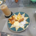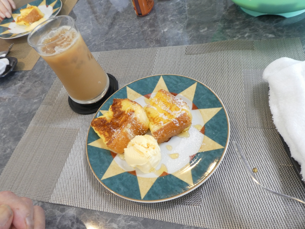 焼きあがったフレンチトーストに、バニラアイス、粉砂糖、