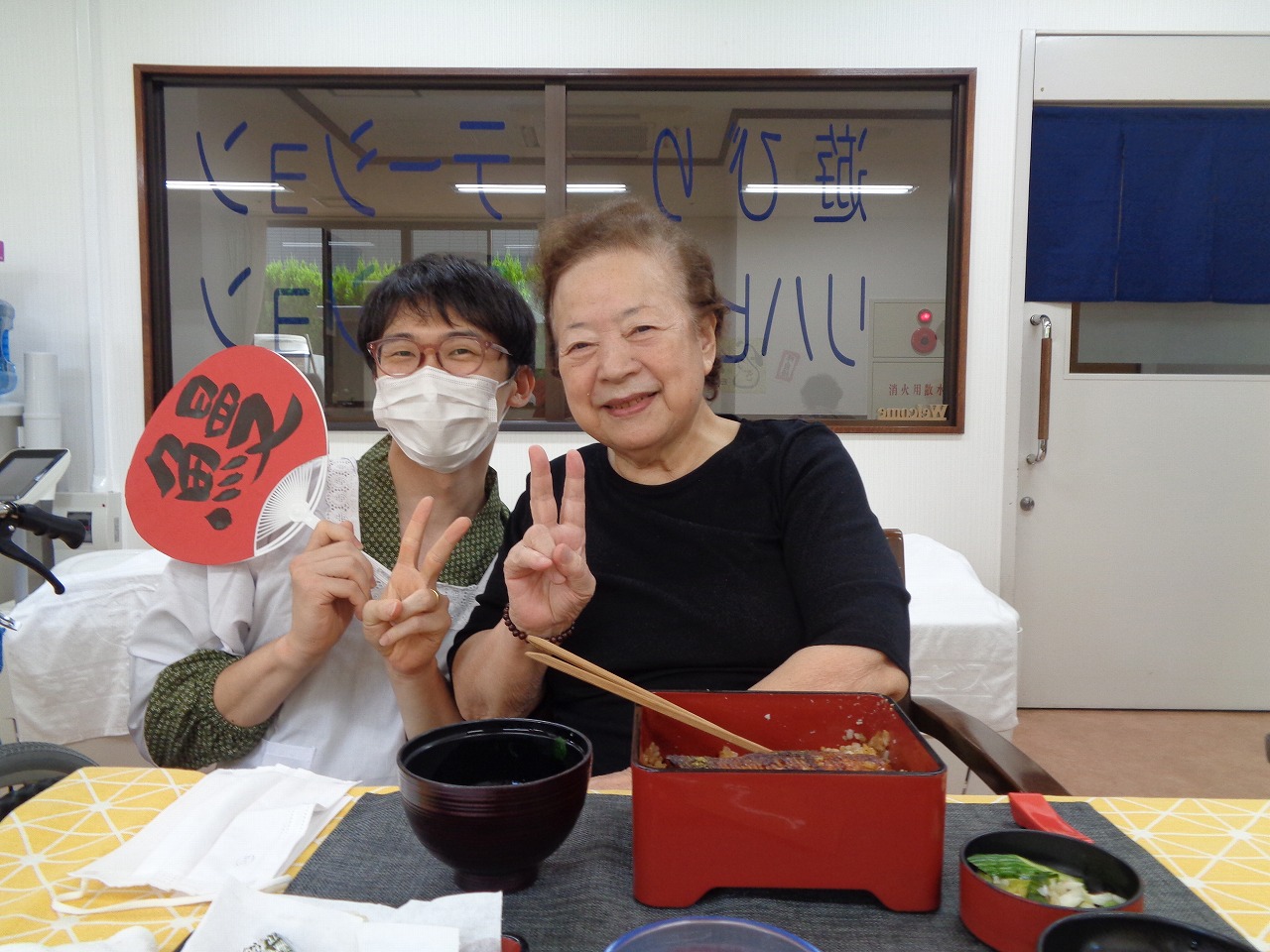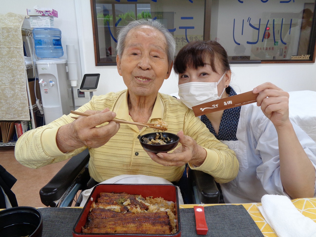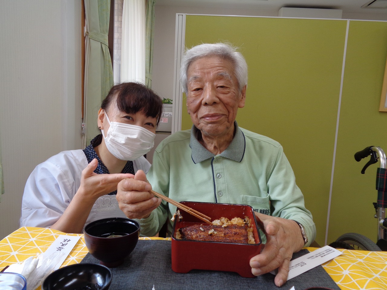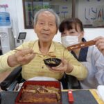 本日は日野リハビリ室にて昼食会を開催しました。今回は、夏を元気に乗り越えましょう!ということで『うなぎ高瀬』のうな重と肝吸いを召し上がっていただきました。日野周辺では有名なお店ということで、ご存知の方も多かったです。久しぶりにうなぎを召し上がるという方がほとんどで、「昔九州で食べたうな重にそっくりだよ」「とってもおいしい!」と笑顔で太鼓判をいただき、大好評でした。