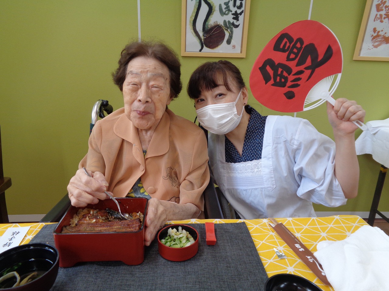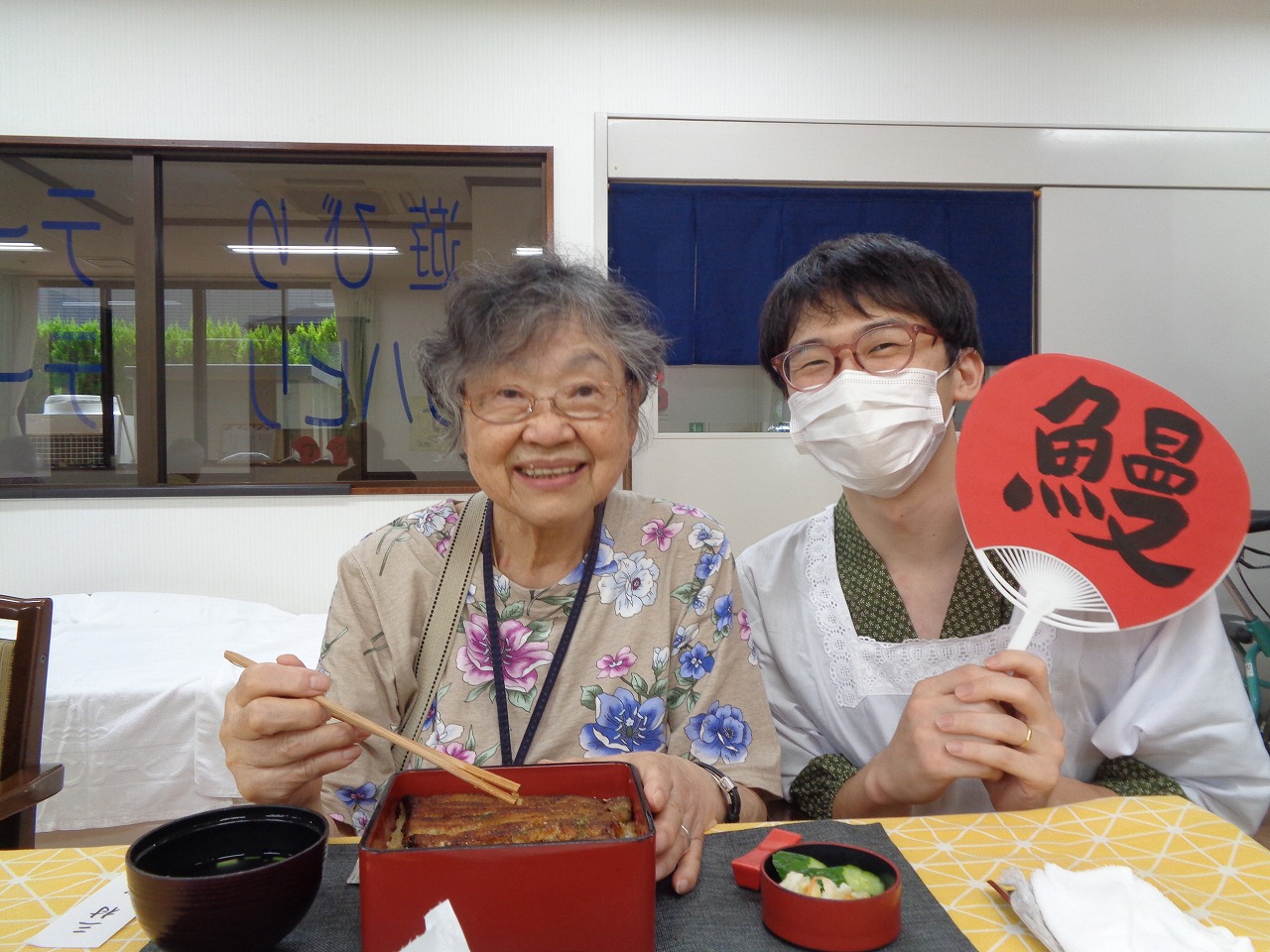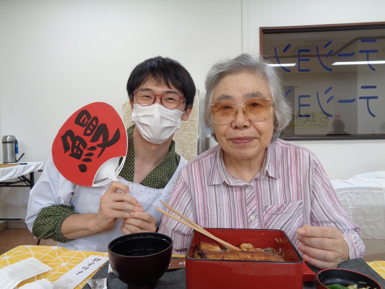 本日は日野リハビリ室にて昼食会を開催しました。今回は、夏を元気に乗り越えましょう!ということで『うなぎ高瀬』のうな重と肝吸いを召し上がっていただきました。日野周辺では有名なお店ということで、ご存知の方も多かったです。久しぶりにうなぎを召し上がるという方がほとんどで、「昔九州で食べたうな重にそっくりだよ」「とってもおいしい!」と笑顔で太鼓判をいただき、大好評でした。