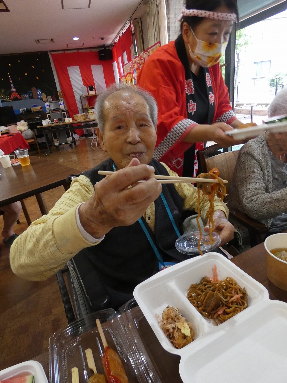 昼食には、焼きそば、たこ焼き、焼き鳥、豚汁、いなりずし、