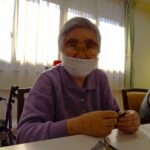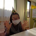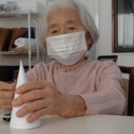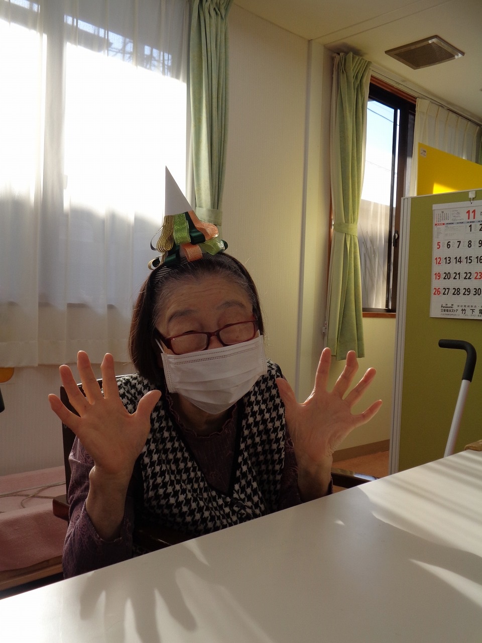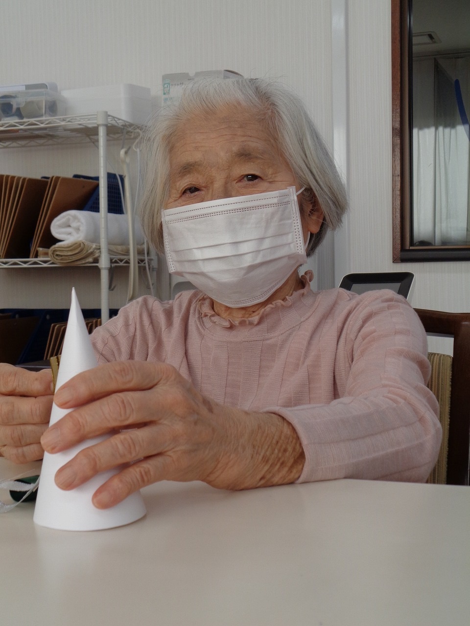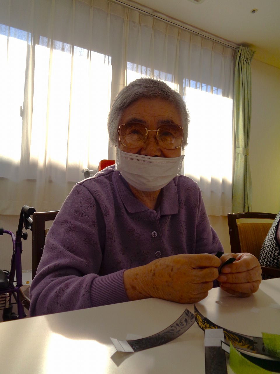 11月8日(水)、様々な柄や色のリボンを使ってクリスマスツリーを作りました。台紙に両面テープを使って貼りますが、なかなか難しく…。