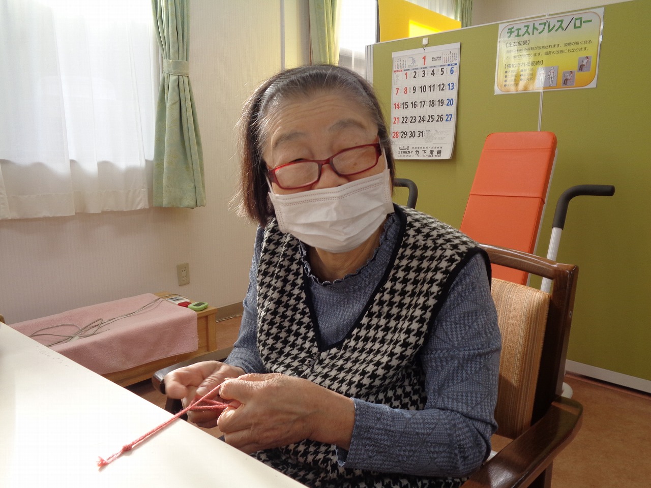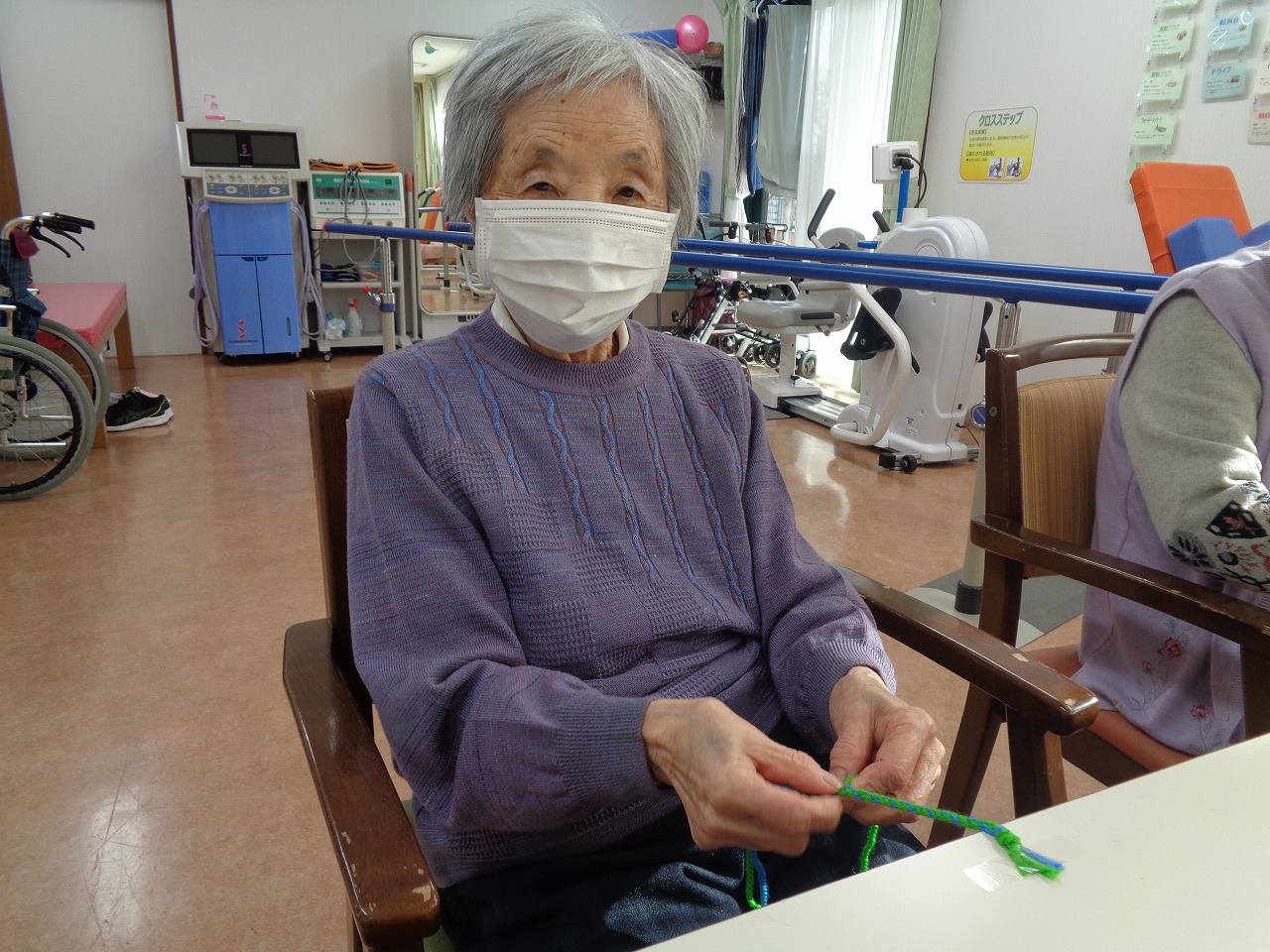 1月10日(水)本日の手作りクラブは「毛糸の三つ編み」を行ないました♪30センチ程の長さの毛糸を三つ編みにする作業ですが、皆様すいすい編んでくださいました。「もう何十年振りにやるけど、覚えてるもんだね」「昔、娘の髪を三つ編みにしてあげてたよ」等々、思い出を振り返りながら編んでくださいました。編み終わった物は丸めてキーホルダーに。「孫が来た時にあげるわね」と喜んでくださいました♬