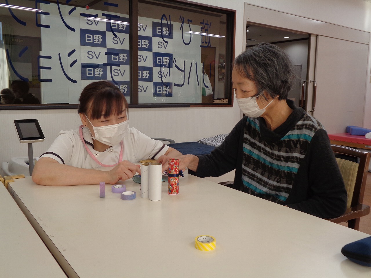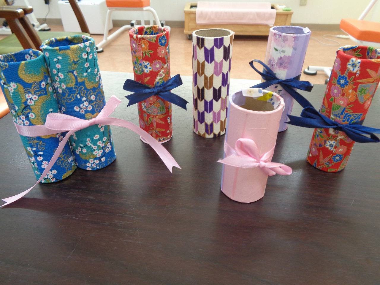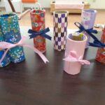 1月31日(水)本日の手作りクラブは「鉛筆立て」を作ります♪ラップの芯を切って色んな長さの筒を作ります。芯にマスキングテープを貼って色とりどりのデザインを施します。底は牛乳パックを切って貼り付けました。手作り感溢れる鉛筆立ての完成です!