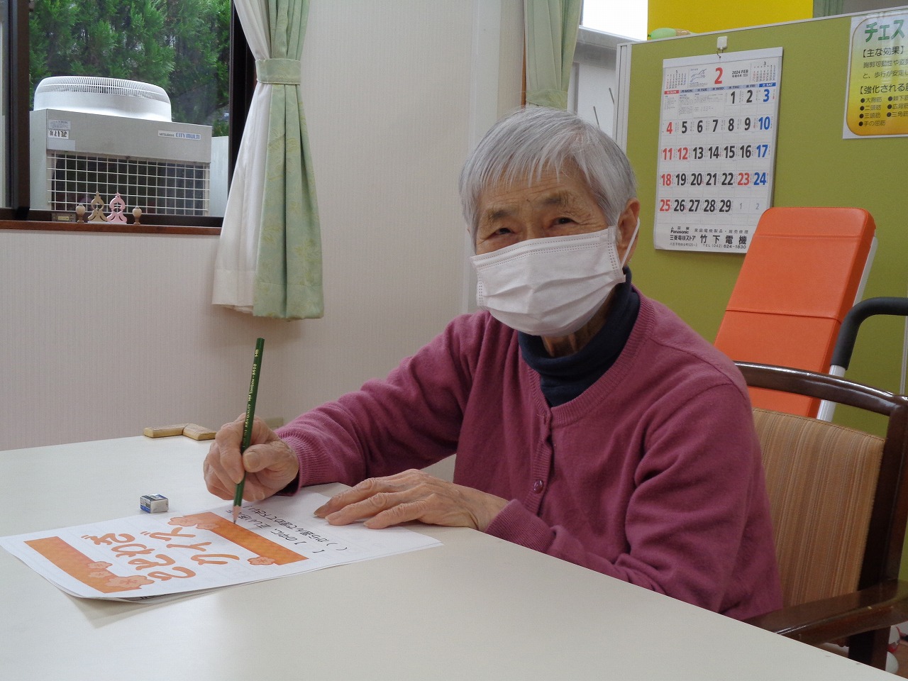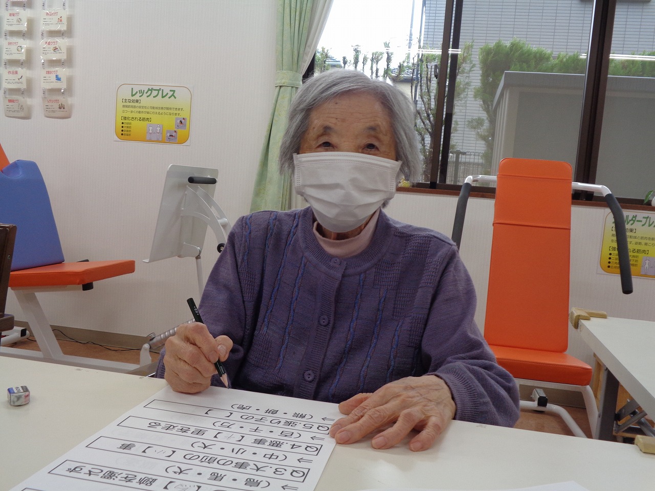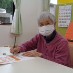 本日は日野リハビリ室にて学習クラブを開催し、ことわざ穴埋めクイズにチャレンジしていただきました。『張り子の【 】』、『【 】は口に苦し』、この空欄に入るのは何でしょう?という様なクイズです。スラスラと埋めていく方もいれば、一問一問を慎重に考えて下さる方もいて、皆様の個性が光っていました。答え合わせの際には、「あらぁ、間違っちゃたよ!」「これは知っていたのよ」と、正解・不正解関係なく笑い声が聞こえ、とても賑やかでした。