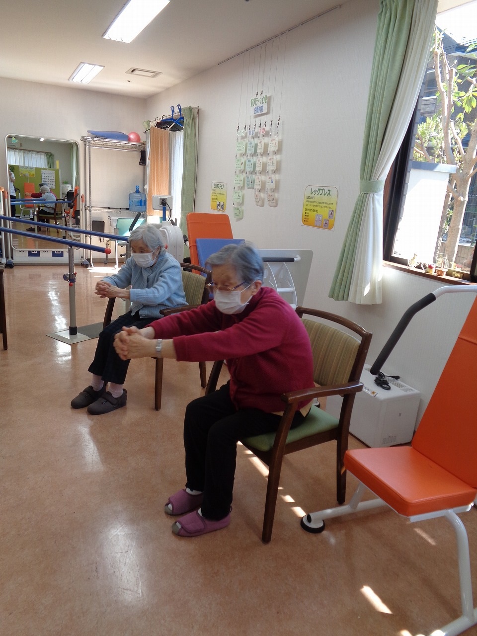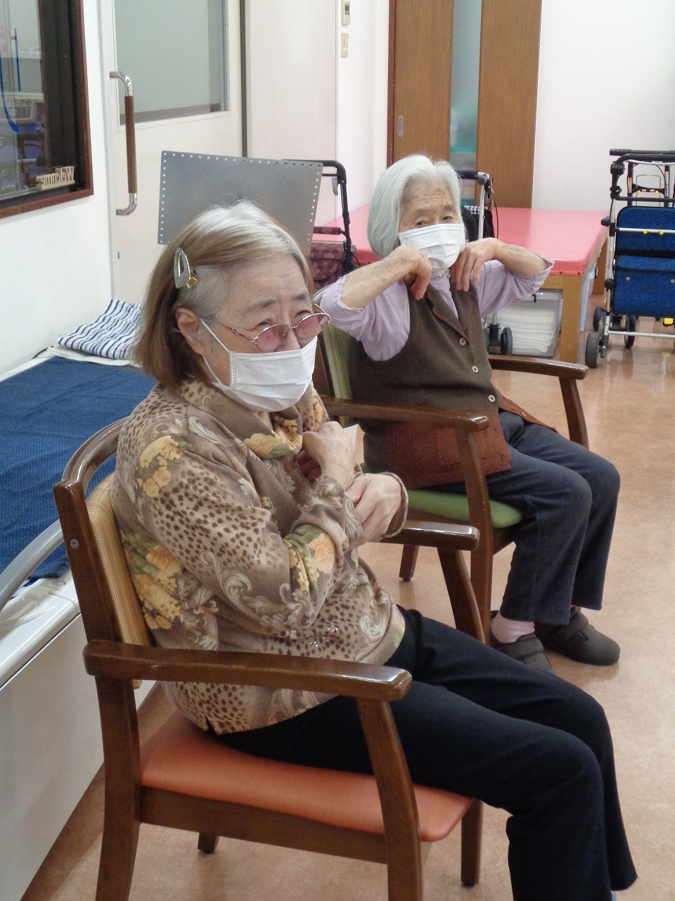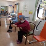 本日はリハビリ室にて運動クラブを開催しました。今回はゆっくりと、お身体を動かしていただこう、という事で、特別な道具は使用せずに、椅子に座ってできる全身の体操を行いました。首や肩、手首から指先の上半身と、股関節、膝、足首までの下半身をできる限り大きく動かしていただきました。