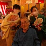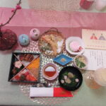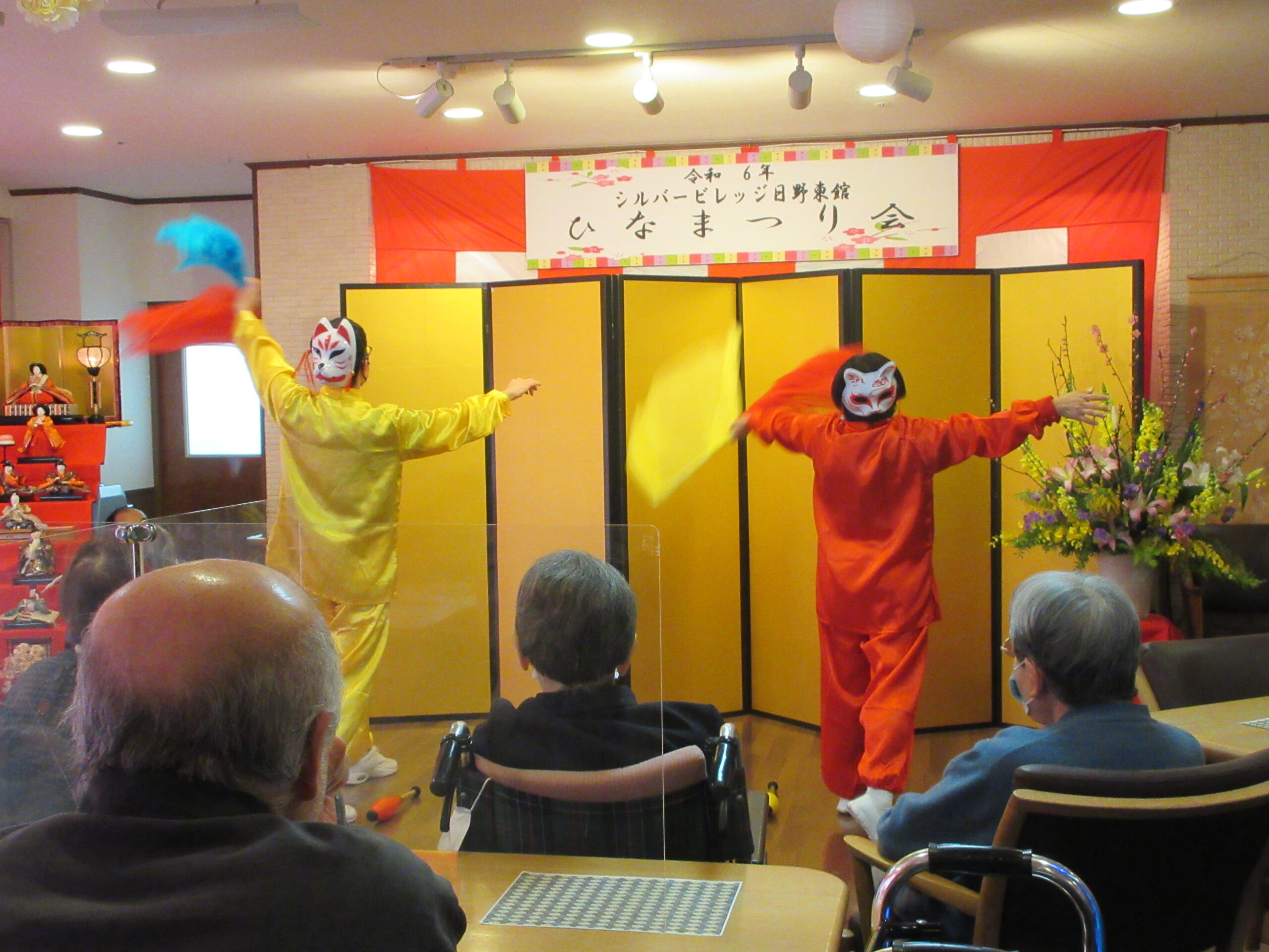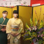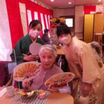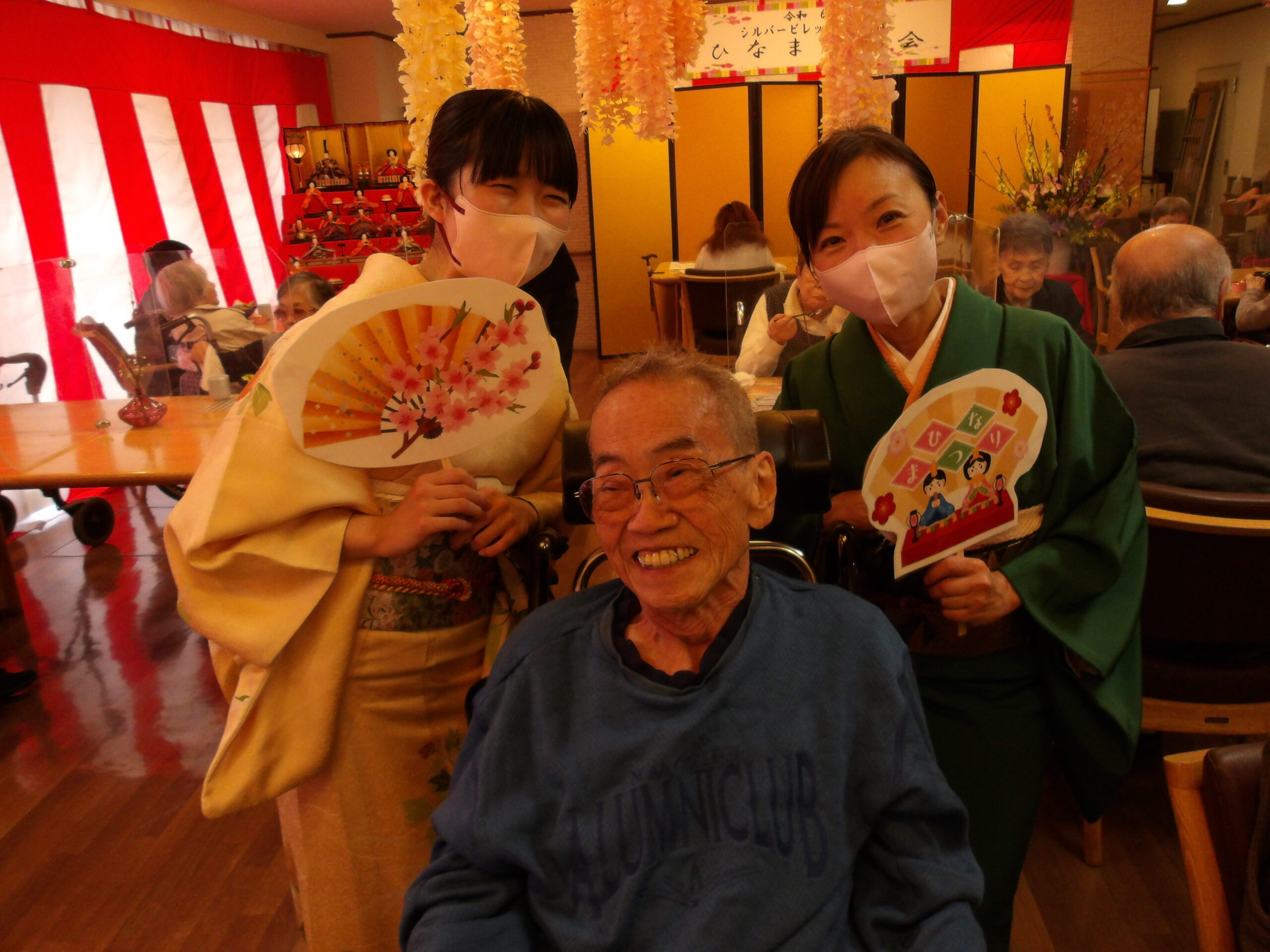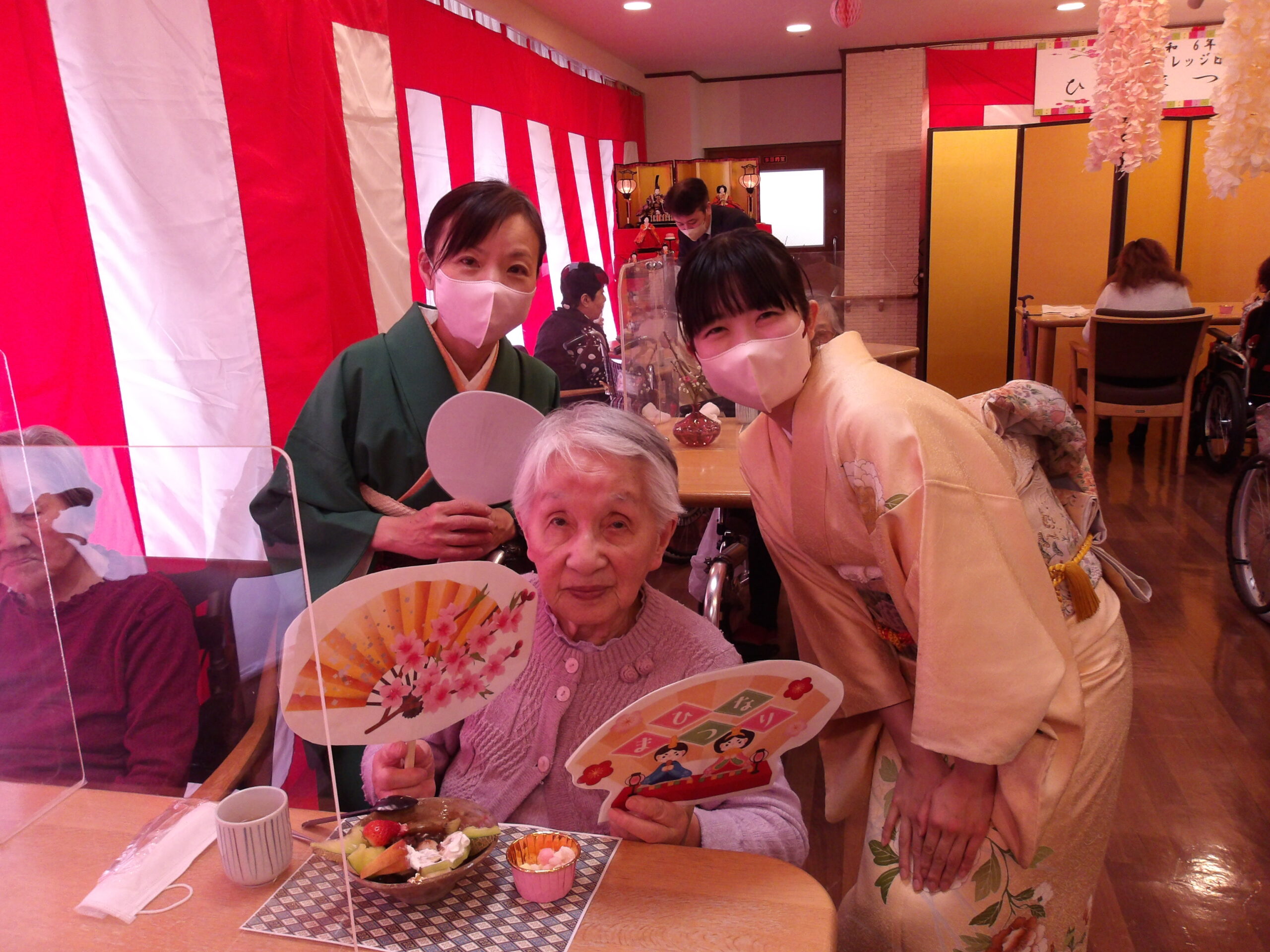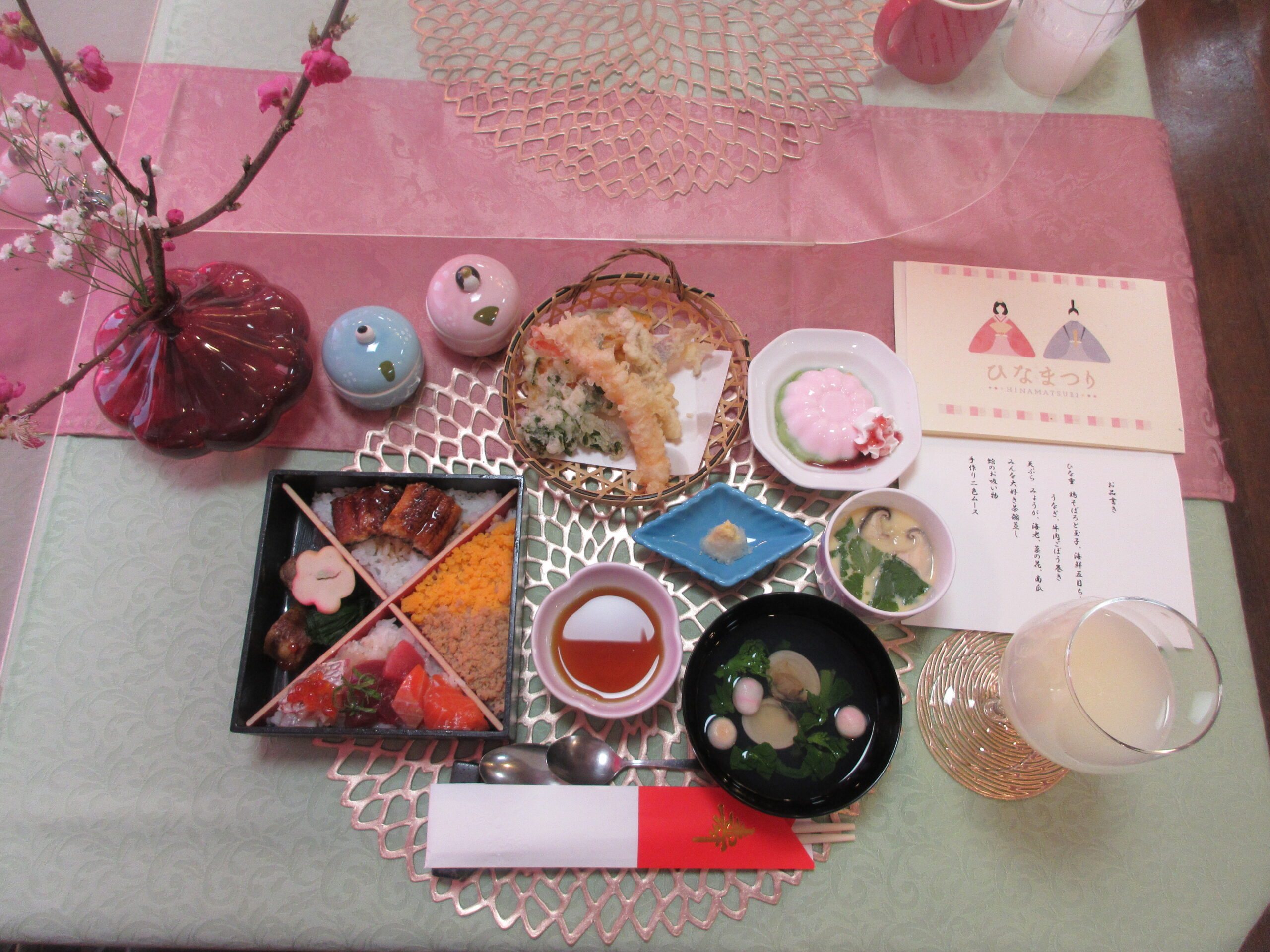 1階ホールは一足早い春をイメージした装飾、着物姿の職員が華を添えます。 昼食は、彩豊かな「海鮮ちらし、鶏そぼろと玉子、うなぎの三色ひな重」と