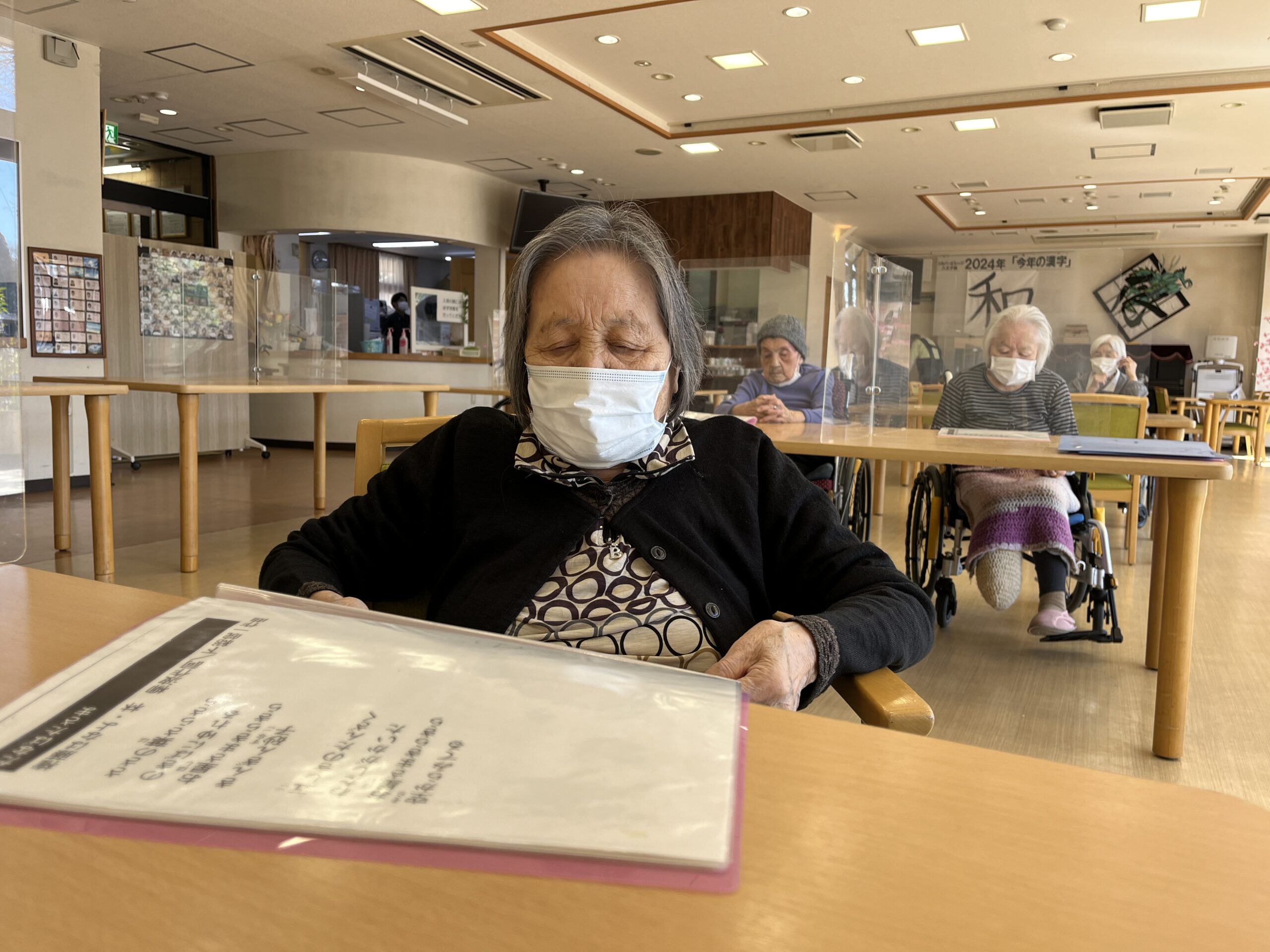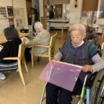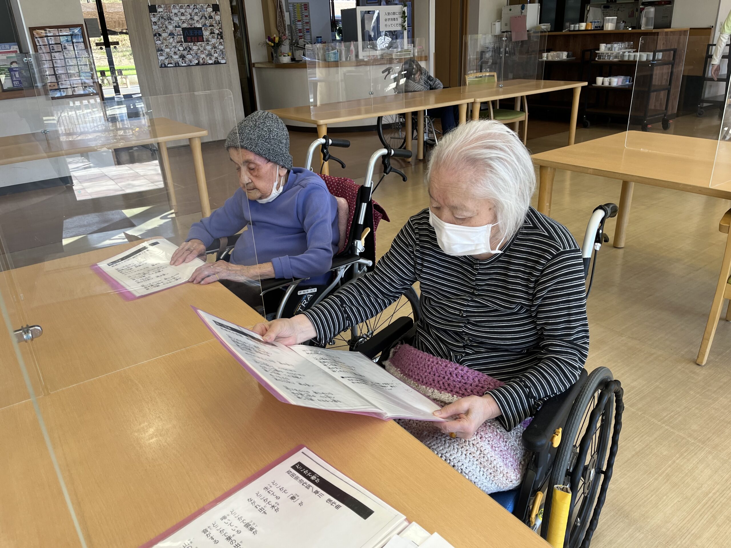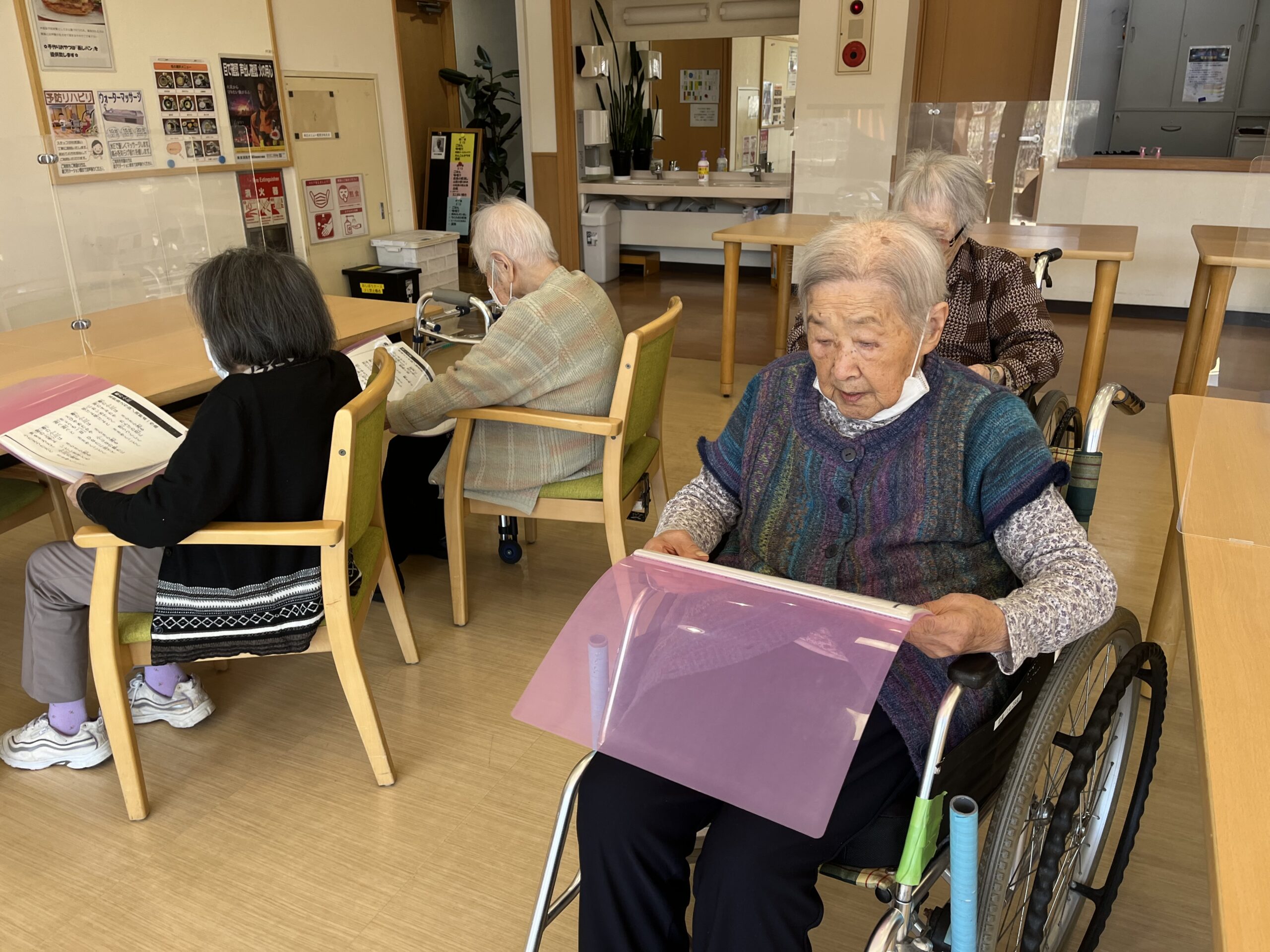 カラオケの機械で音楽をかけ、皆様には歌詞カードを見ていただき、四季折々の曲を歌います♪
