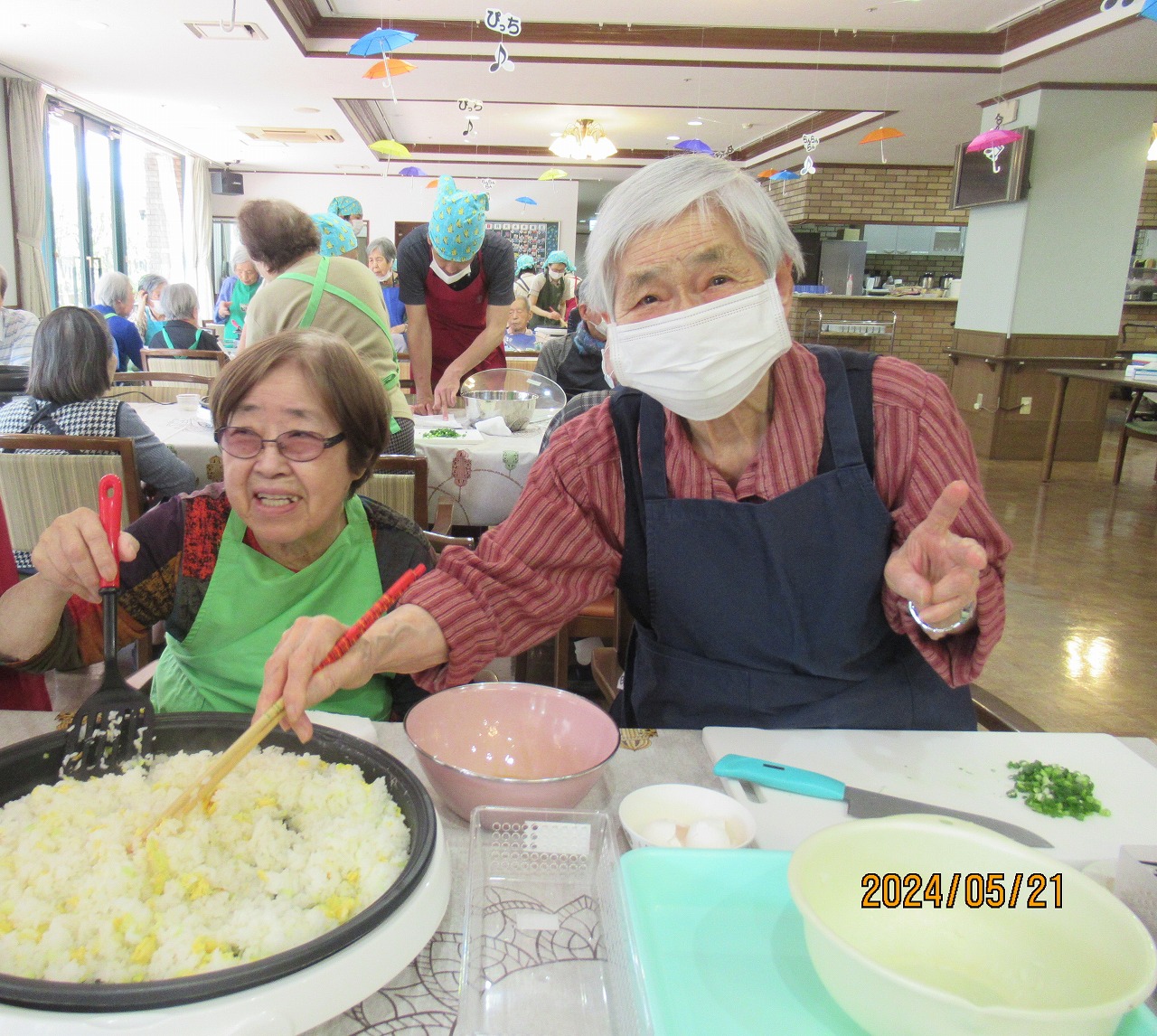 レシピをのぞき込み、卵を炒めご飯を投入!