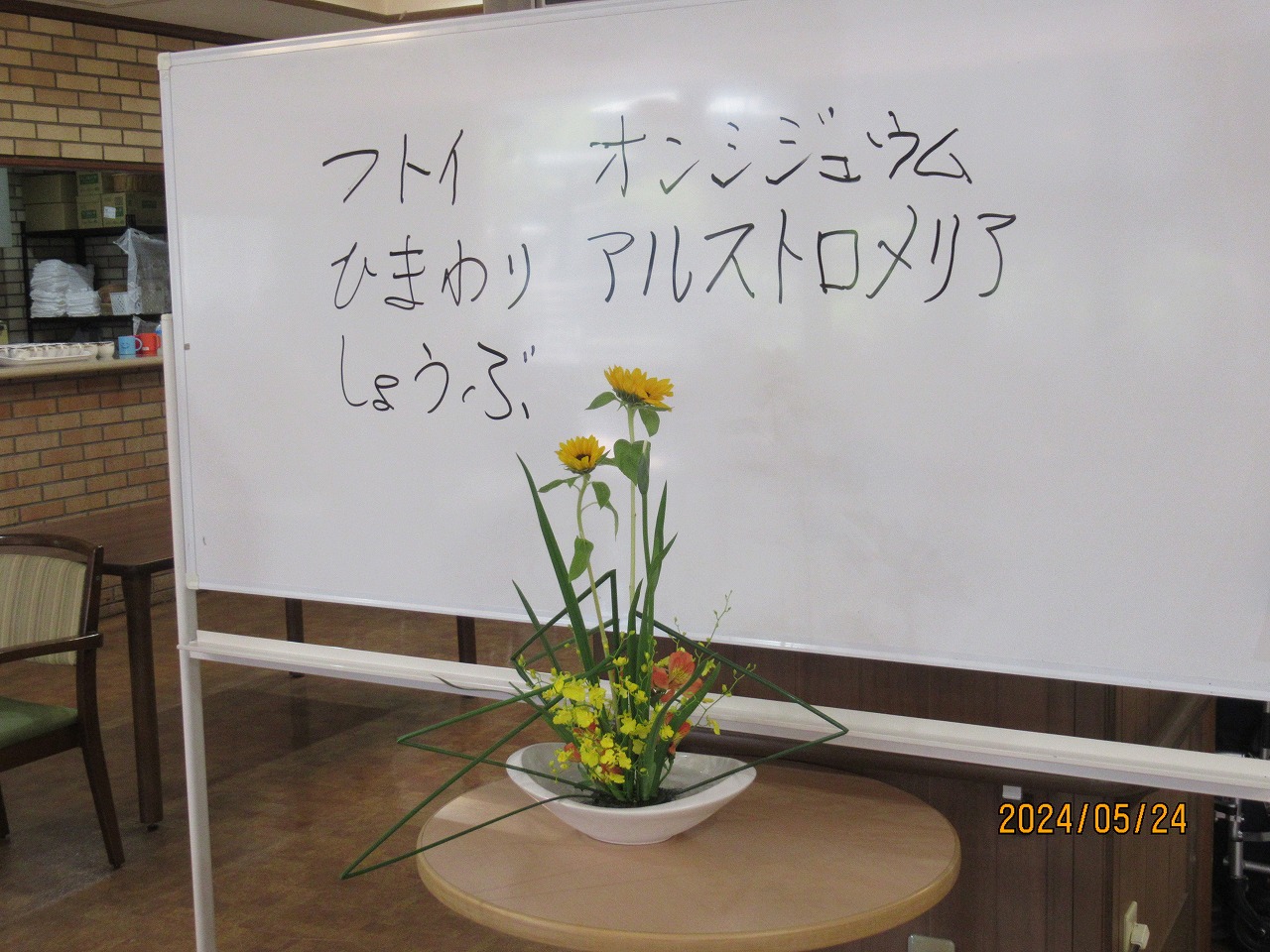 菖蒲(白)、ひまわり(黄)、フトイ(緑)