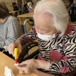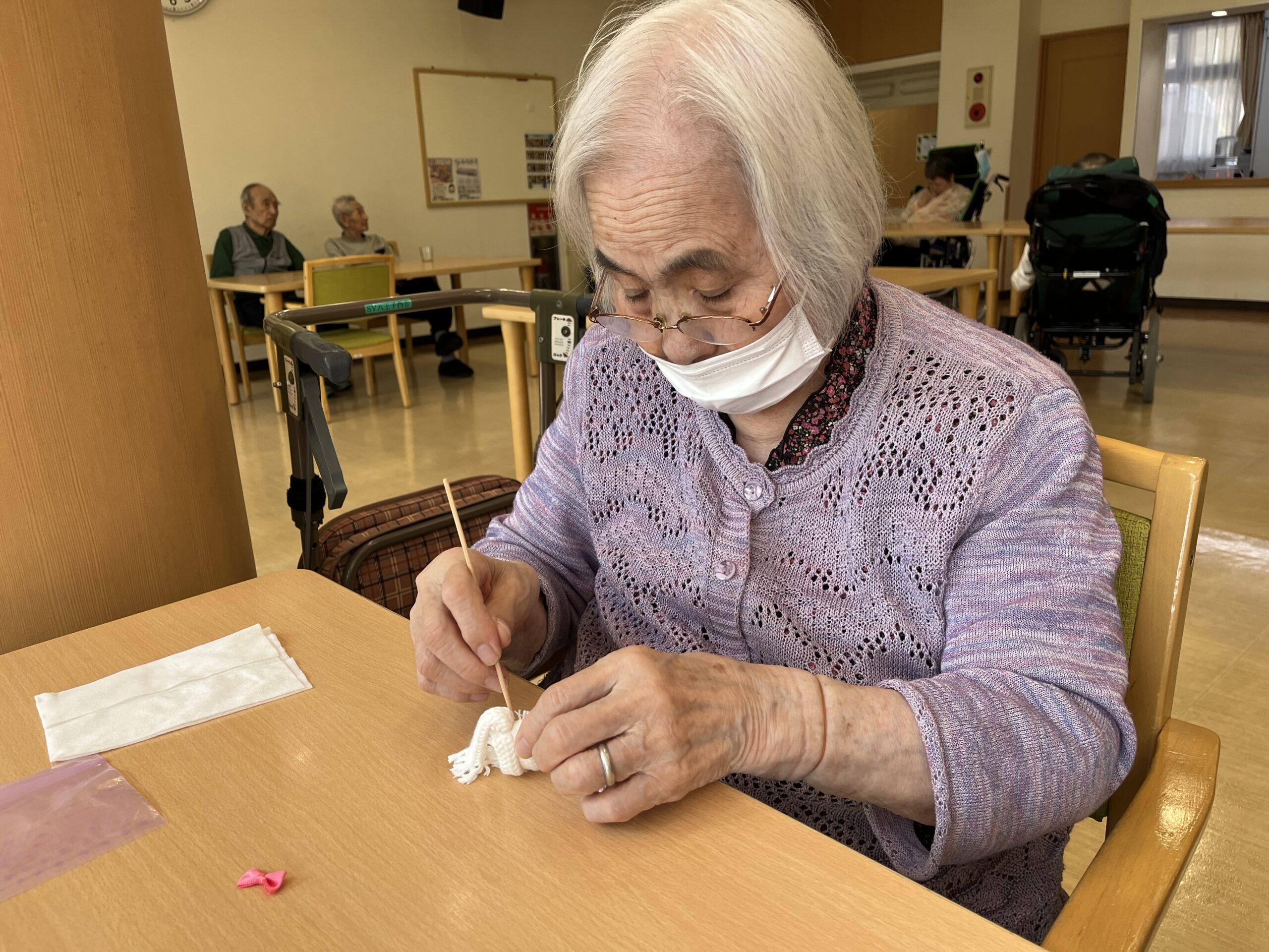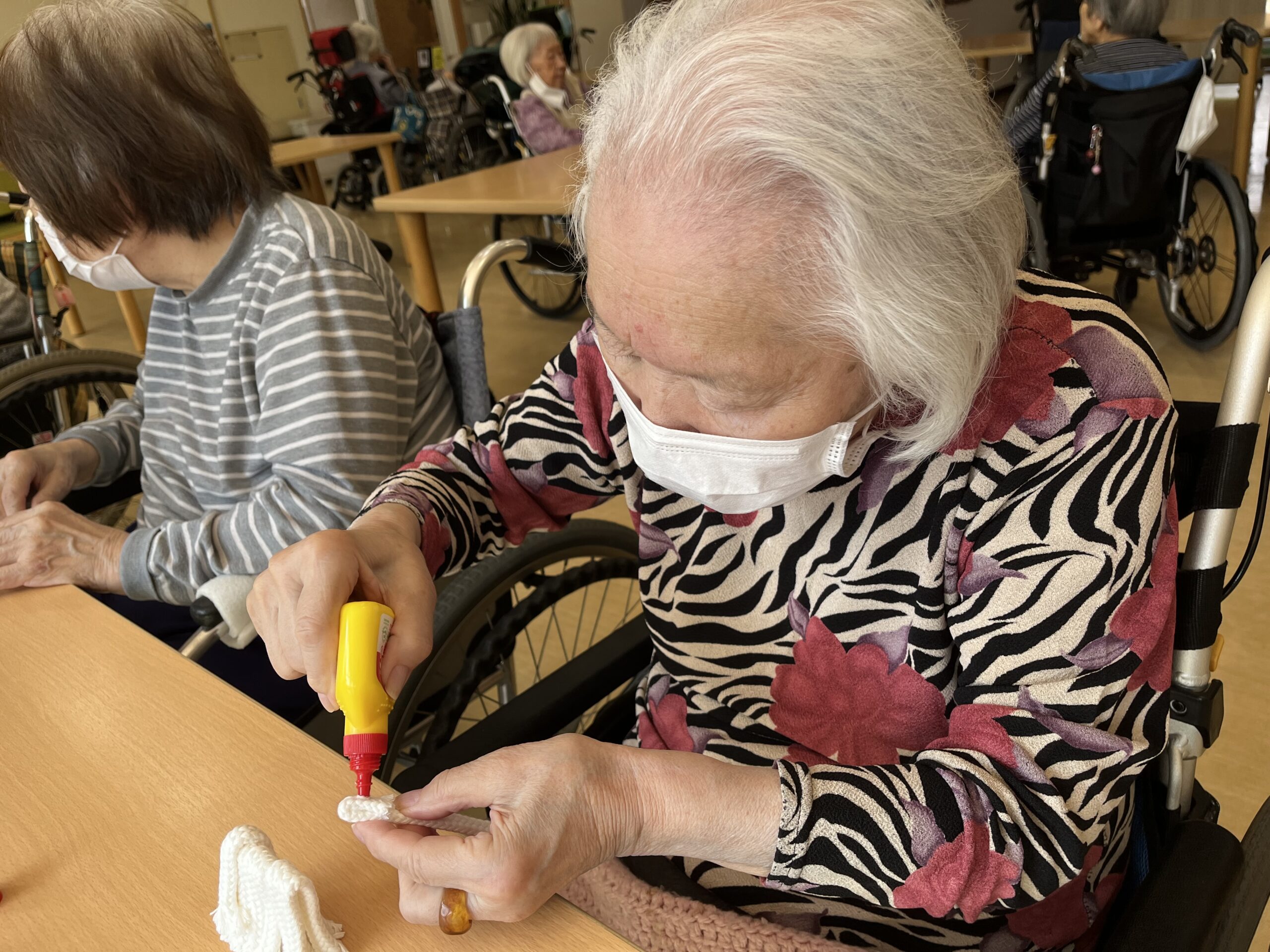 ビーズで目や鼻を貼り、最後にリボンを乗せます♡