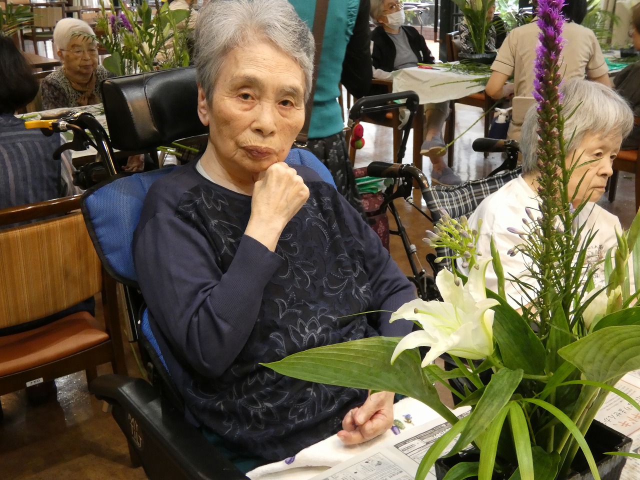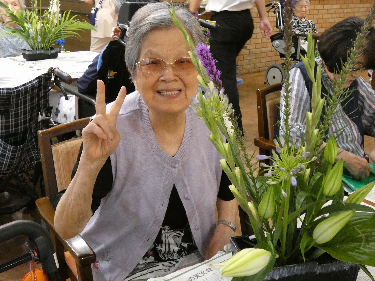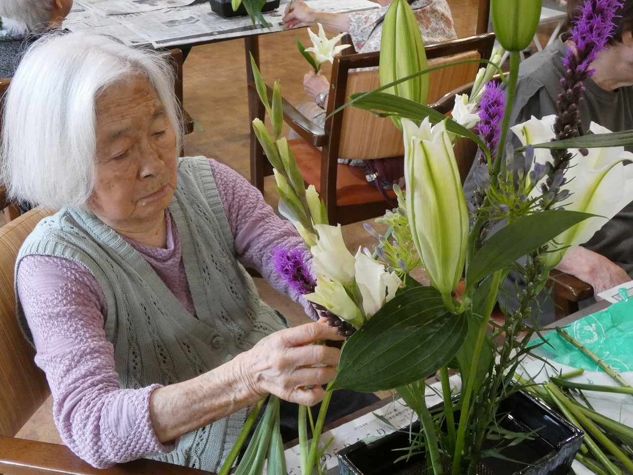 ユリ(白) リアトリス(紫) アレカ(緑)