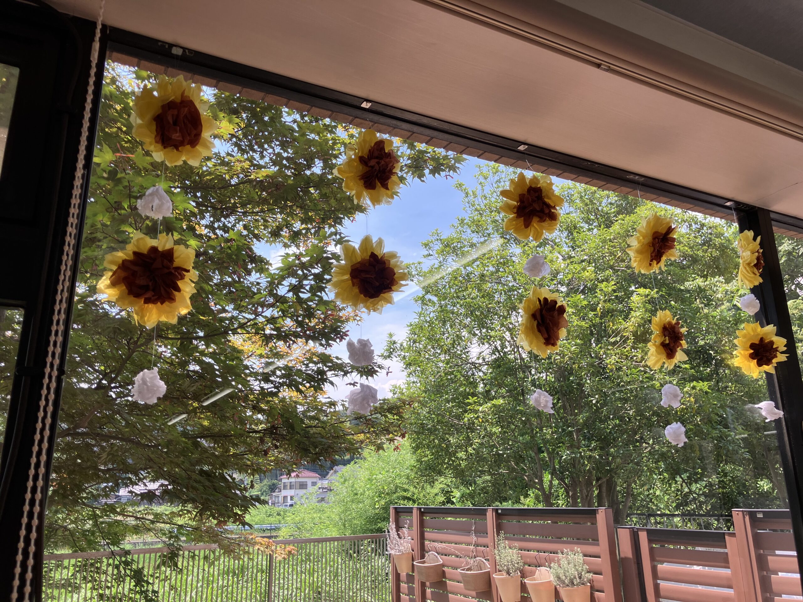 ヒマワリを吊るしてから「夏らしくていいねー!」とリハビリ室を覗いて下さる方も増えました♡♡