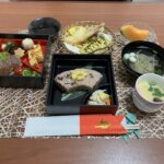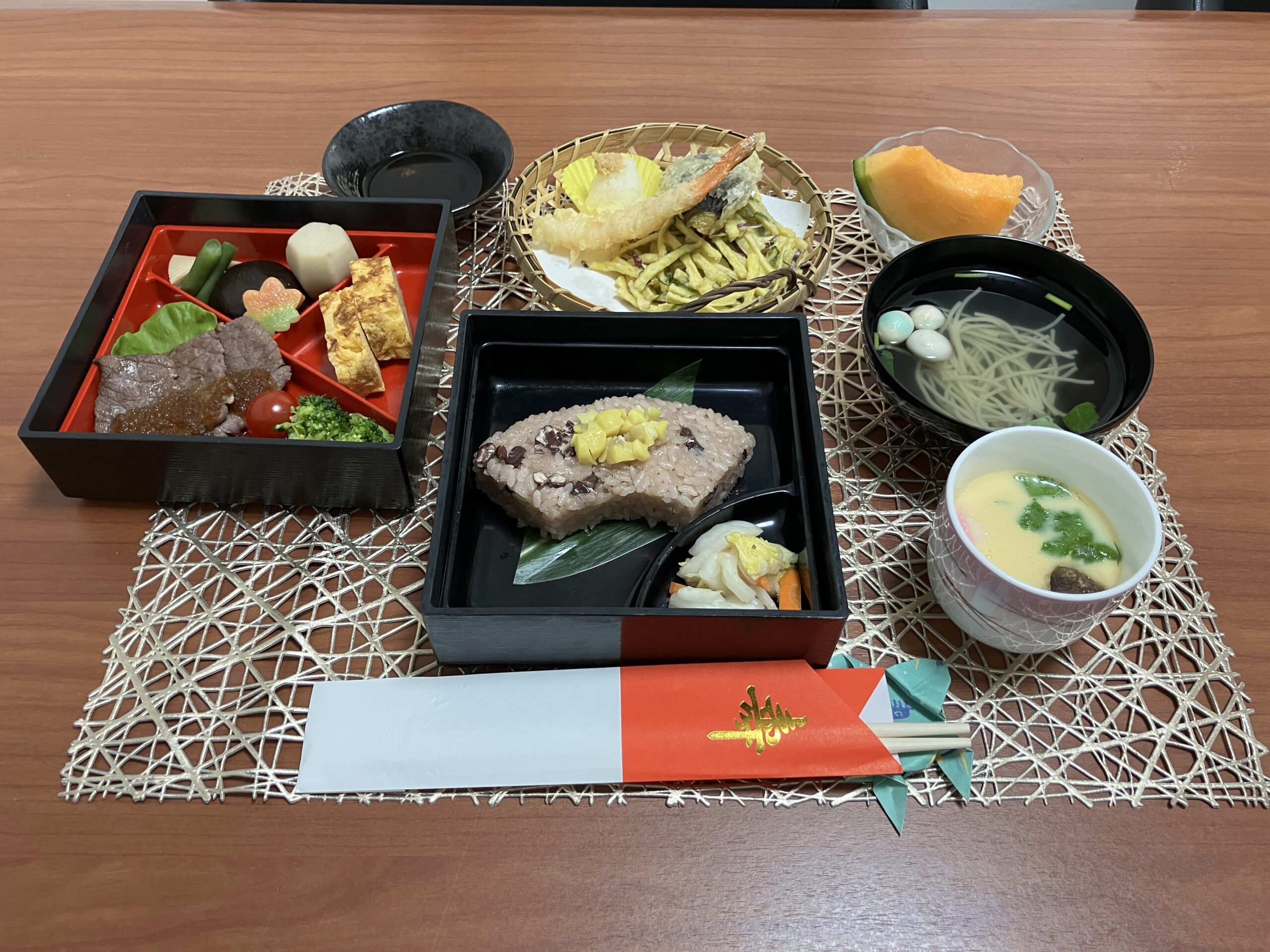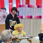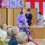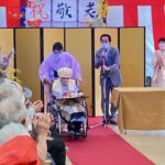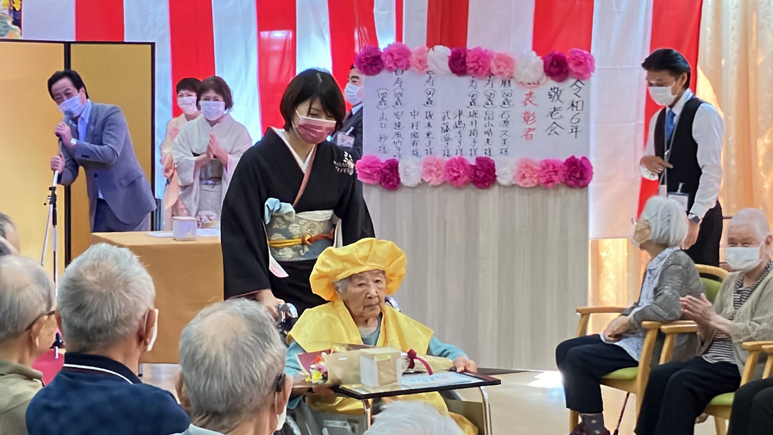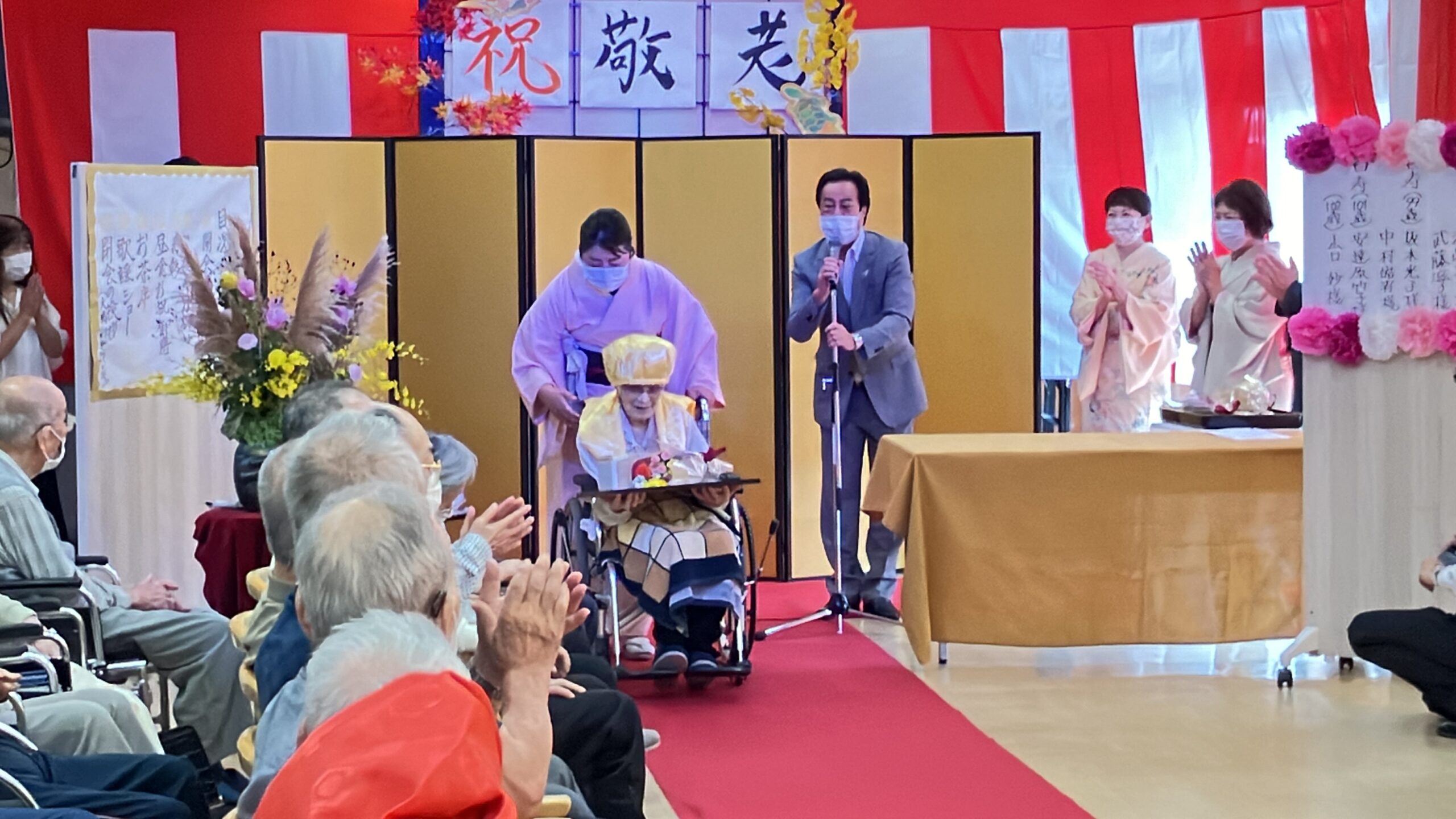 午前中は長寿のお祝いを行いました。今年対象のご入居者の表彰式がありました。おやつは三福団子を屋台で焼き