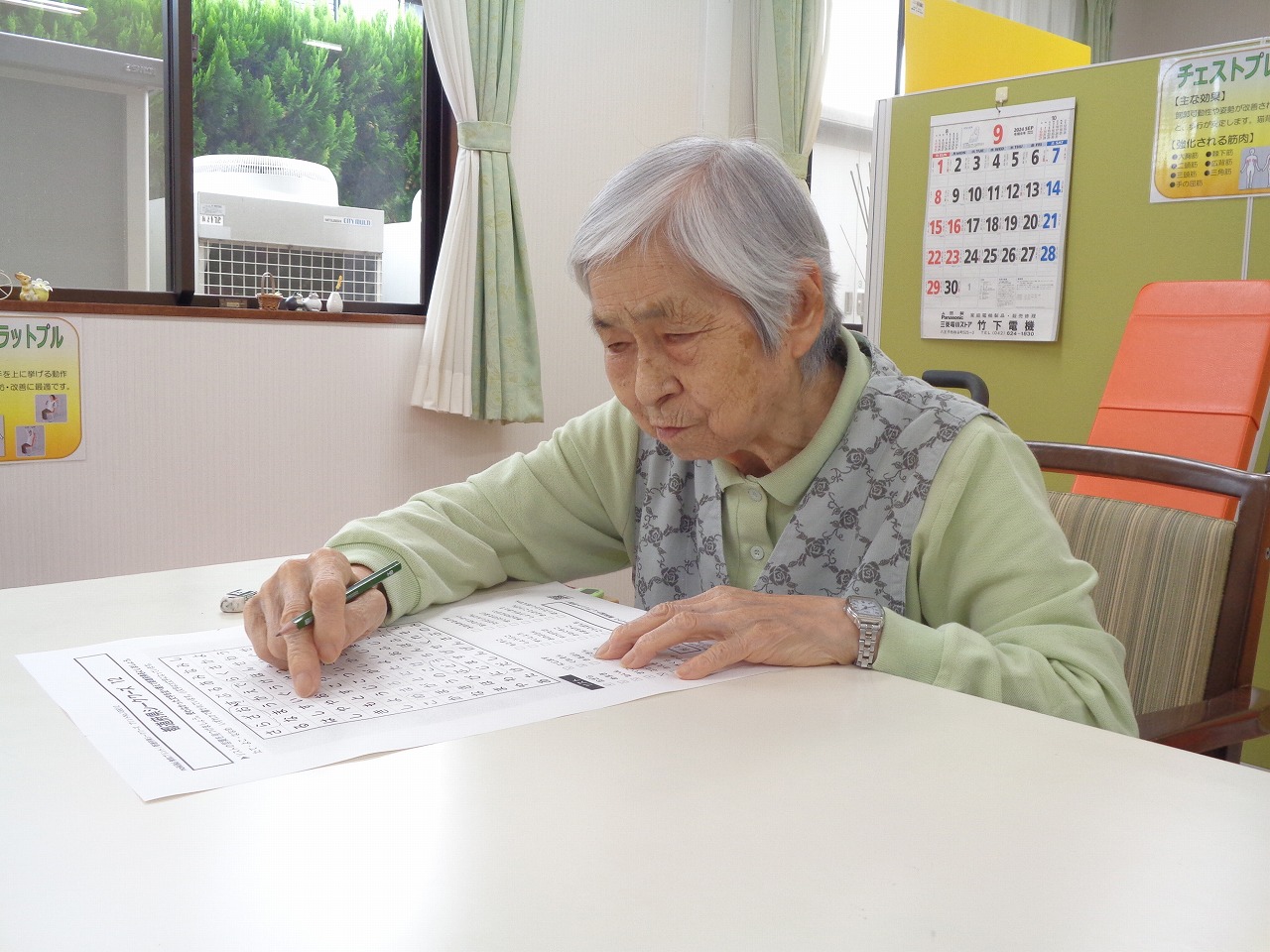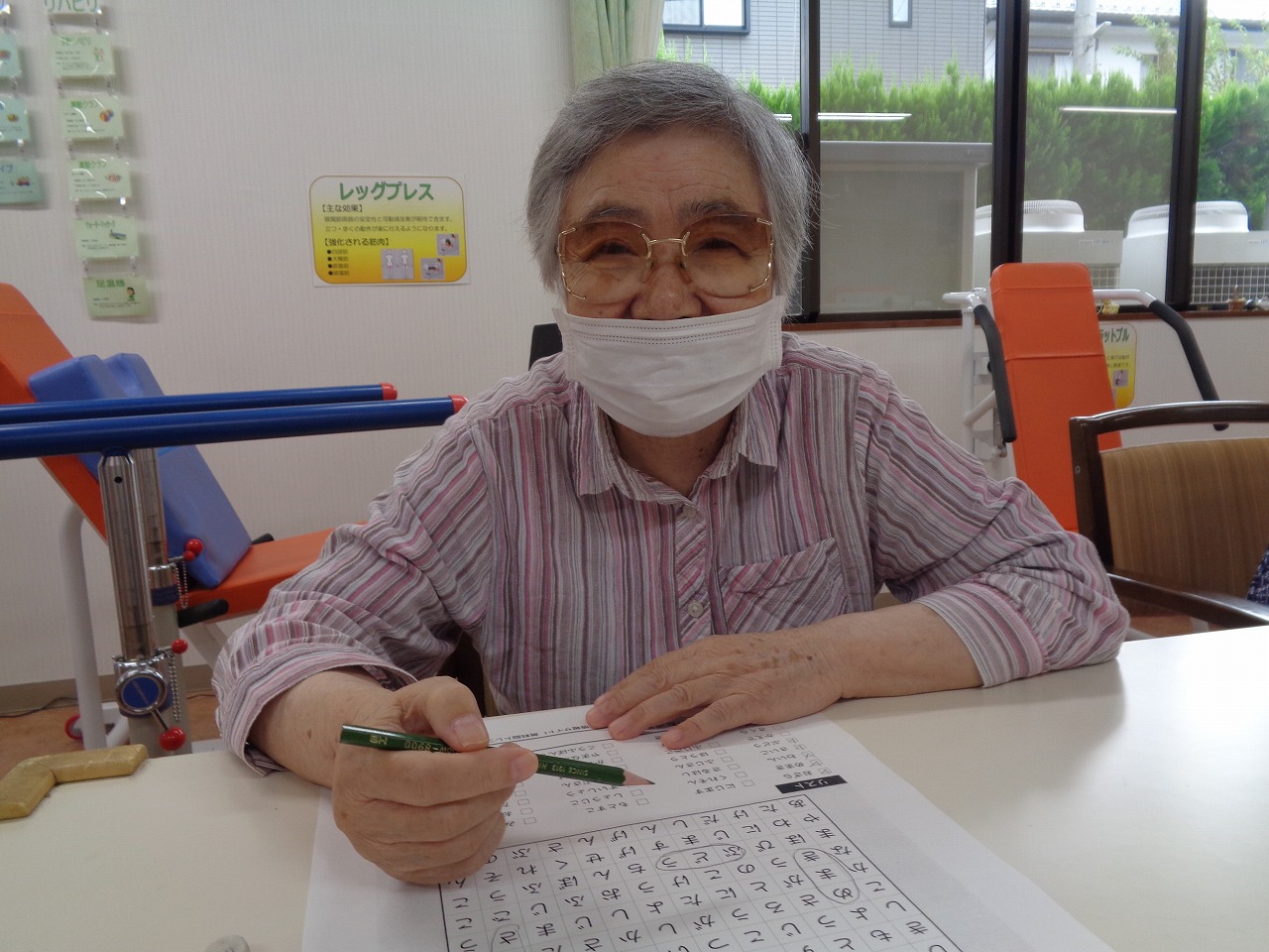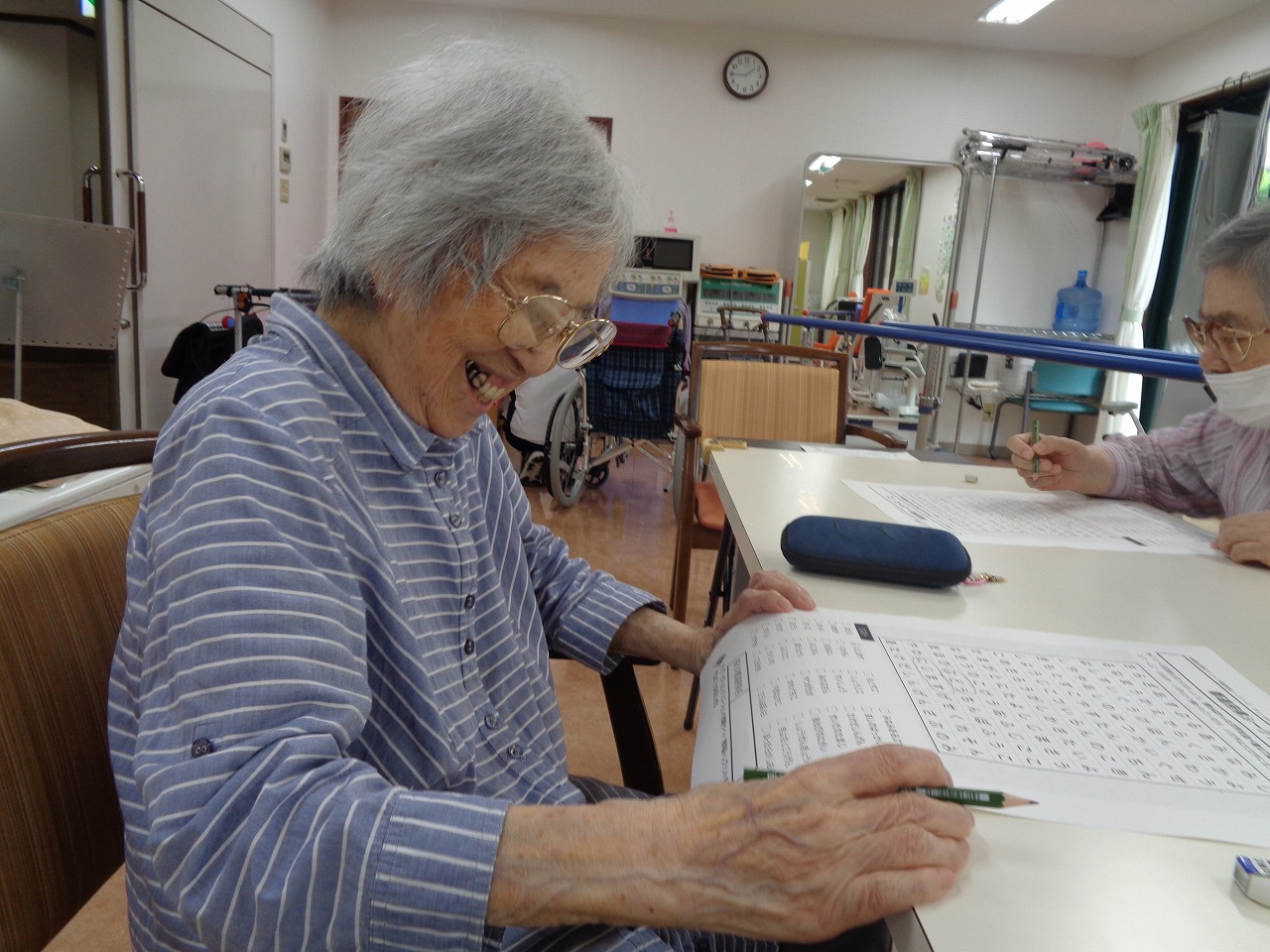 本日は日野リハビリ室にて学習クラブを開催し、『シークワーズ』にチャレンジしていただきました。シークワーズとは散りばめられた文字の中から言葉を探し出していくパズルです。普段は賑やかな事が多い学習クラブですが、今回は皆様、黙々とプリントと向き合っておられました。言葉を見つけ出した際の