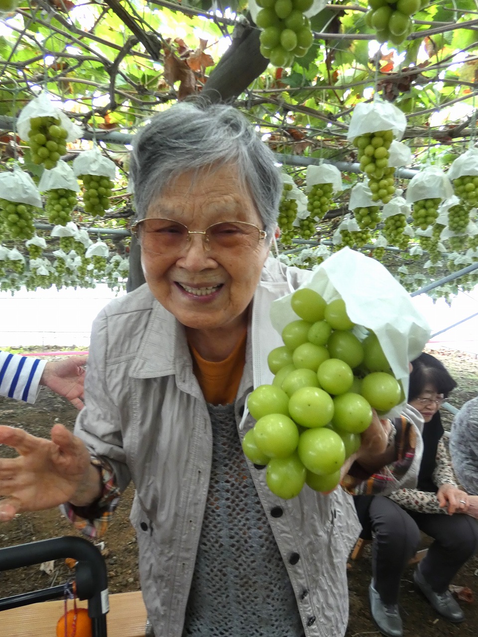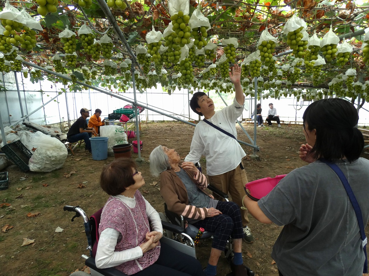 ぶどう園では、たわわに実ったシャインマスカットを