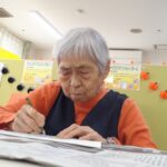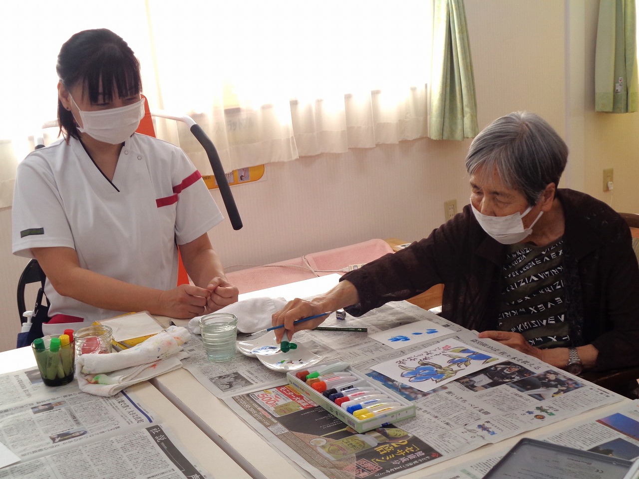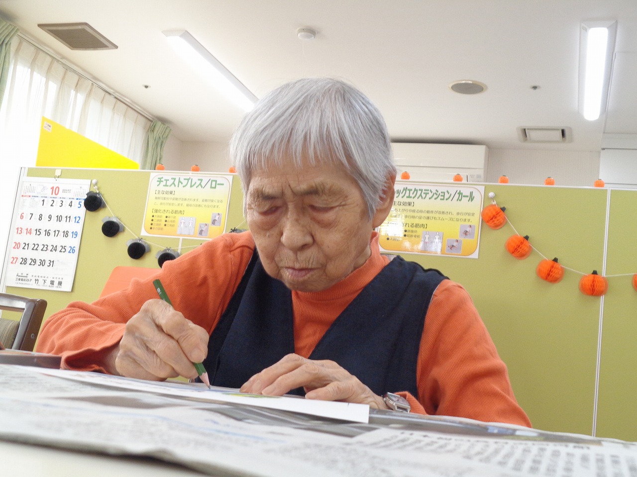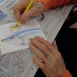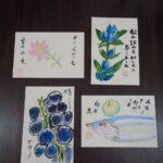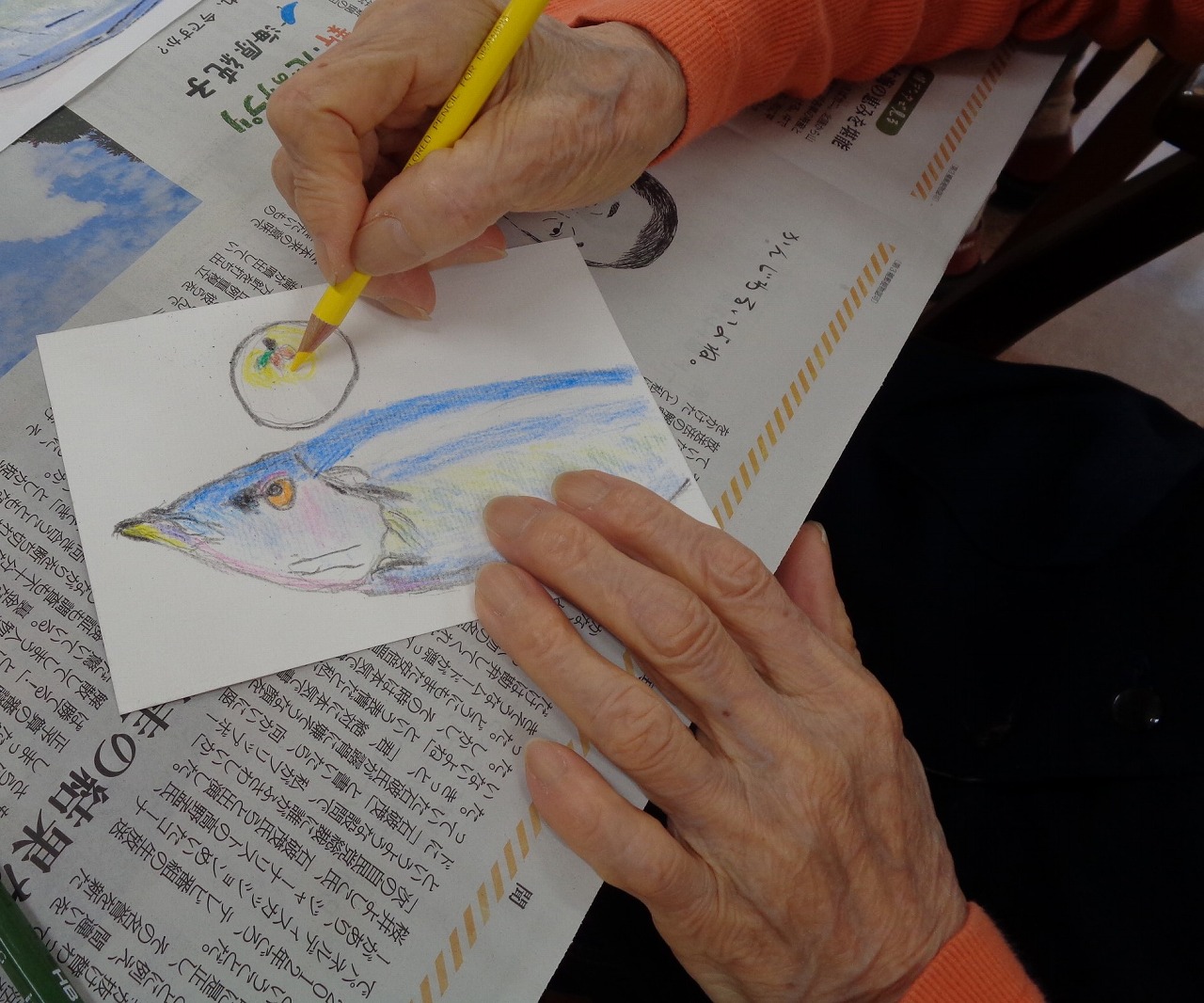 秋の題材をご用意させていただきました。秋刀魚、コスモス、ぶどうなど、お好きな物をハガキに描いてくださいました。色を塗る時も、細かな色合いを上手に出されておられました♪