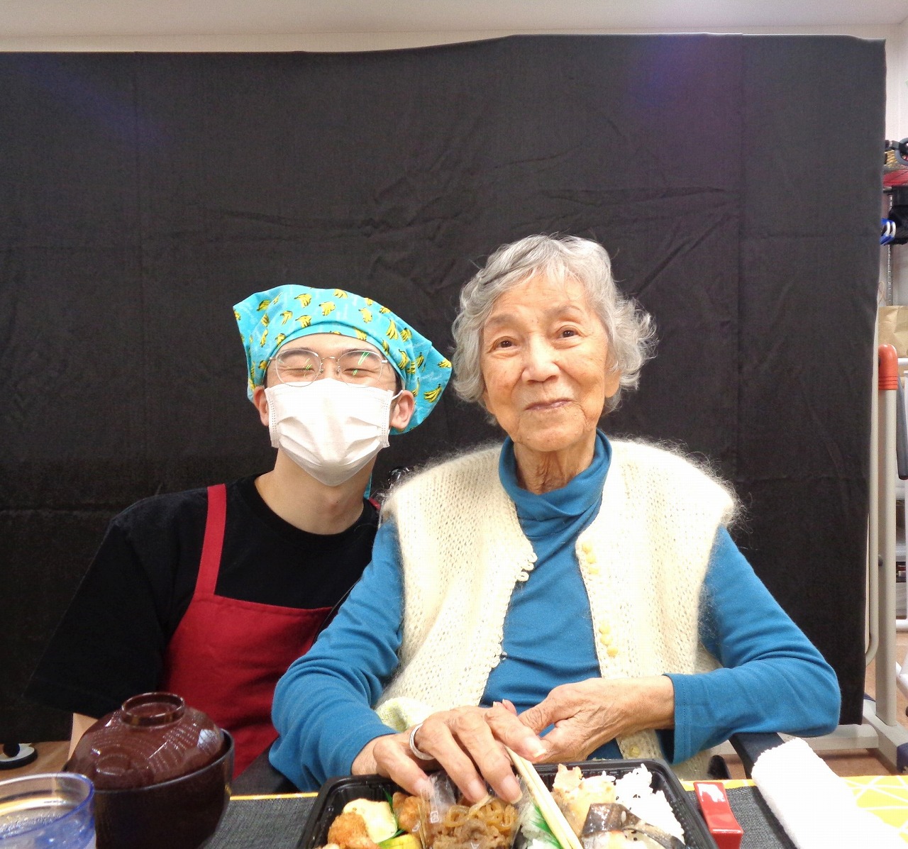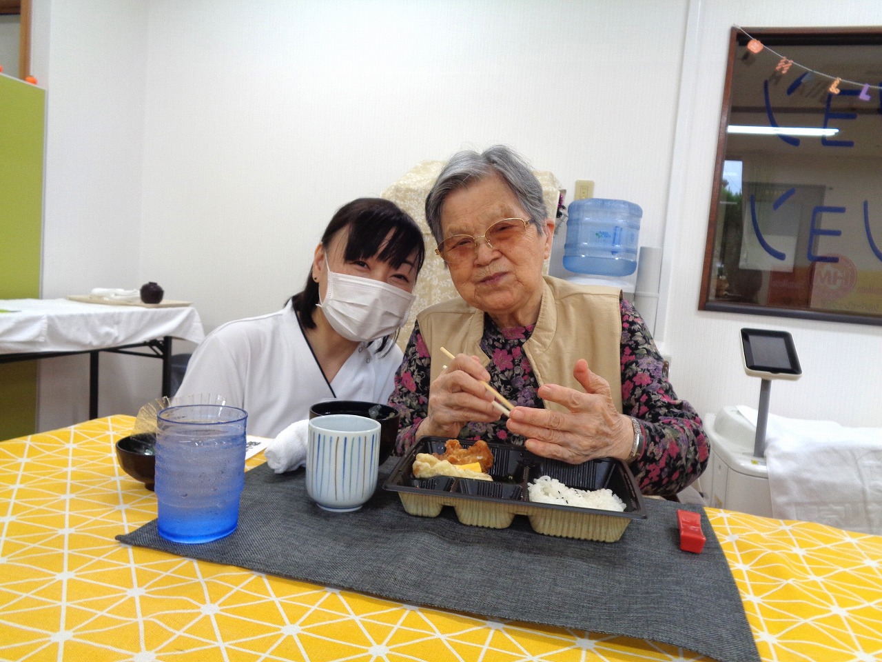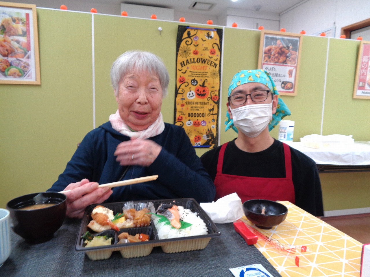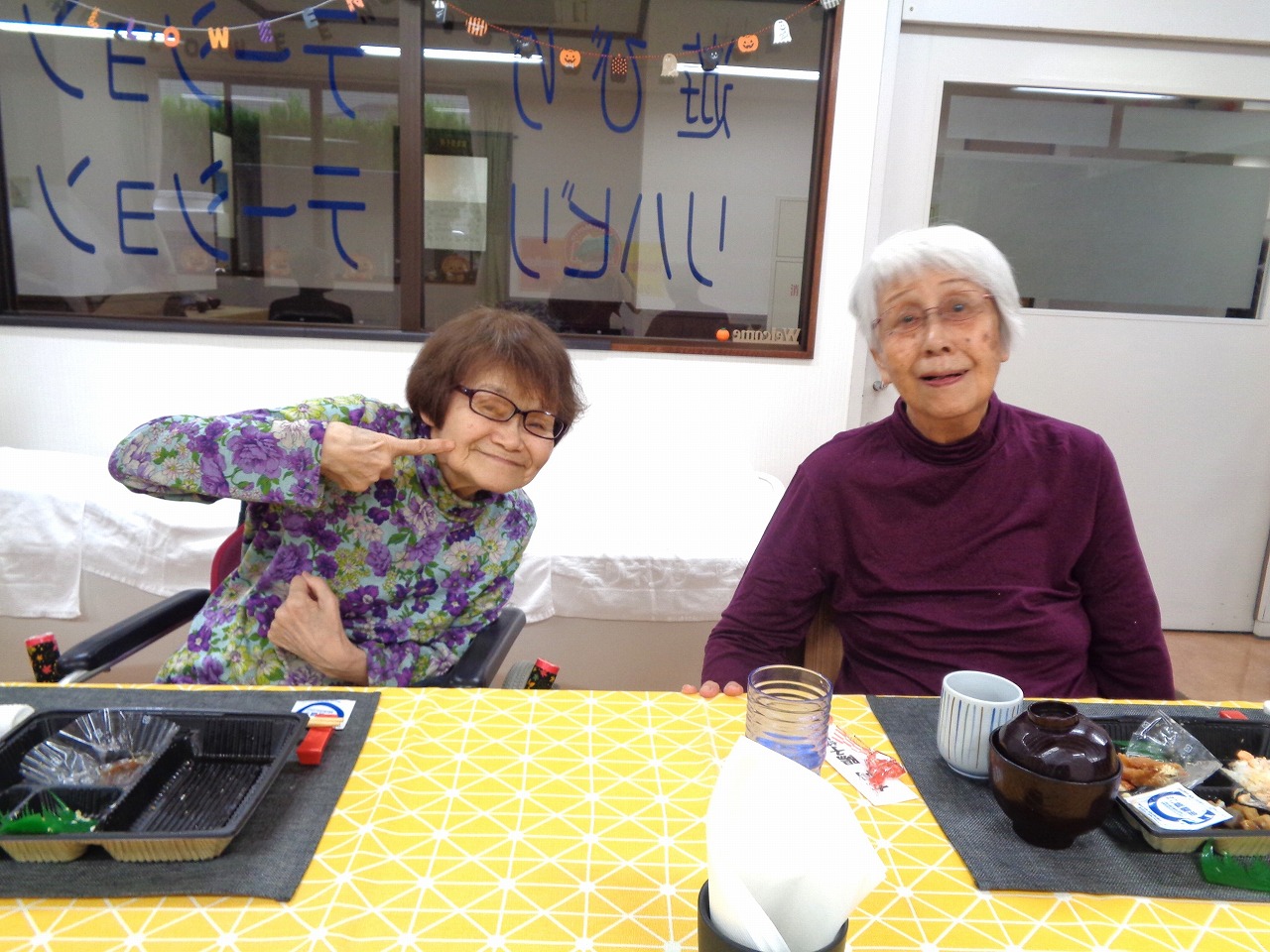 本日は日野リハビリ室にて昼食会を開催し、『ほっともっと』のお弁当をご用意しました。幕の内弁当、カレー弁当や洋風弁当等などから、お好きなお弁当を選んでいただきました。ボリュームたっぷりのお弁当でしたが「エビフライなんて久しぶりに食べたわ」「味が良いわねぇ」と、皆様たくさん召し上がって下さいました!