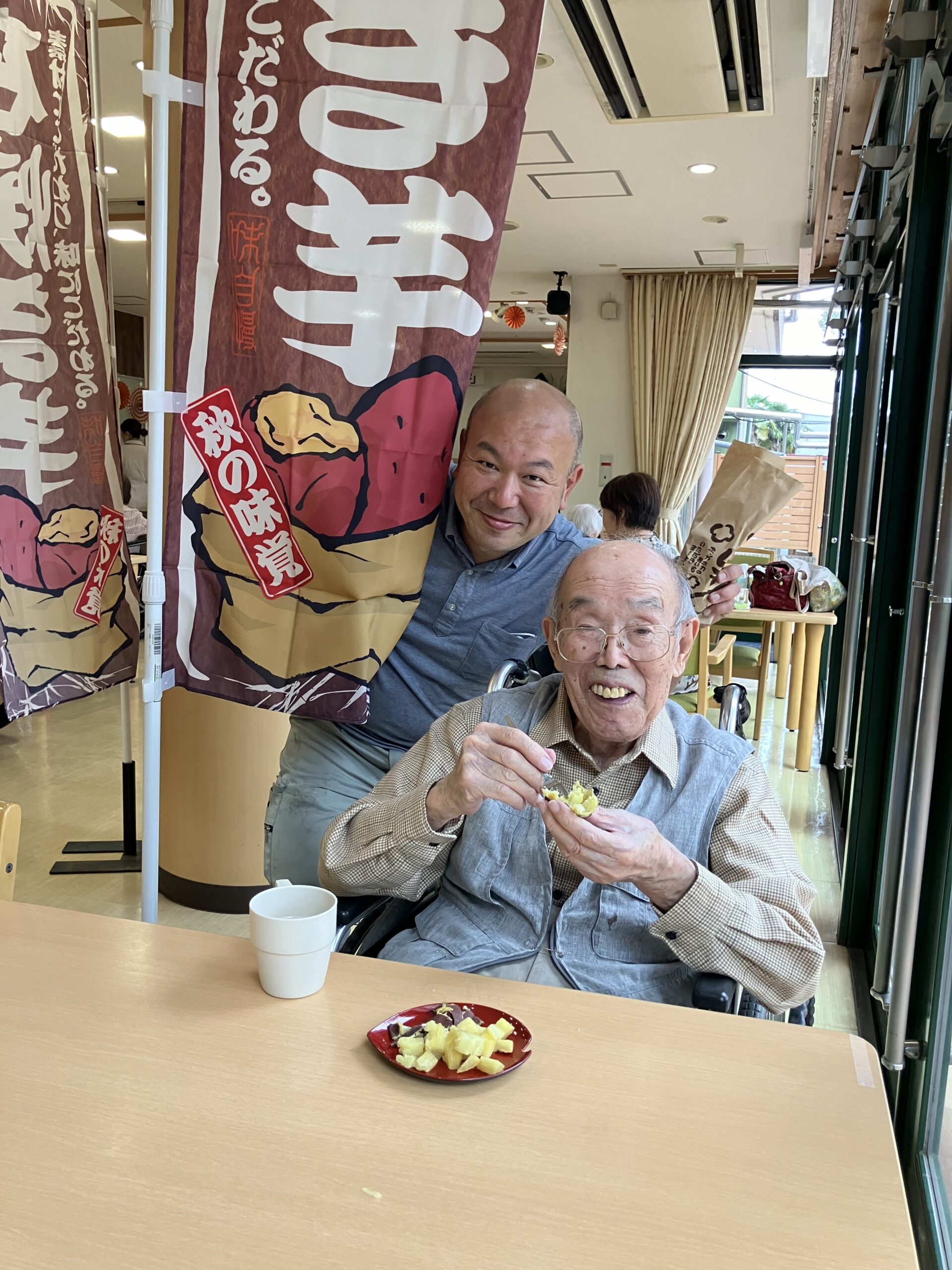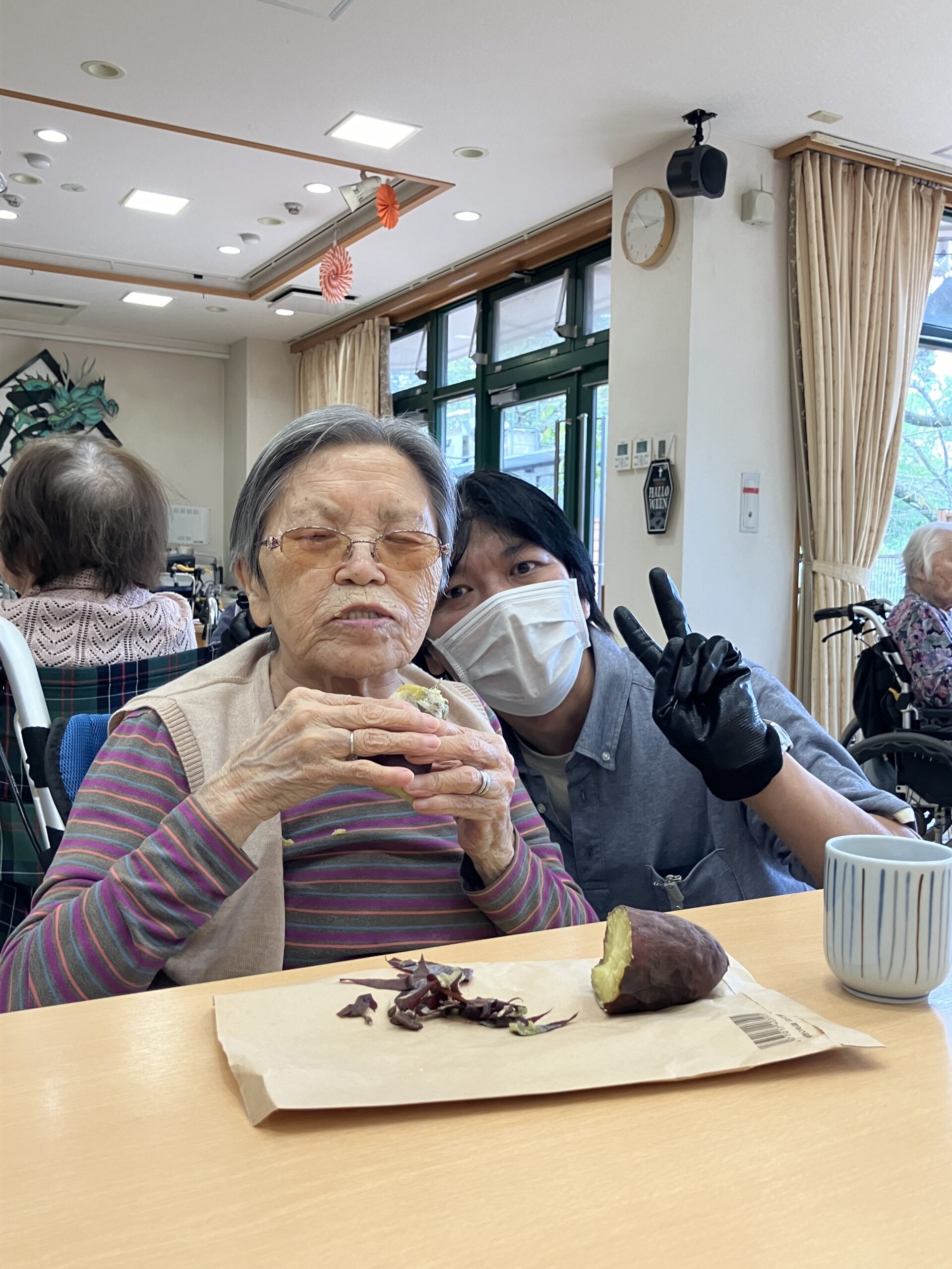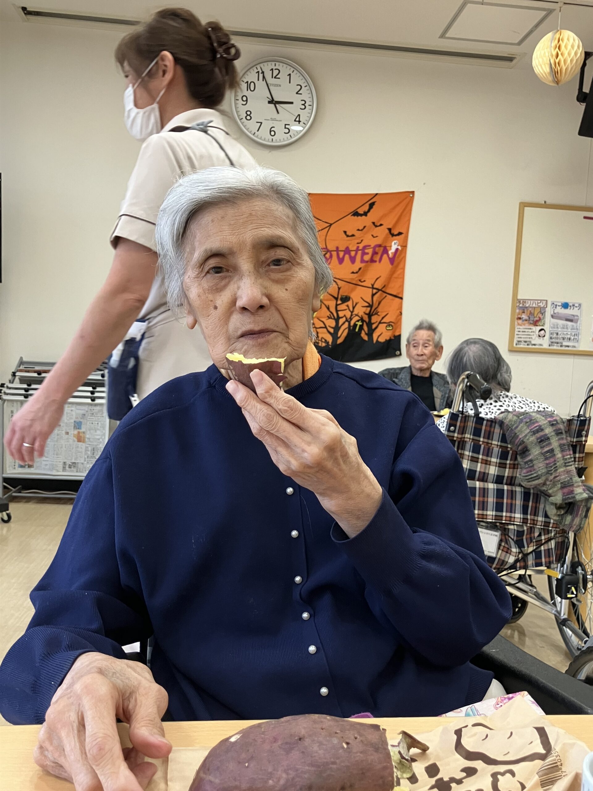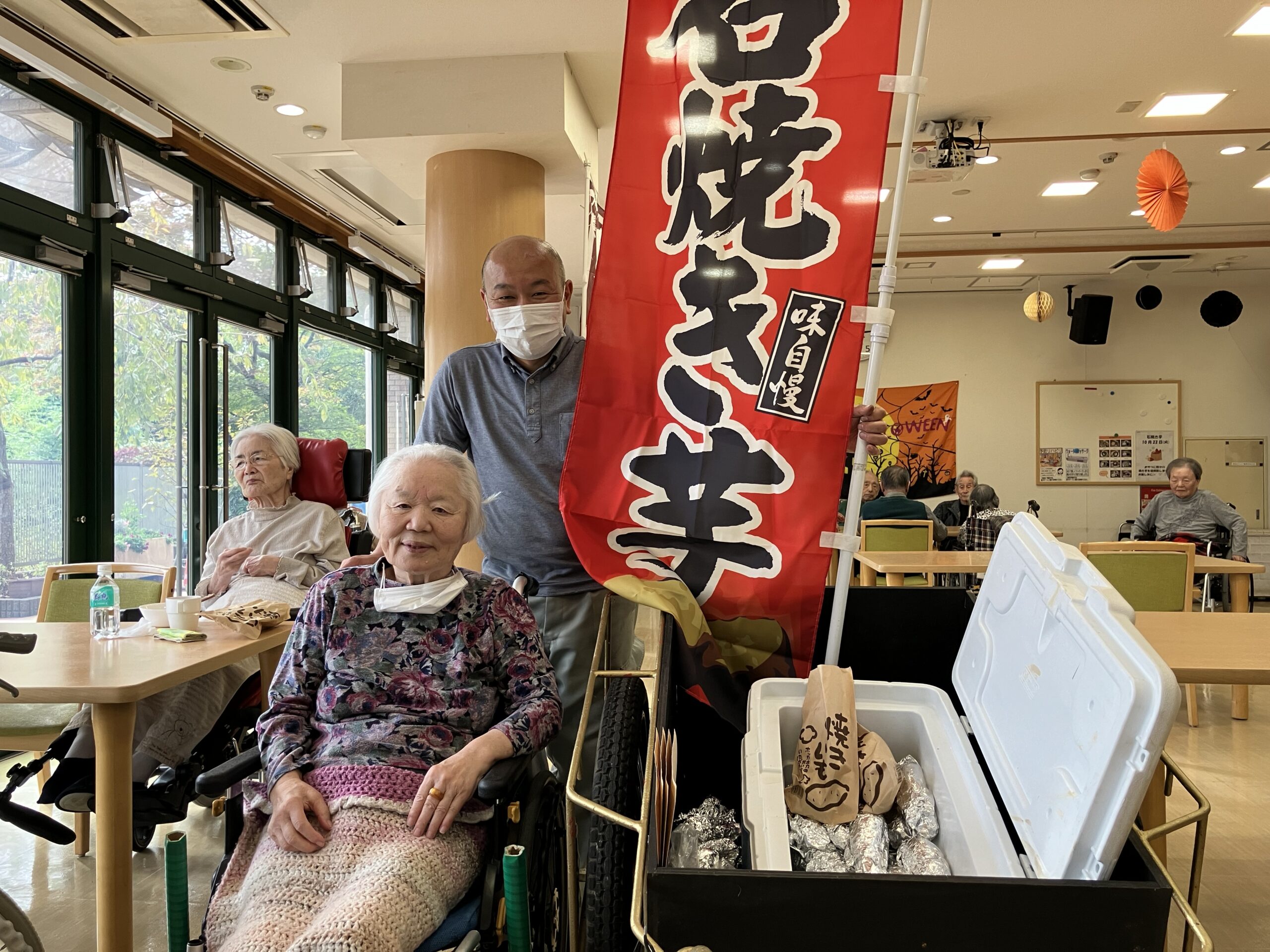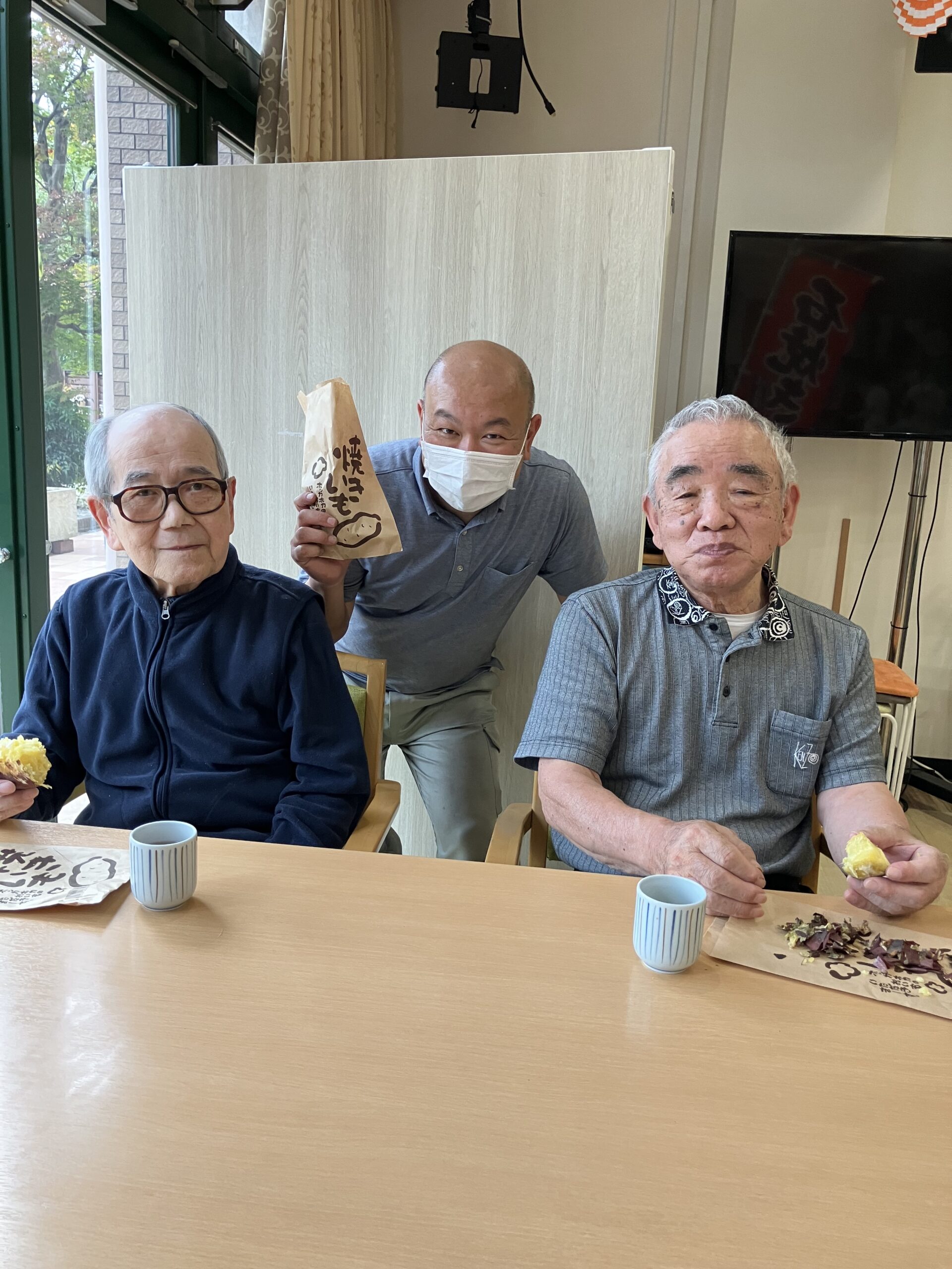「石焼き芋~」とホールで曲を流しながら、雰囲気と焼き芋を味わって頂きました。ご入居者の方々から「柔らかくて、甘くて美味しいわ」とのお言葉を頂き、とても喜ばれておりました。