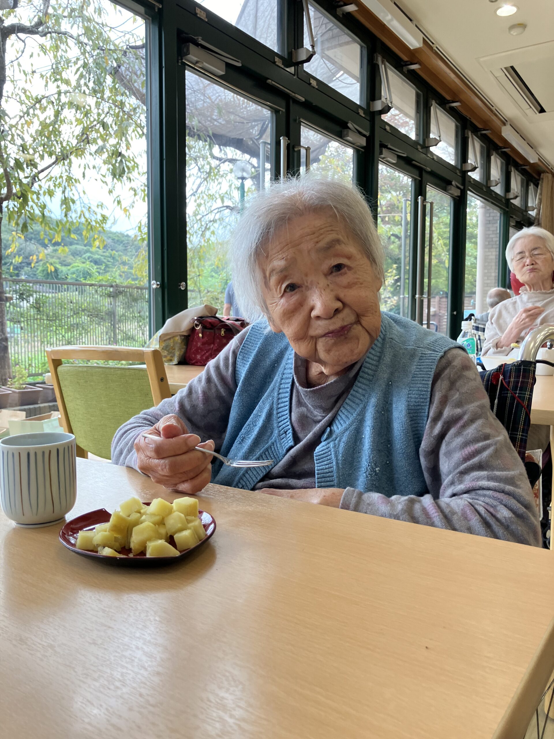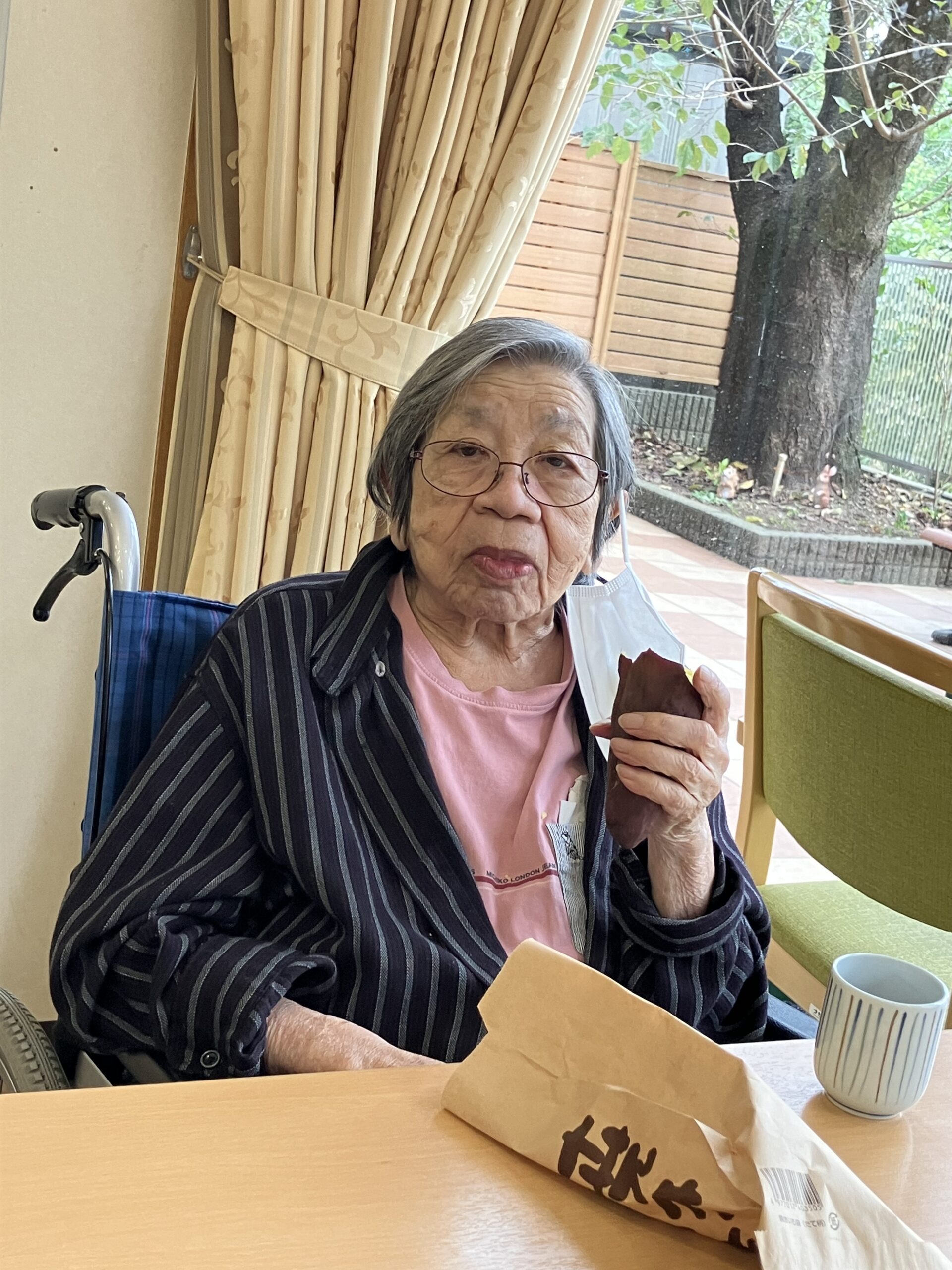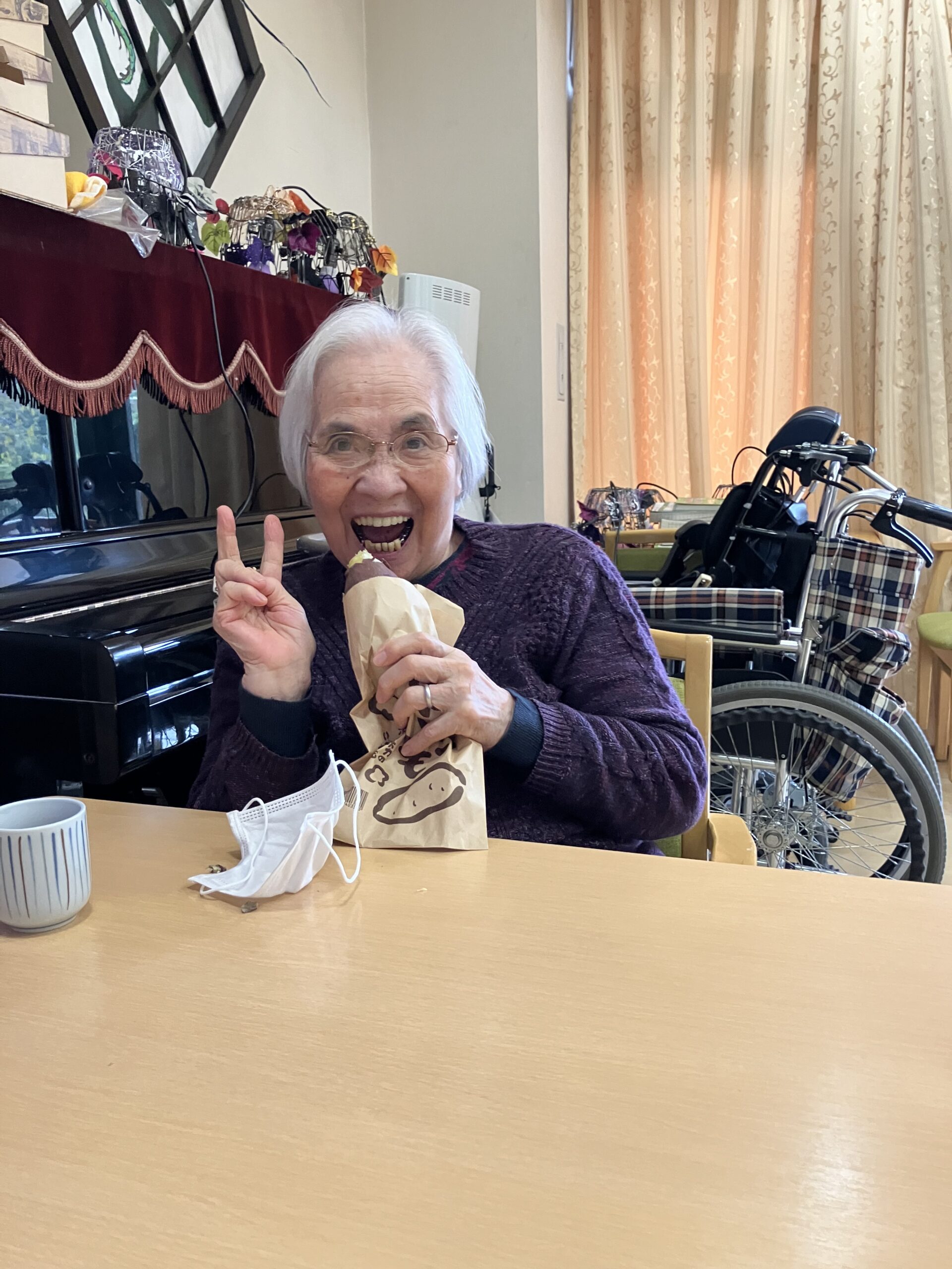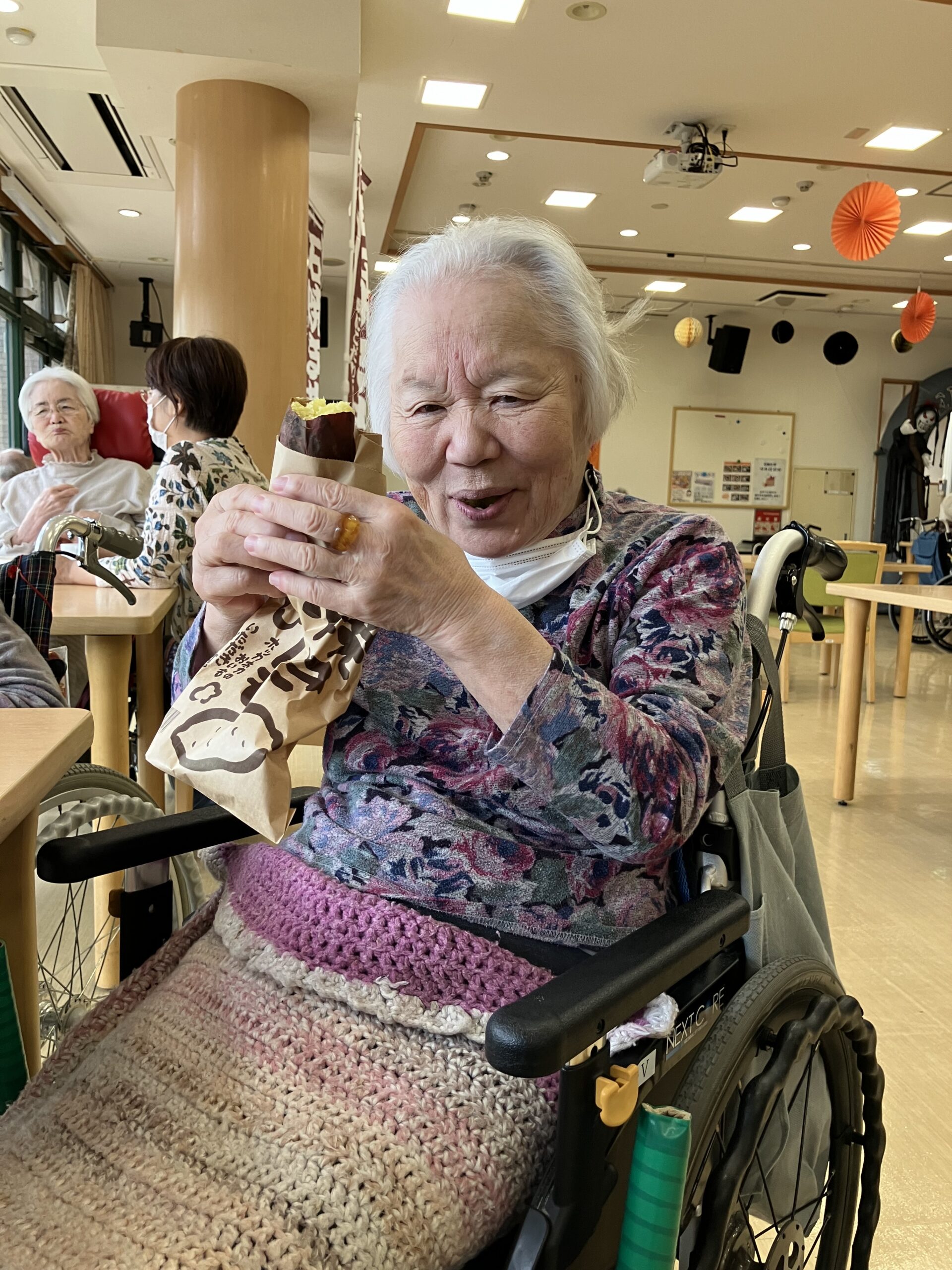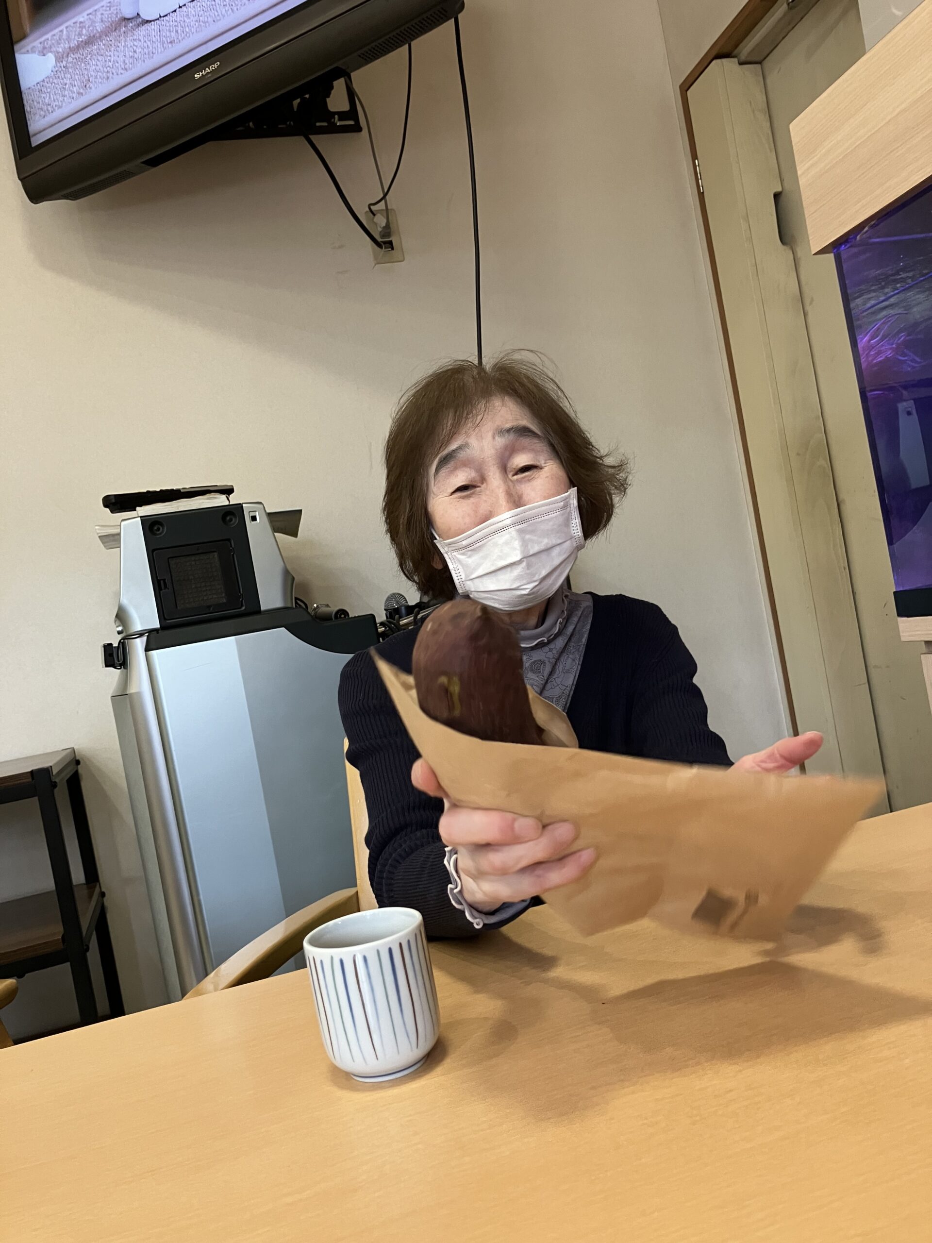 「石焼き芋~」とホールで曲を流しながら、雰囲気と焼き芋を味わって頂きました。ご入居者の方々から「柔らかくて、甘くて美味しいわ」とのお言葉を頂き、とても喜ばれておりました。