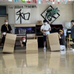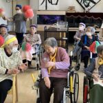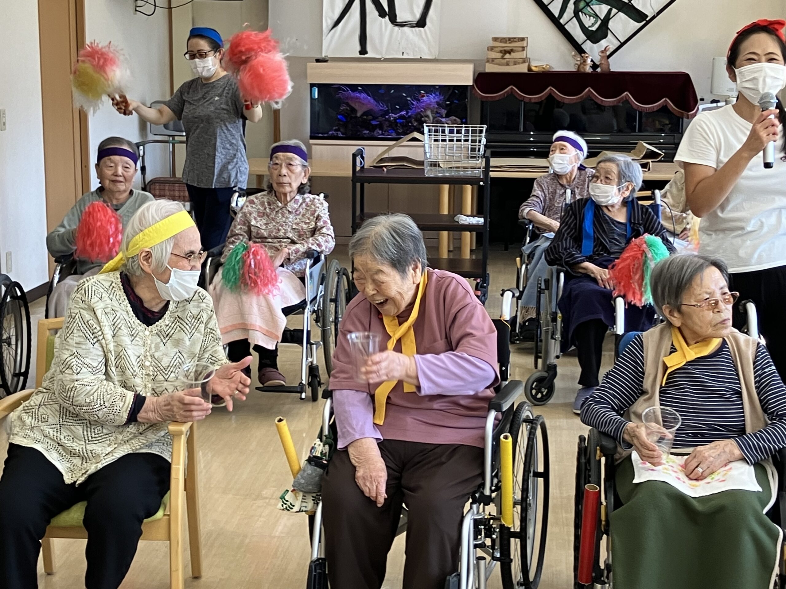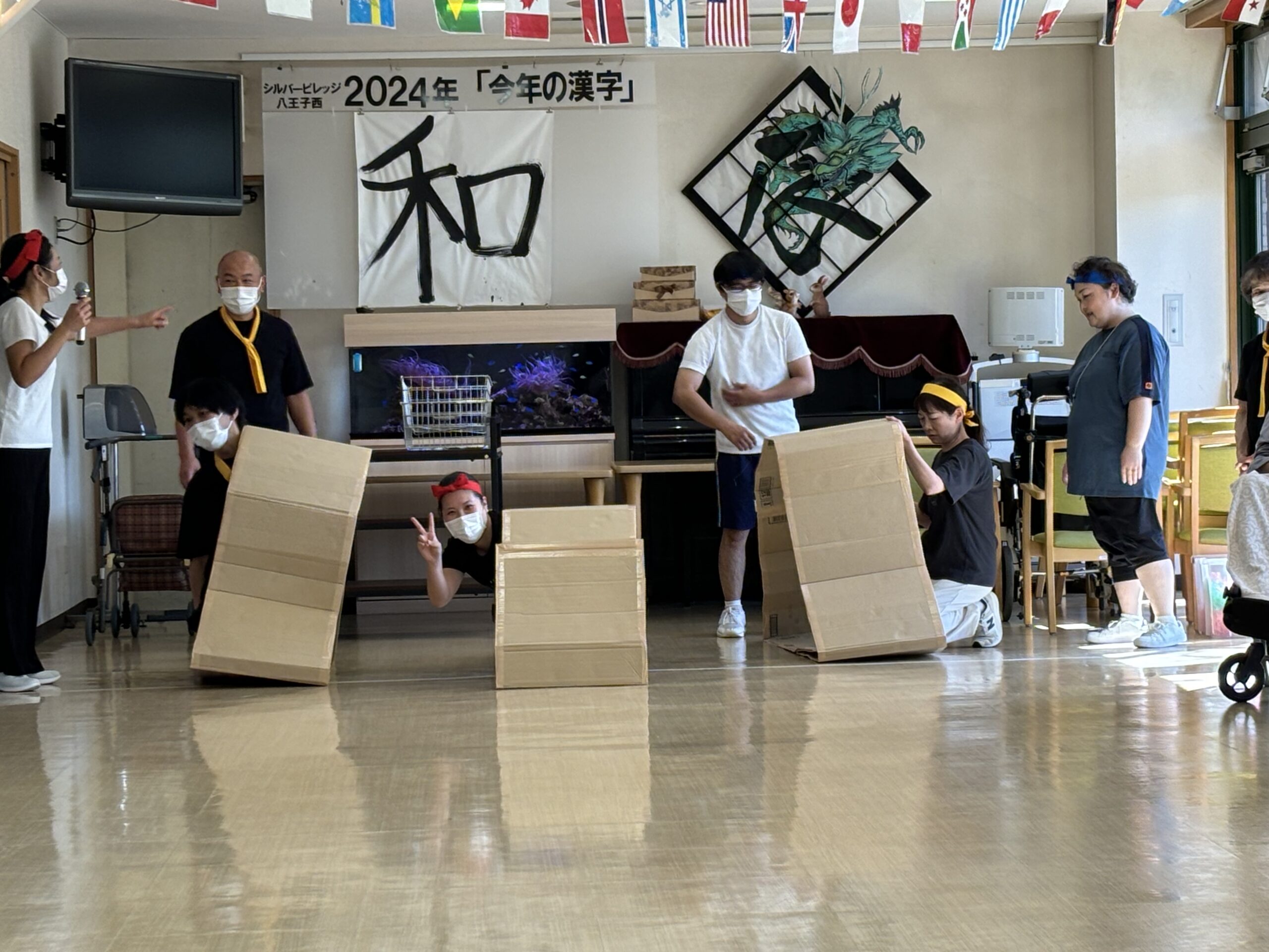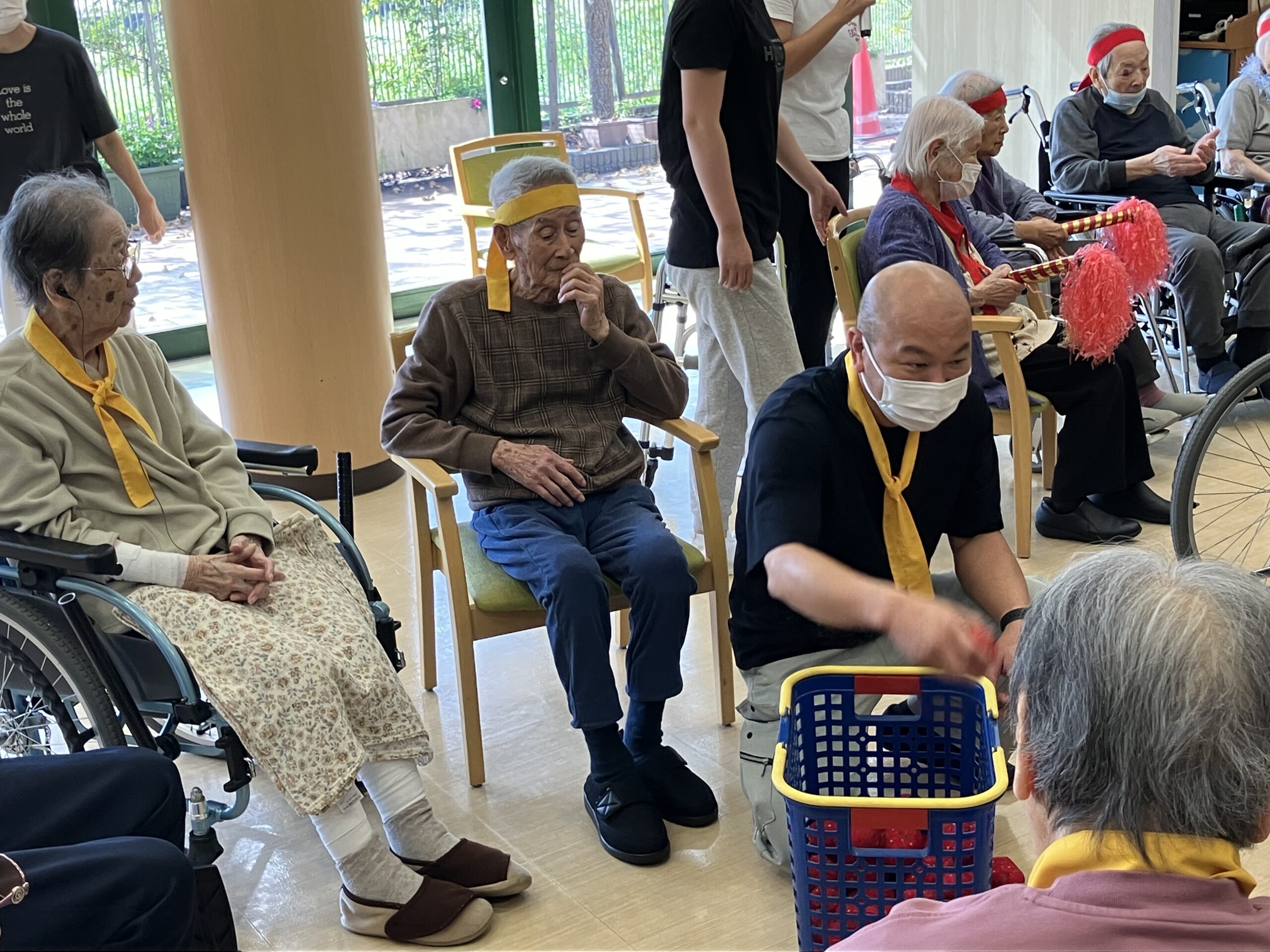 秋の行事第四弾運動会を行いました!!階ごとに「赤組」「紫組」「黄色組」に分かれ、玉入れや、ピンポン玉渡し、最後に職員によるキャタピラー競争を行いました。また、一部のご入居者の方には応援団をやって頂き皆様熱く一致団結しておりました!昼食には運動会弁当と豚汁を美味しく頂きました!!