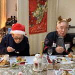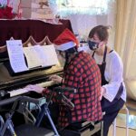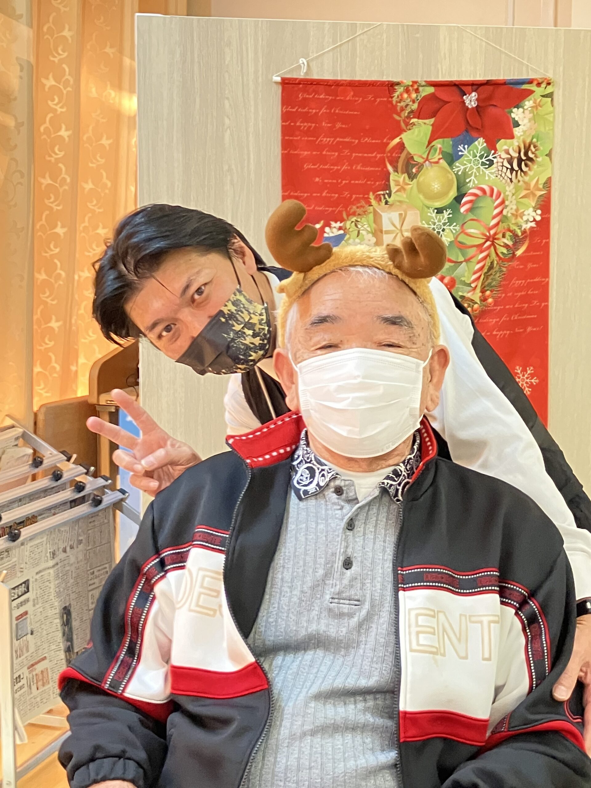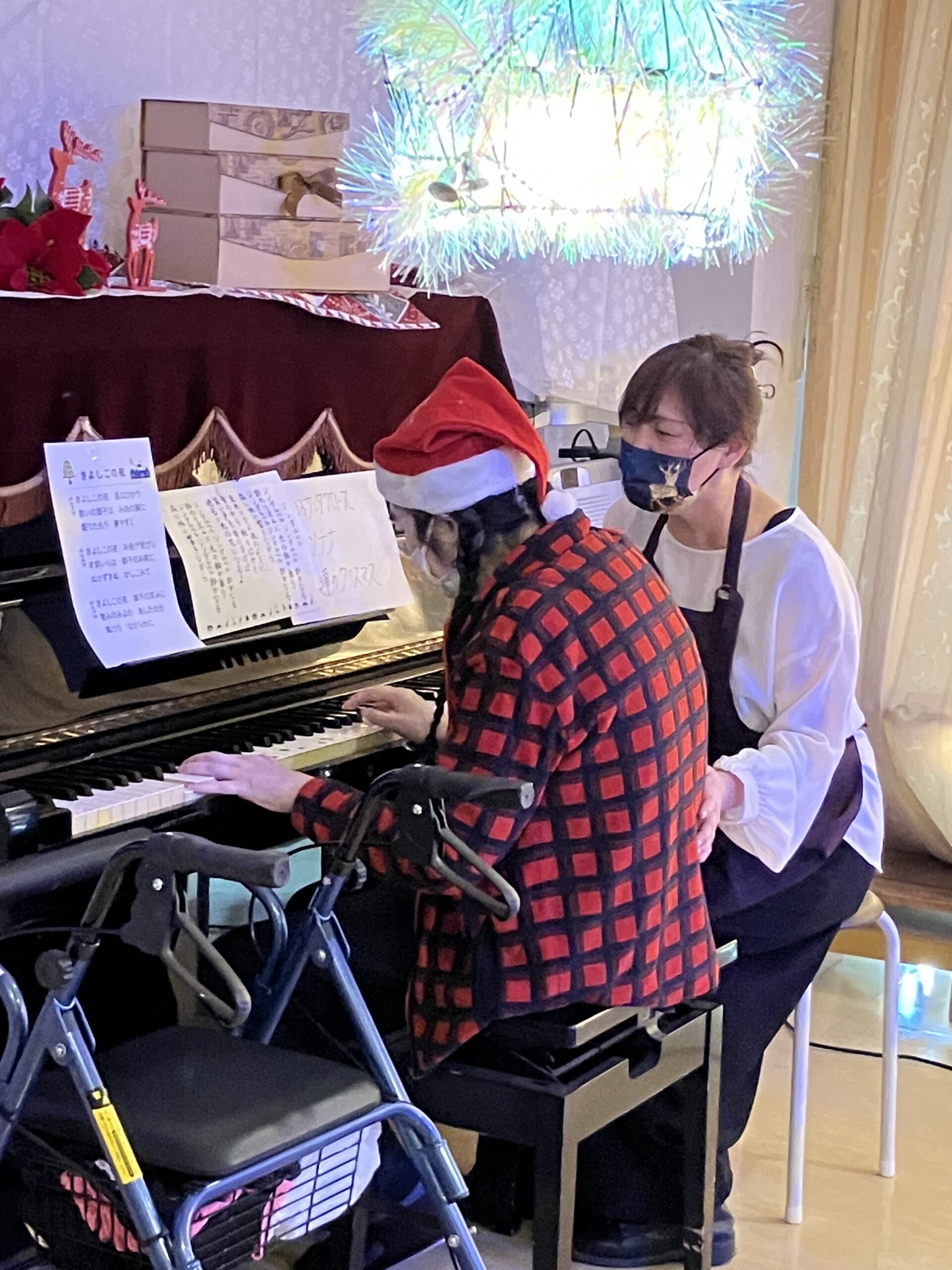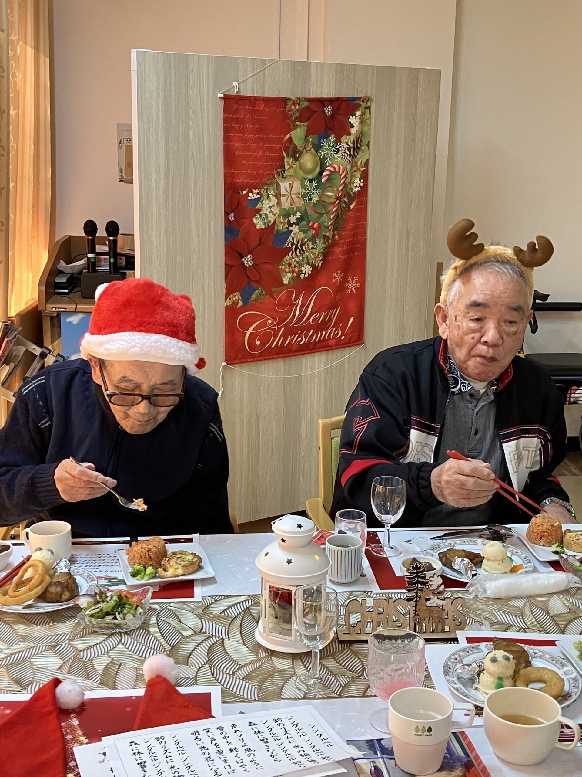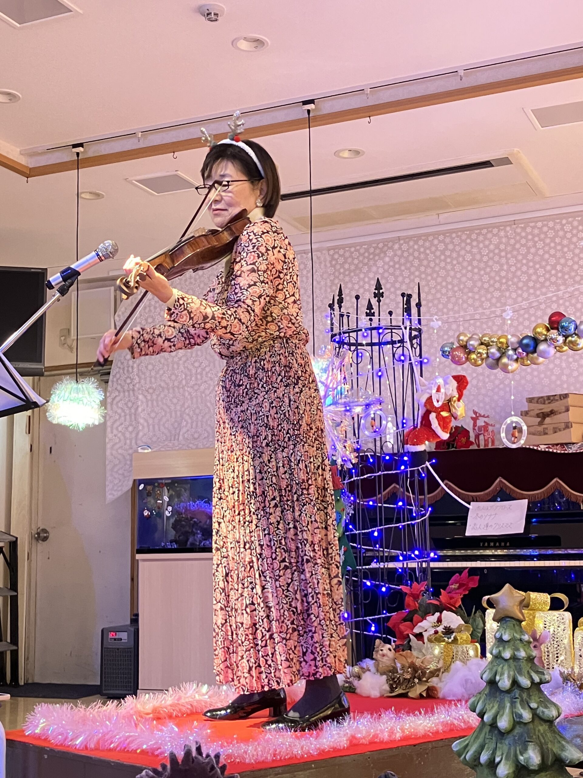 12月23日にクリスマス会を行いました。お食事前にご入居者の方がクリスマスソングを三曲演奏して下さいました。お食事には、「ローストチキン、雪だるまの形のマッシュポテト、タルトグラタンとケチャップライス、サーモンサラダバラ仕立て、オニオンベーコンスープ、チョコツリープリン」と盛り沢山なお食事が提供され、皆様「こんなに食べられるかしら」「かわいらしいお食事」ととても喜ばれておりました♪午後の部では、バイオリン演奏や、職員によるジャンボリミッキーダンスを披露したり、最後にサンタクロースからひざ掛け毛布がプレゼントされました。