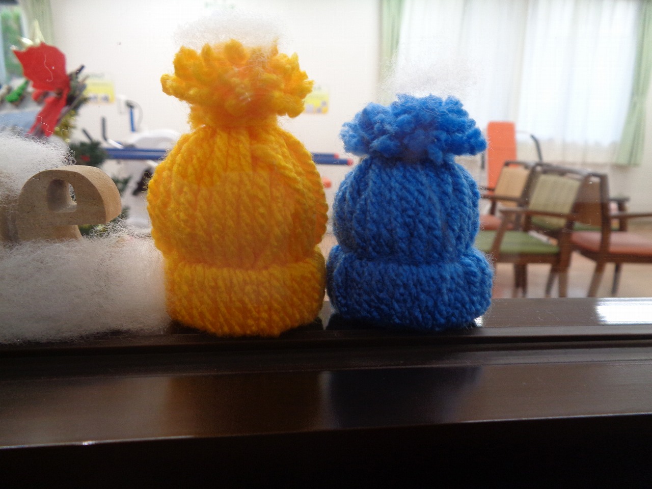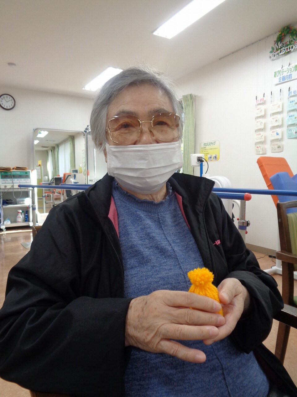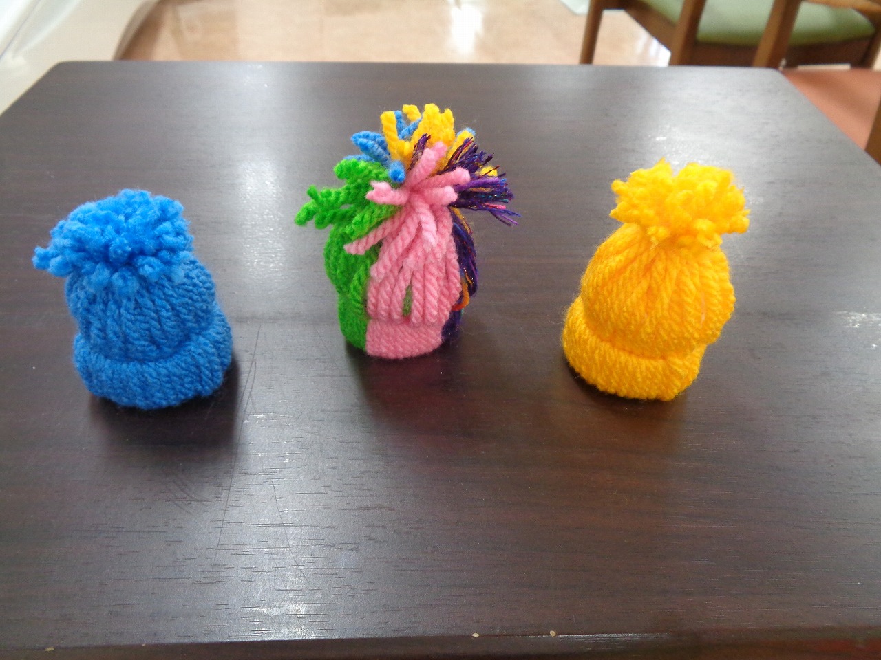 12月4日(水)、本日の手作りクラブは「毛糸の帽子」を作りました!帽子と言いましても、ミニ帽子です♬皆様お好きな色の毛糸を選び、切ったラップの芯に巻き付けて、とても器用に作ってくださいました。同じ動作を繰り返して作るので「これは手のリハビリね」と、仰っておられました。可愛い帽子が出来たので、リハビリ室に飾りました♪是非ご覧ください!