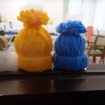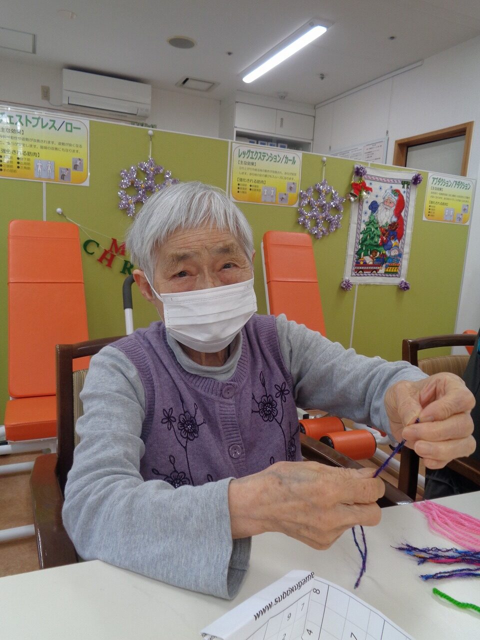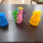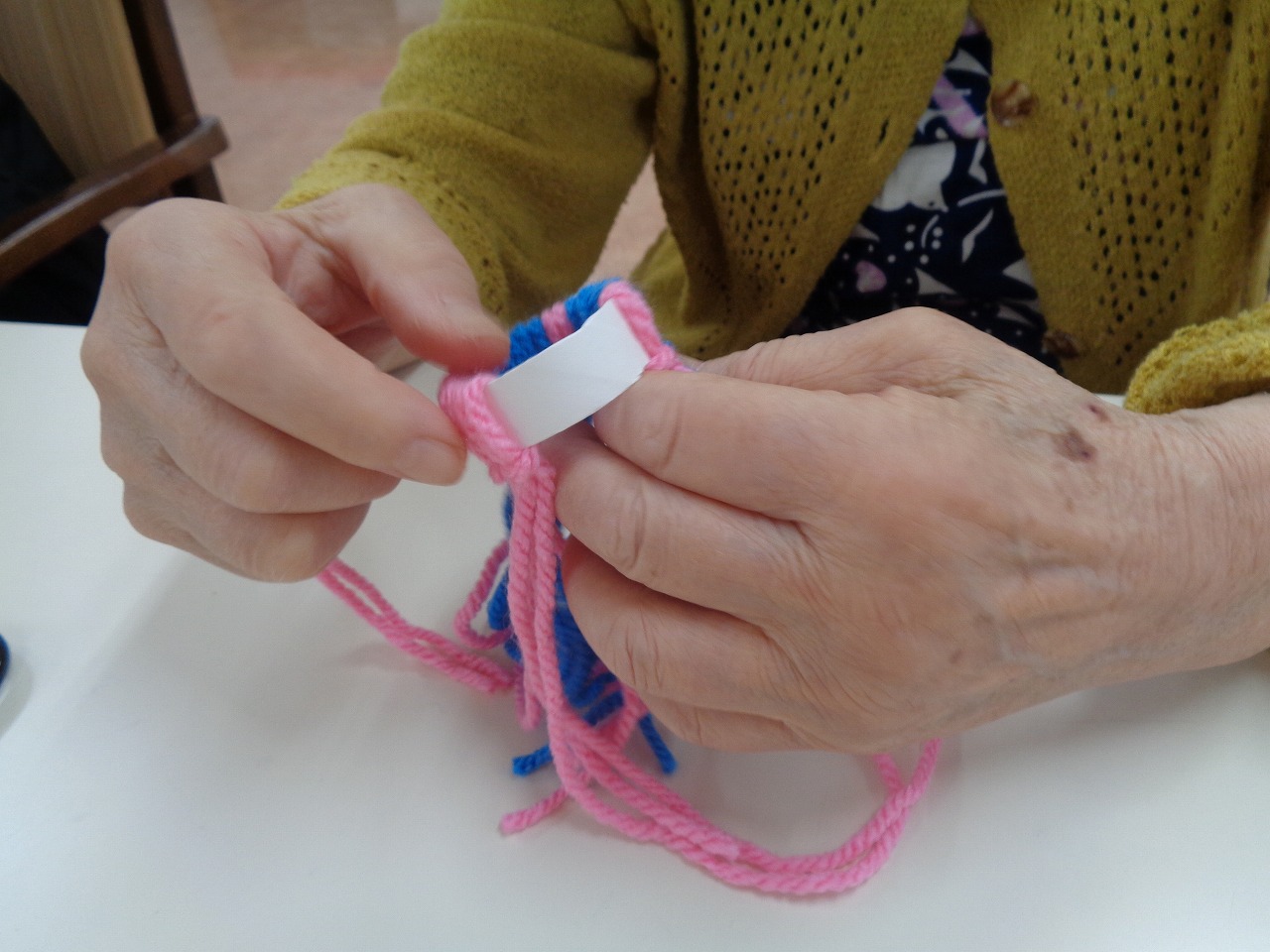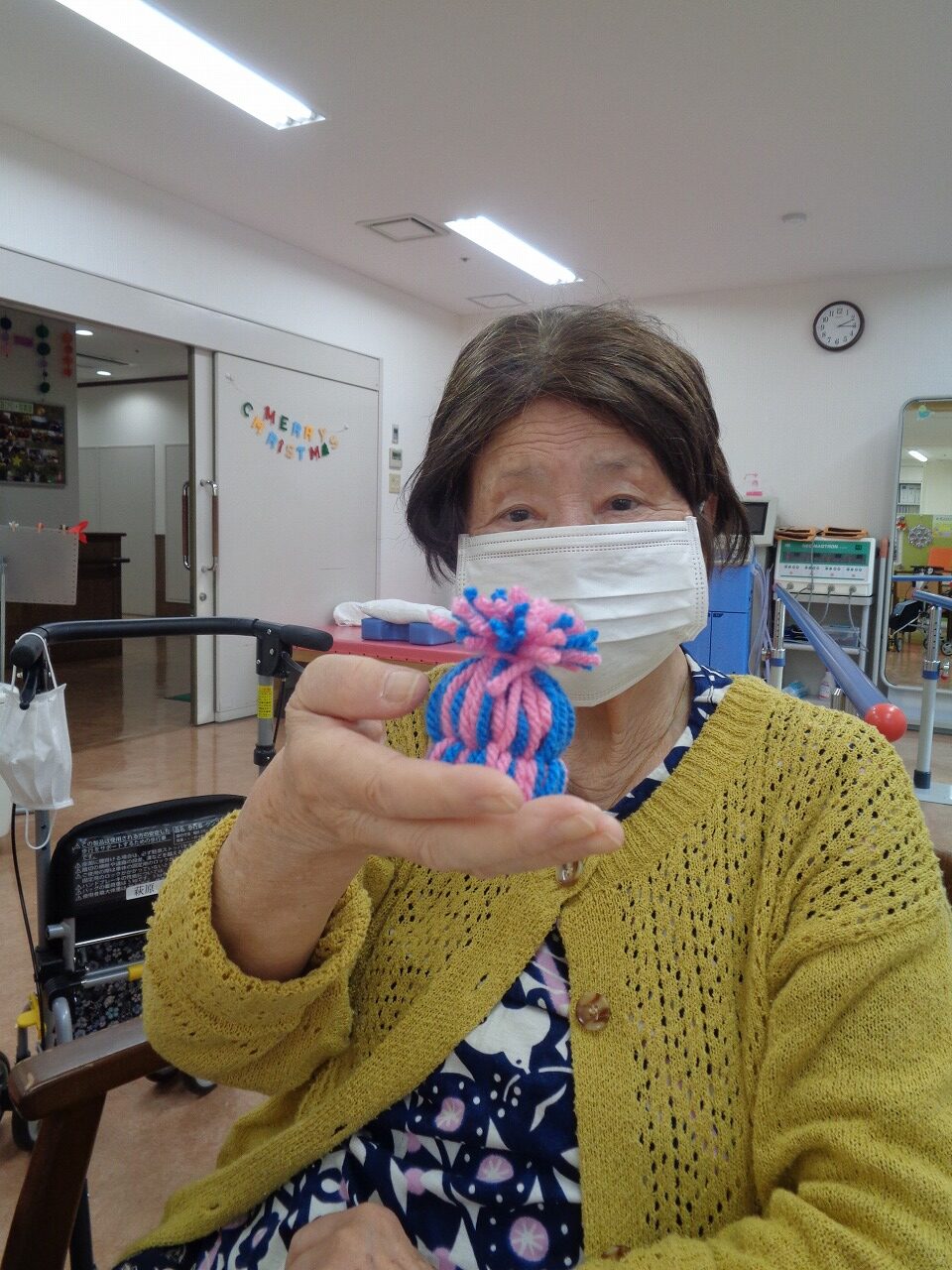12月4日(水)、本日の手作りクラブは「毛糸の帽子」を作りました!帽子と言いましても、ミニ帽子です♬皆様お好きな色の毛糸を選び、切ったラップの芯に巻き付けて、とても器用に作ってくださいました。同じ動作を繰り返して作るので「これは手のリハビリね」と、仰っておられました。可愛い帽子が出来たので、リハビリ室に飾りました♪是非ご覧ください!
