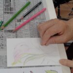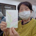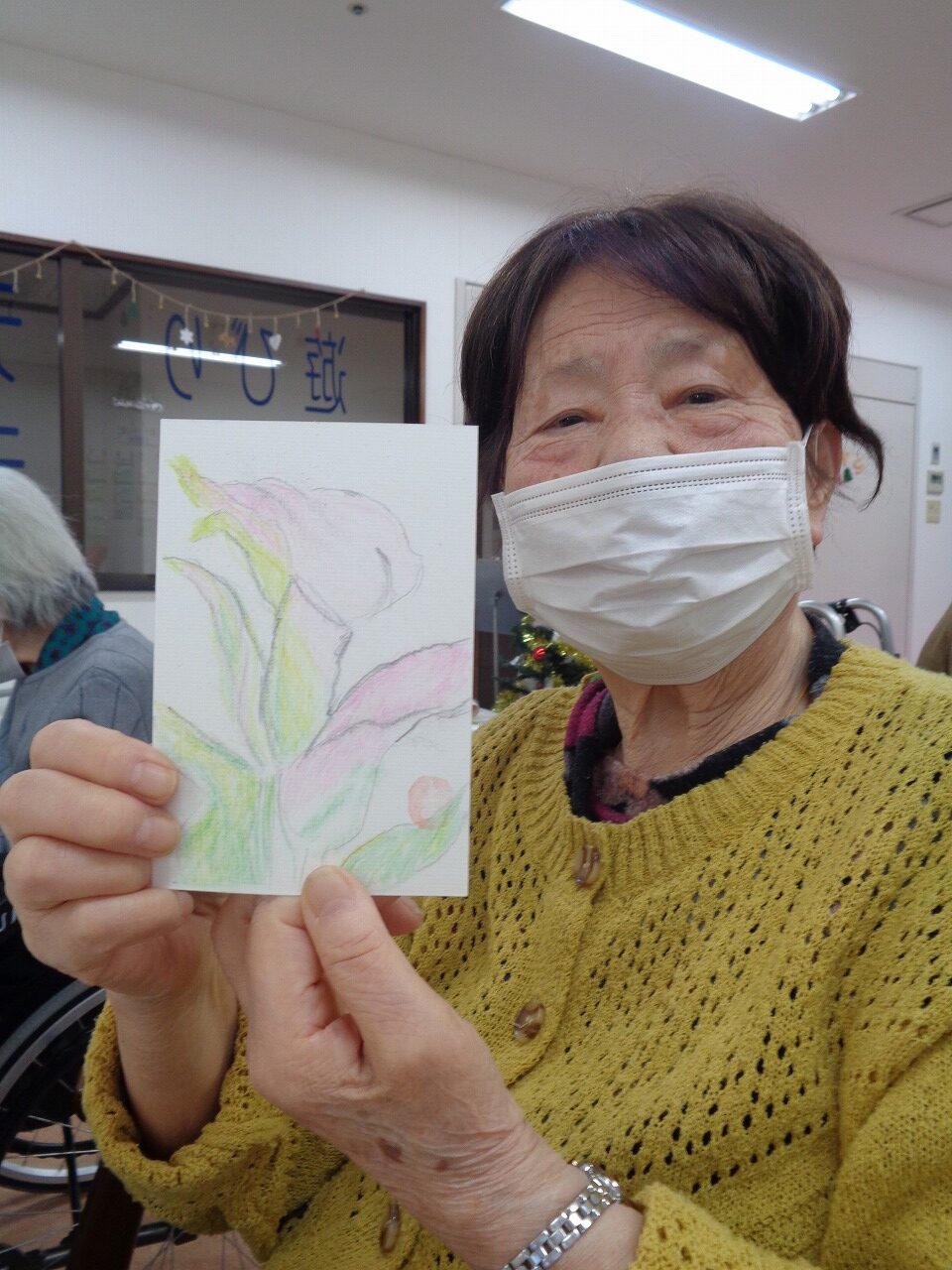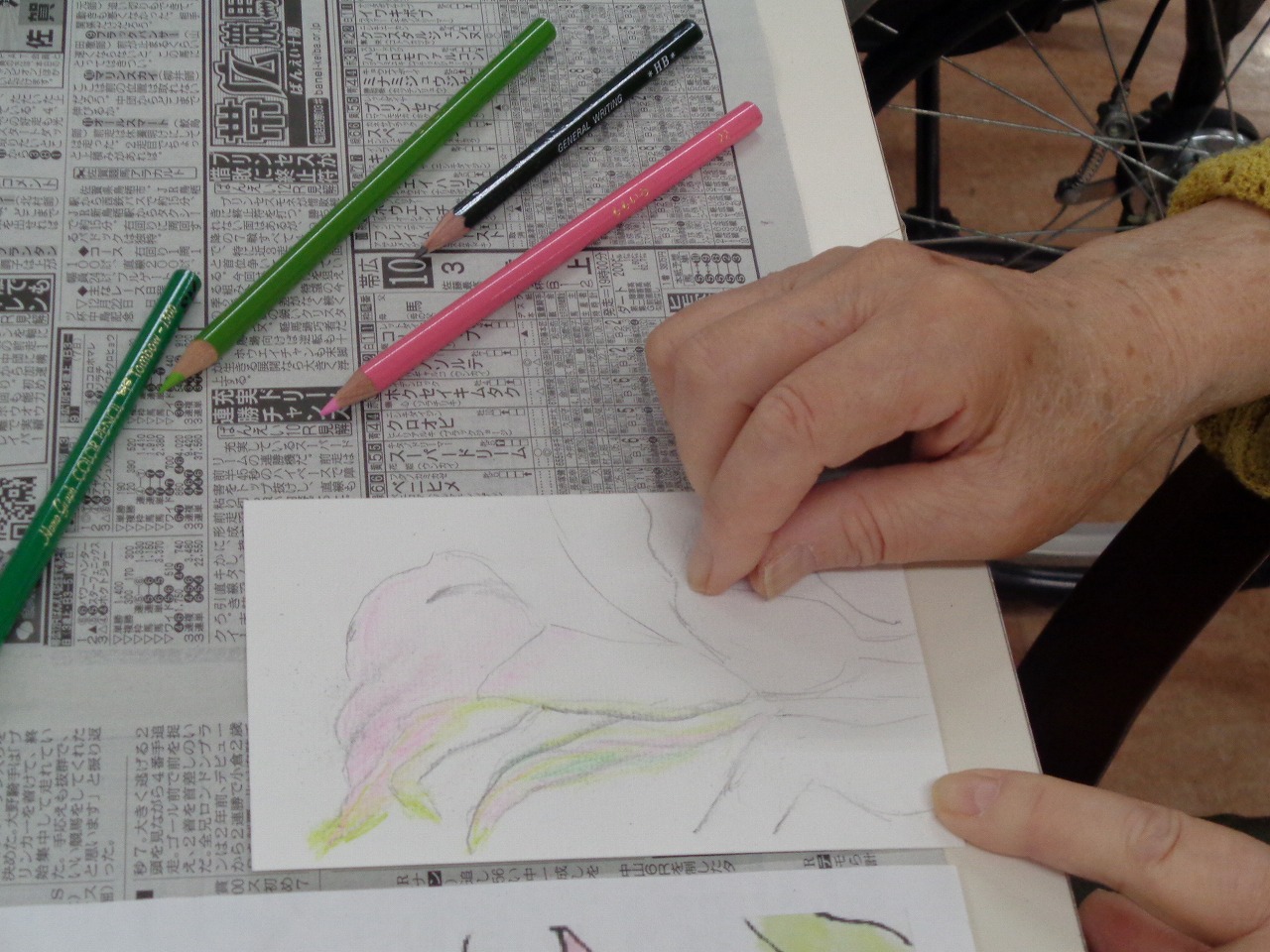 お好きな題材をハガキに描いて、色を塗っていただきました♪最近ではご自分の色鉛筆を持参してくださる方も増えてきました!