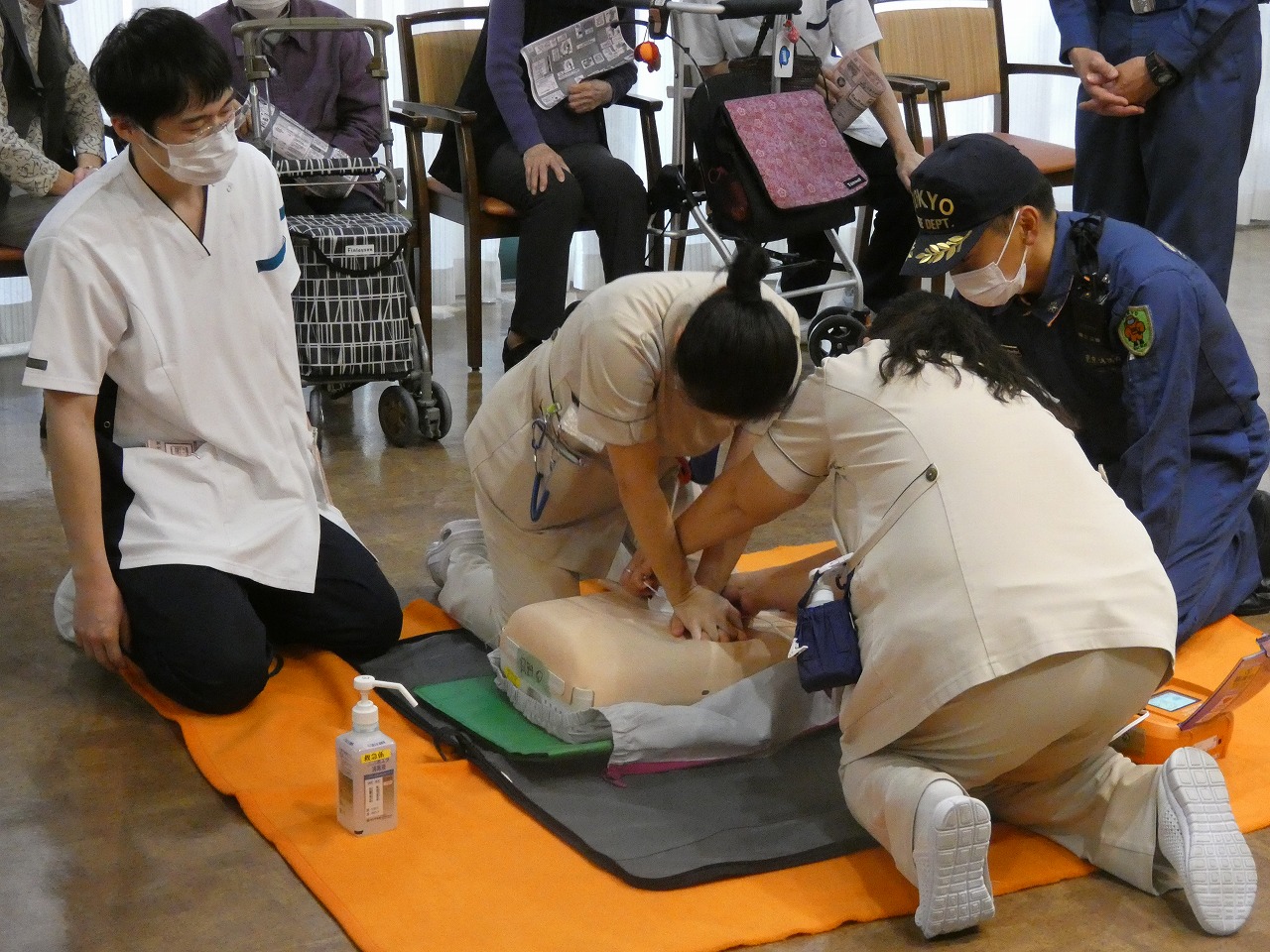 AED(自動体外式除細動器)を用いての応急手当の要領。