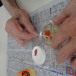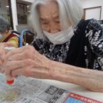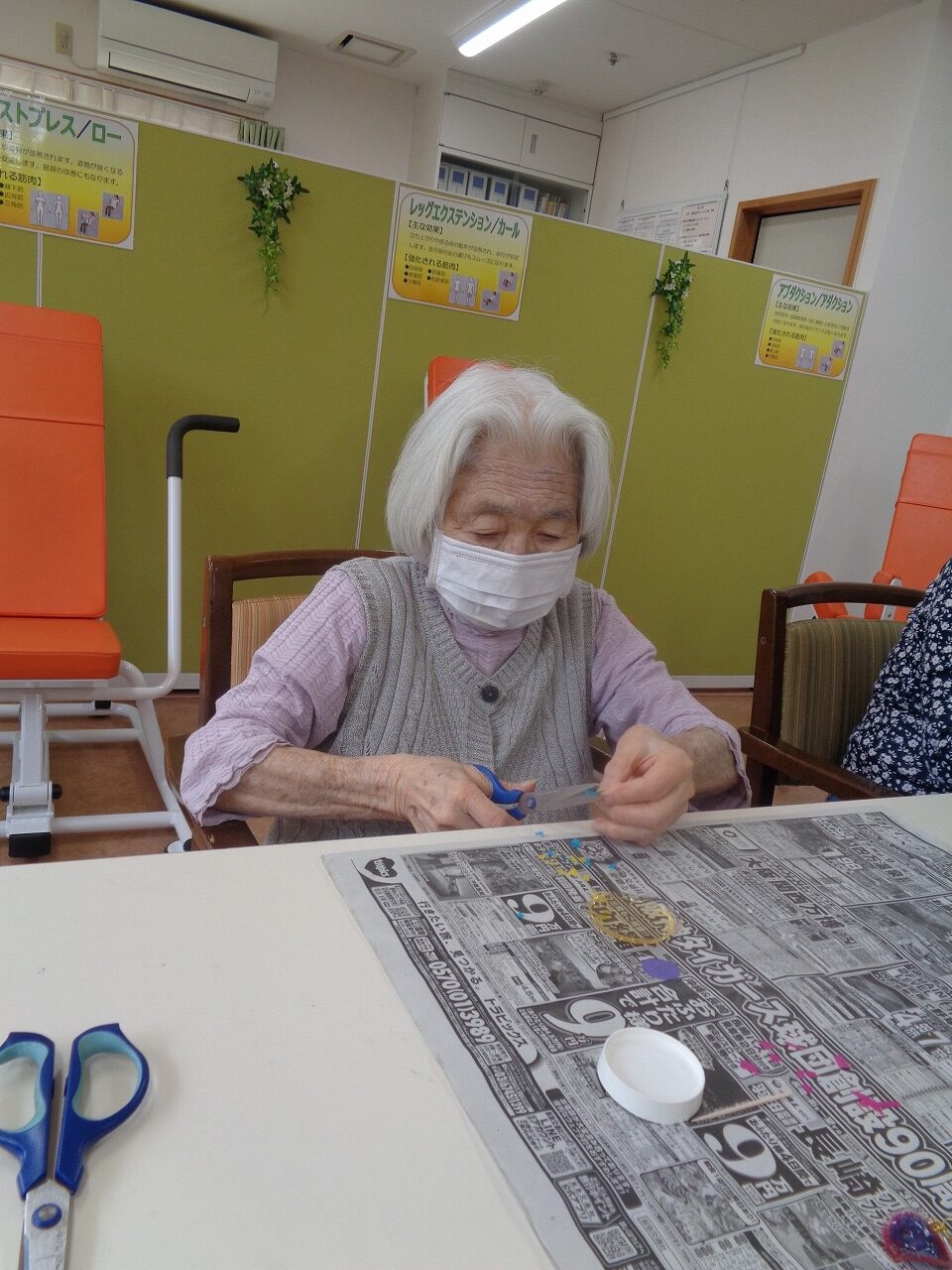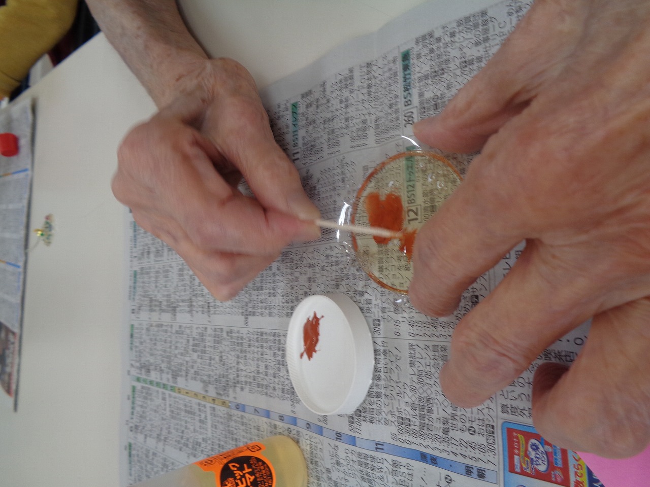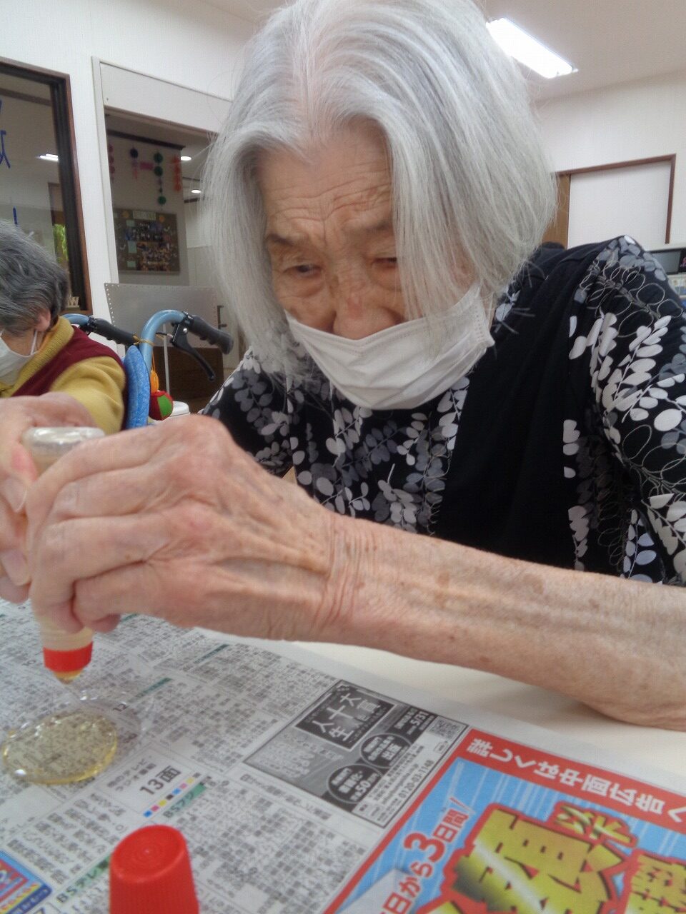 5月7日(水)、本日は手作りクラブです。液体のりを使って、のり細工を作っていただきました。幼い頃、液体のりを使った遊びをやりませんでしたか?手に付けて糸状になるまでぐるぐる回したり、のりに絵を描いてみたり…
