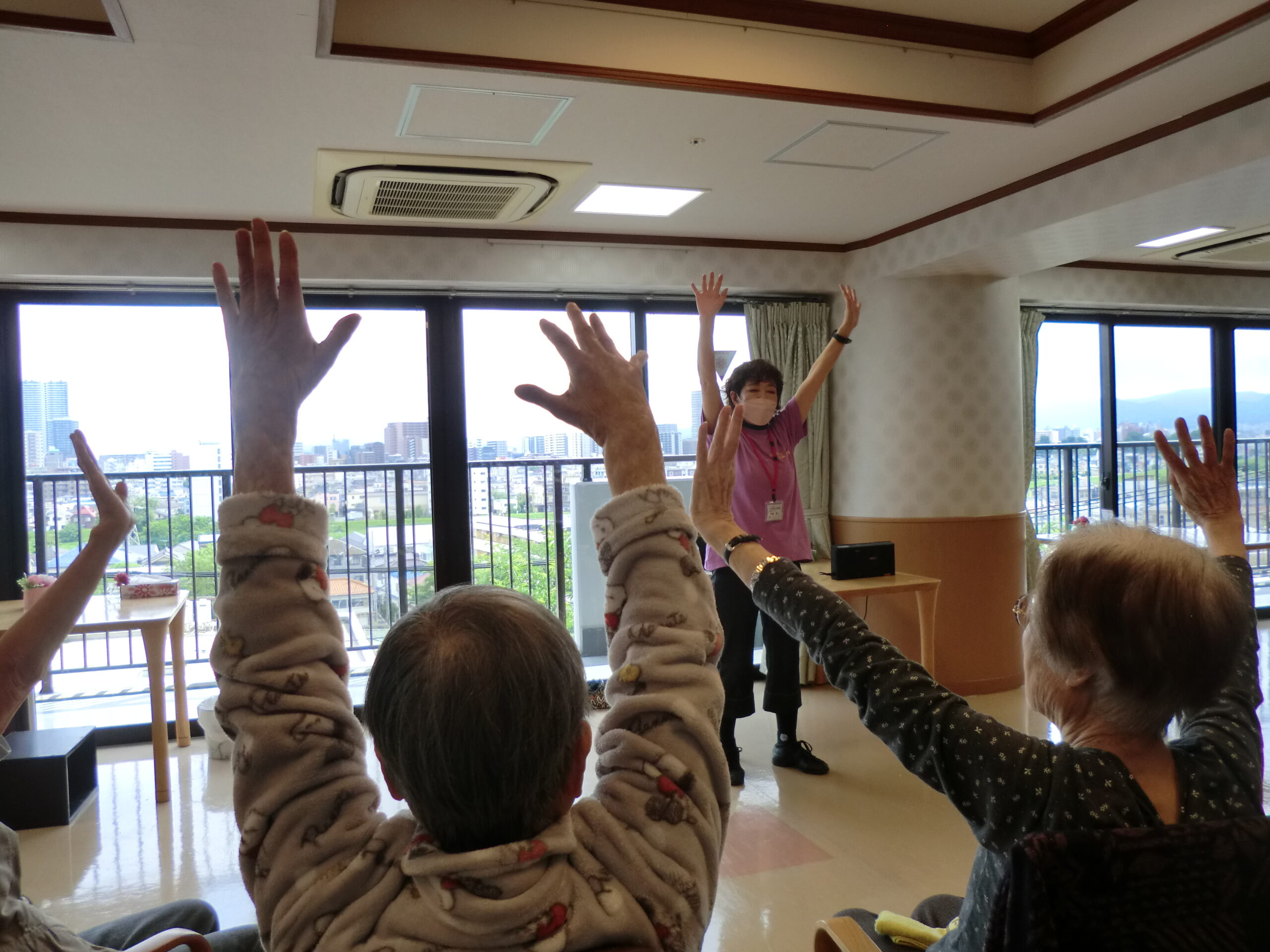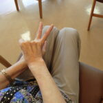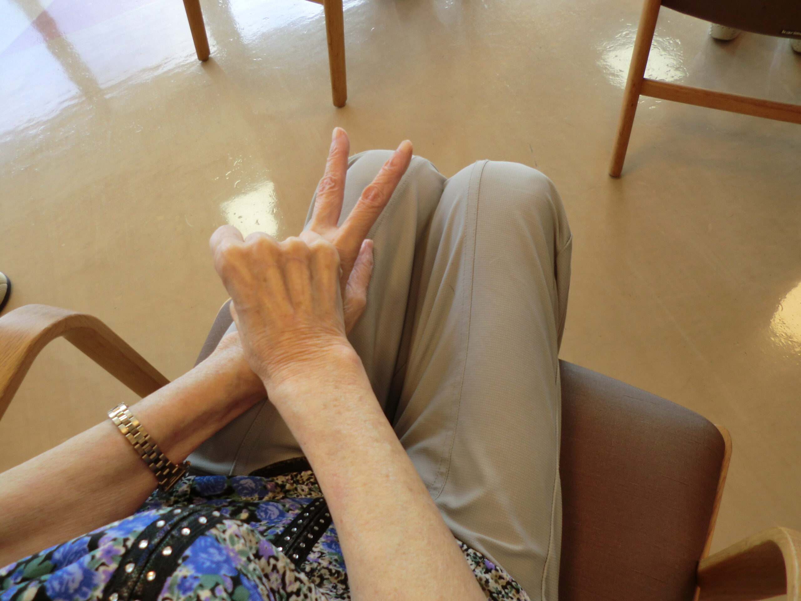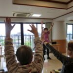 大きく手を伸ばしたり、ラップの芯を持ち肩を叩いたりと、