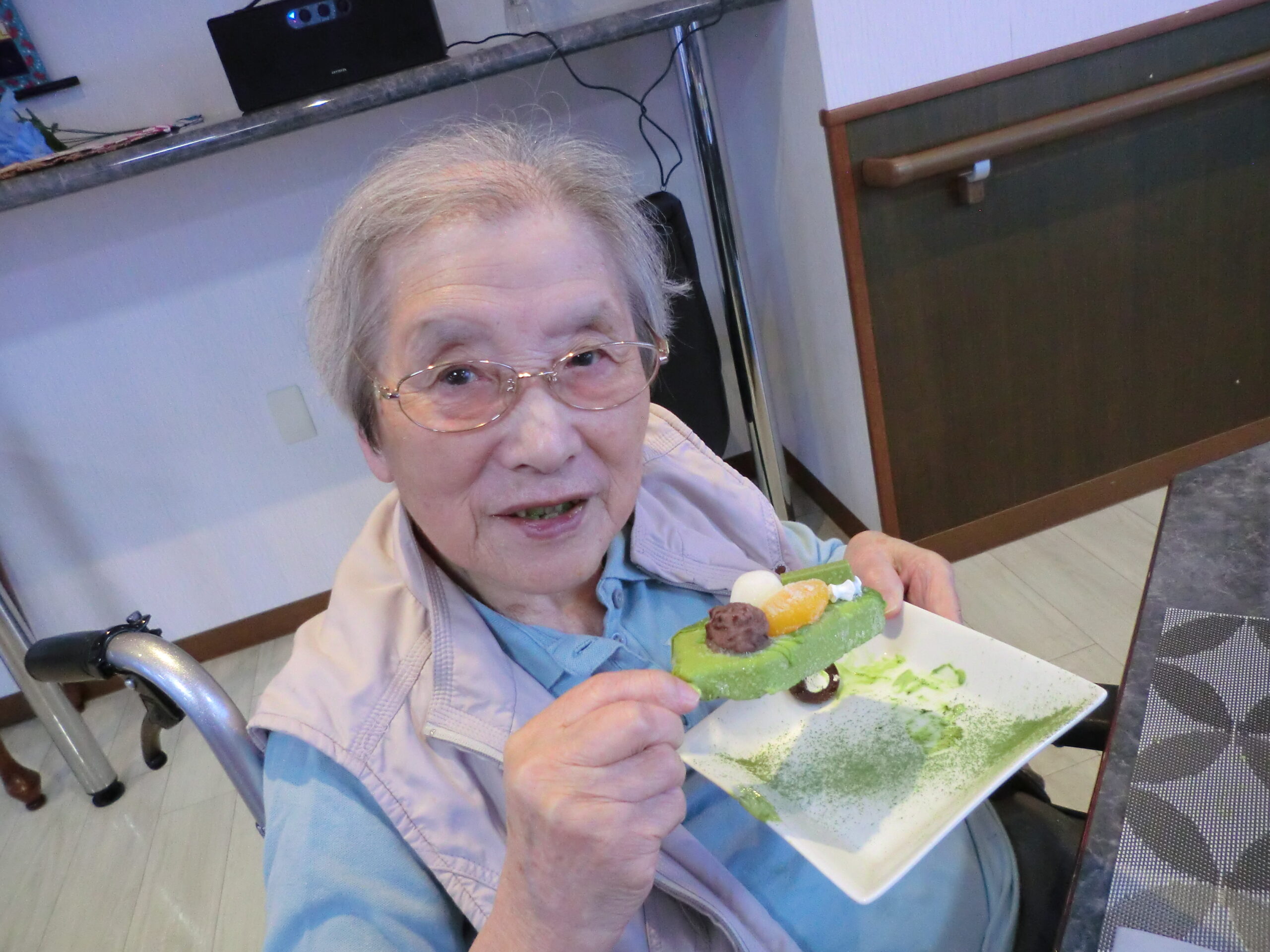 抹茶アイスにフルーツがトッピングされており、