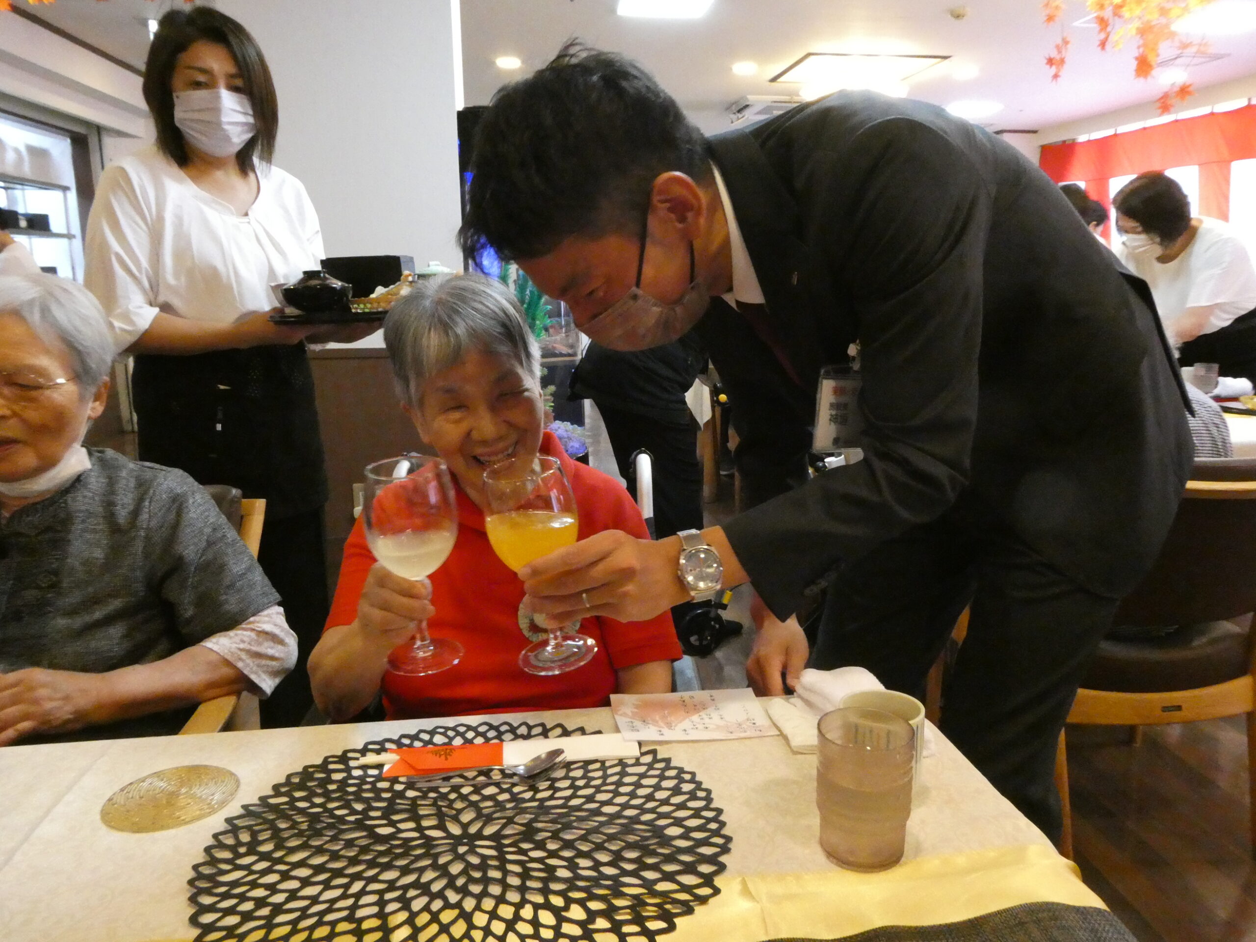 最後は季節のフルーツを使った特製あんみつをご提供。甘さと涼やかさで心も体もほっと和む締めくくりとなりました。たくさんの笑顔と温かな拍手にあふれた一日で、心温まる敬老会となりました。これからも皆様の健康と幸せをお祈りしつつ、共に歩んでまいります。