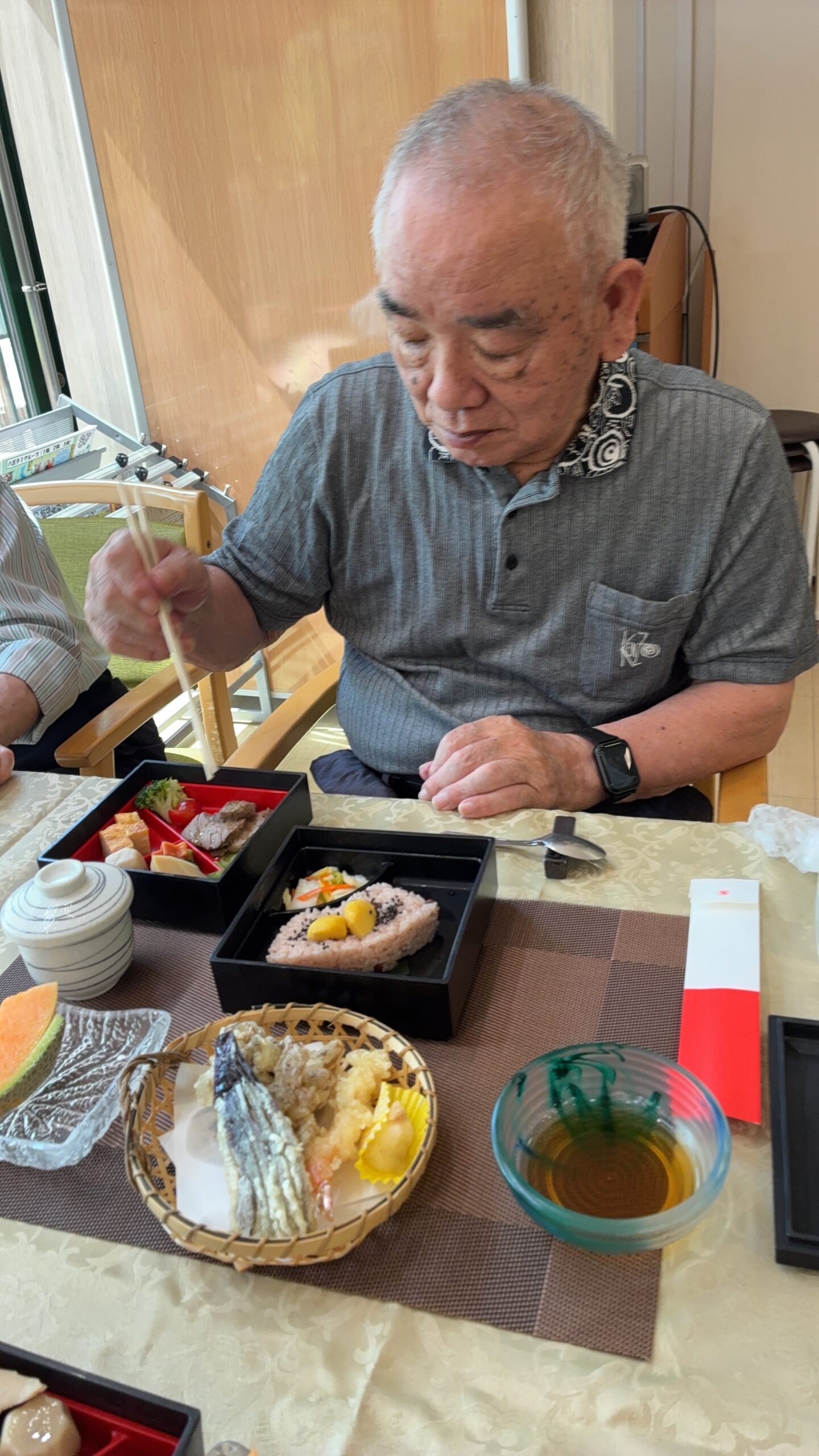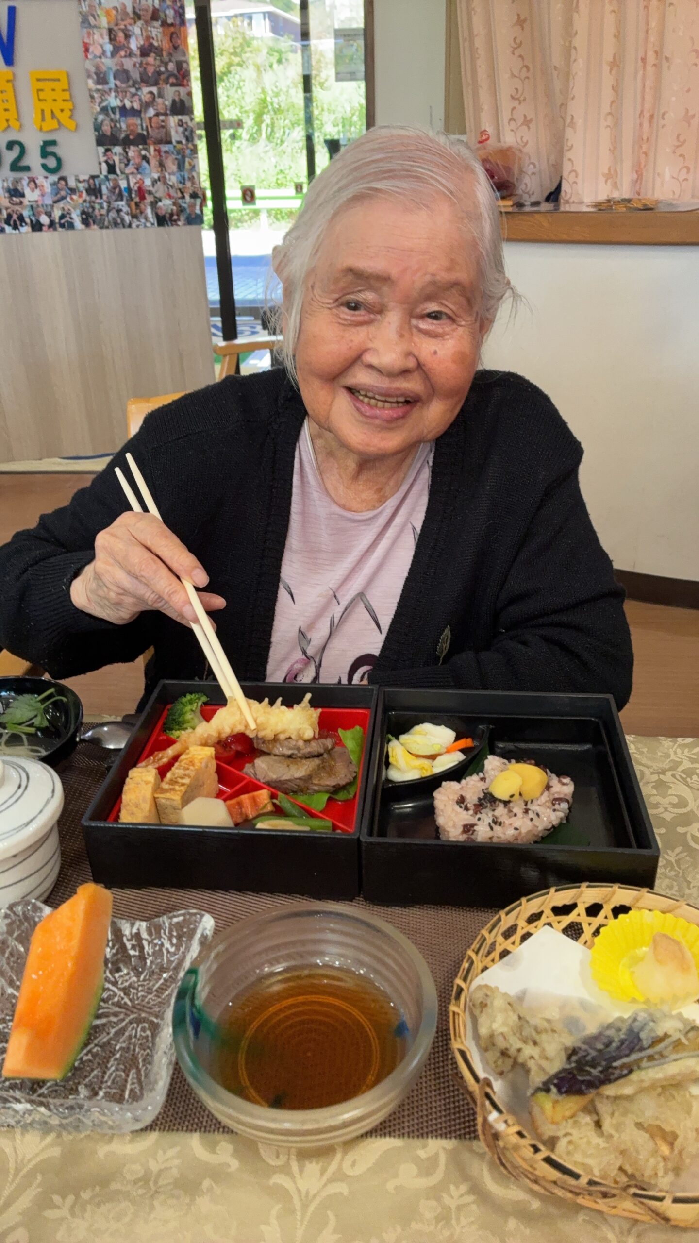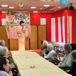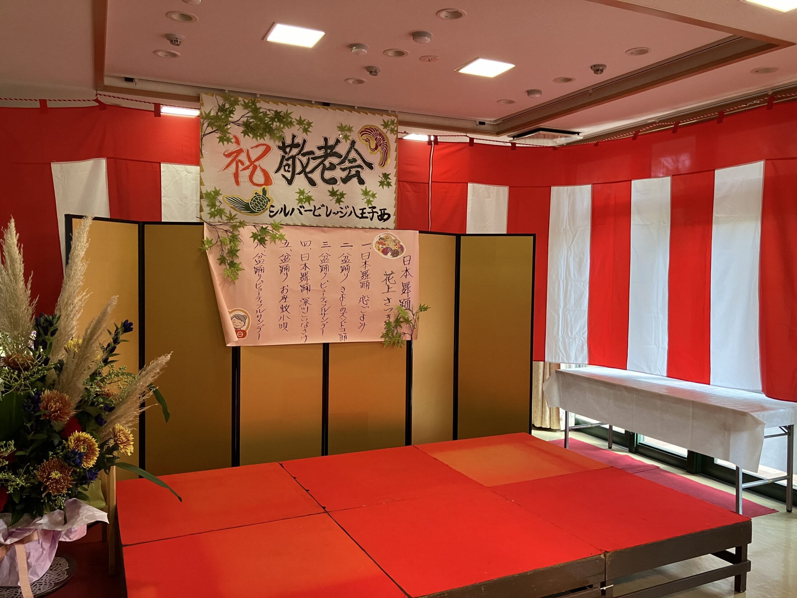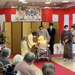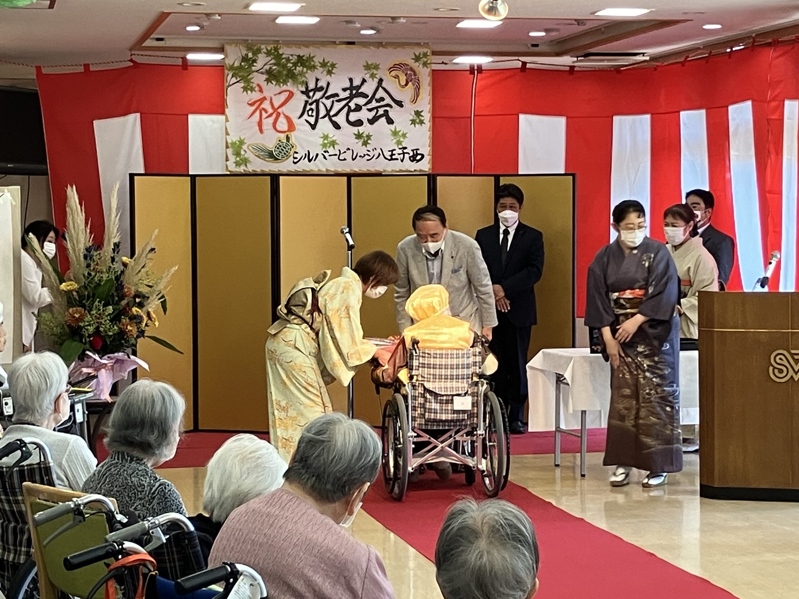 厳粛な雰囲気の中、レッドカーペットを歩くご入居者がとても大きく見えました。表彰後に職員による合唱「川の流れのように」をプレゼントさせて頂き、感動の涙を流されている方もおられ職員ももらい泣き…。祝い御膳を「豪華だ」ととても喜んで下さり、午後は日本舞踊の先生をお招きし賑やかに楽しい時間を過ごされました♪おやつに和菓子を提供。皆様お上品に召し上がられておりました。来年も同じ顔で元気にこの日を迎えましょうと誓い合いました。