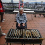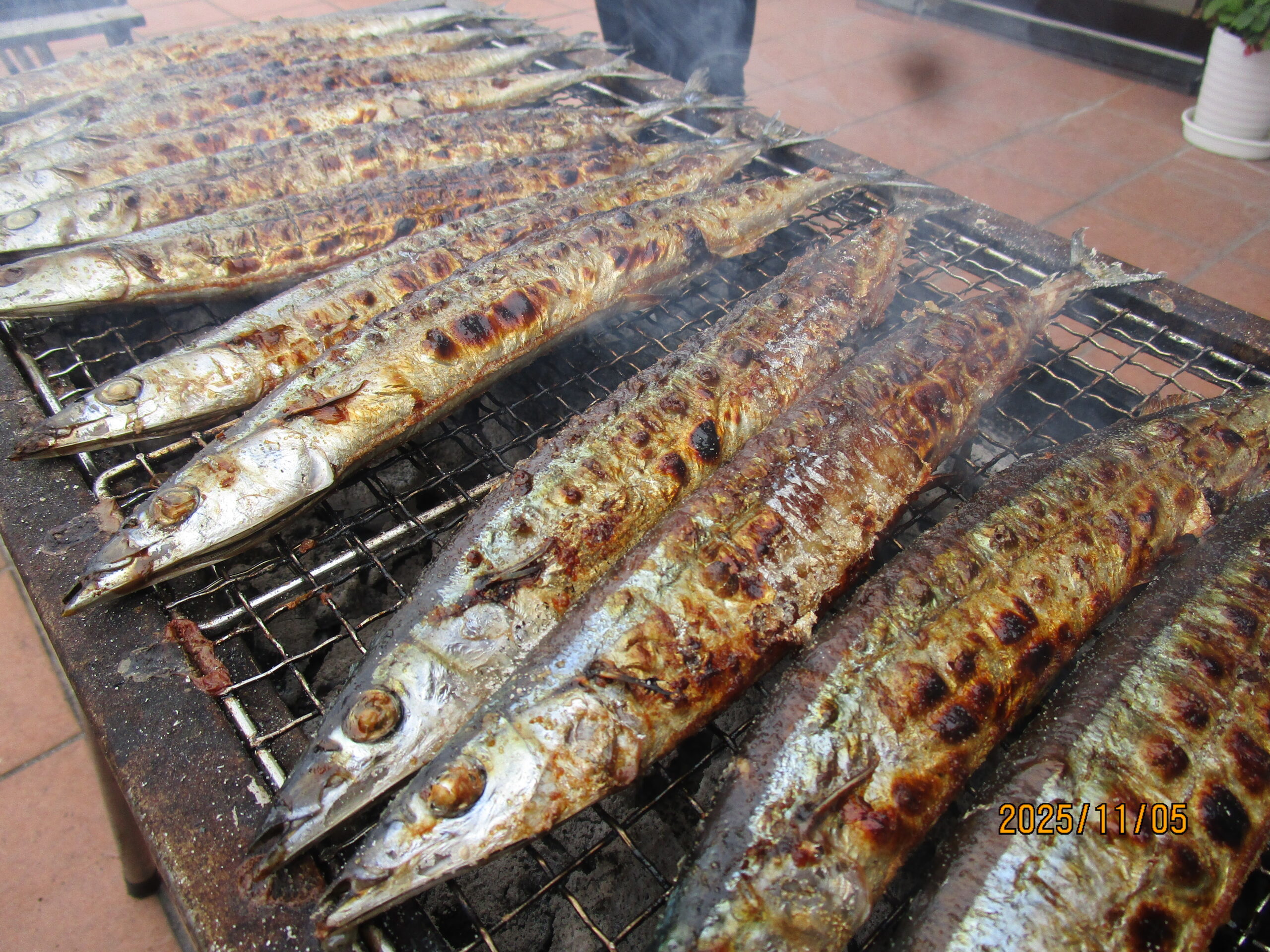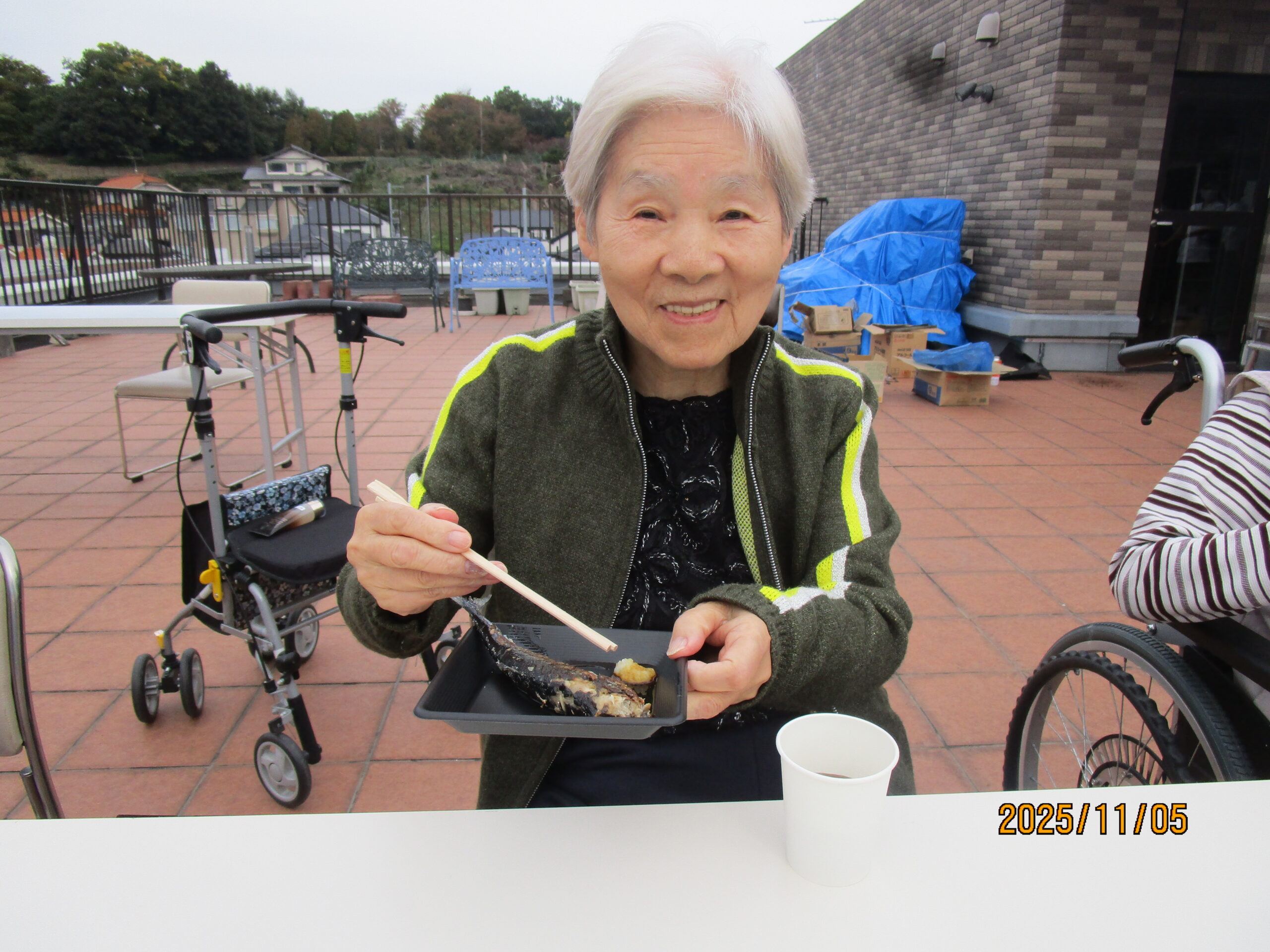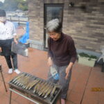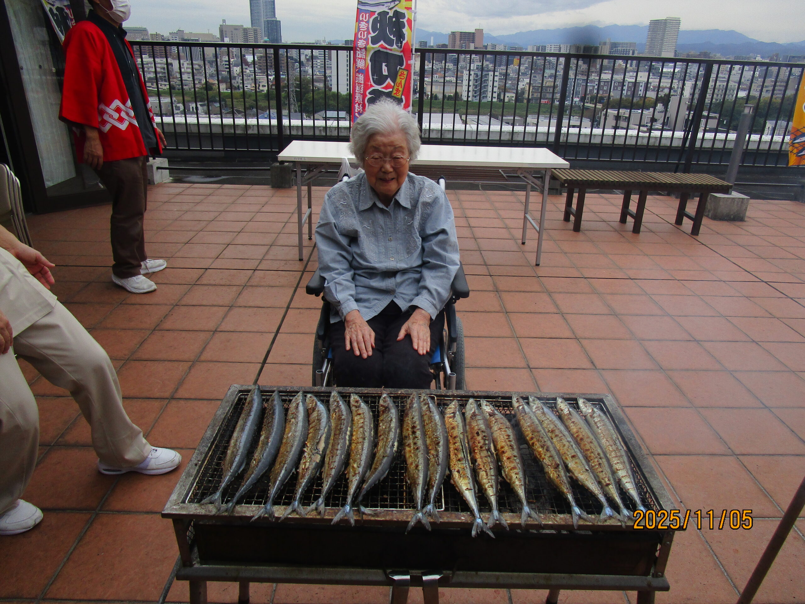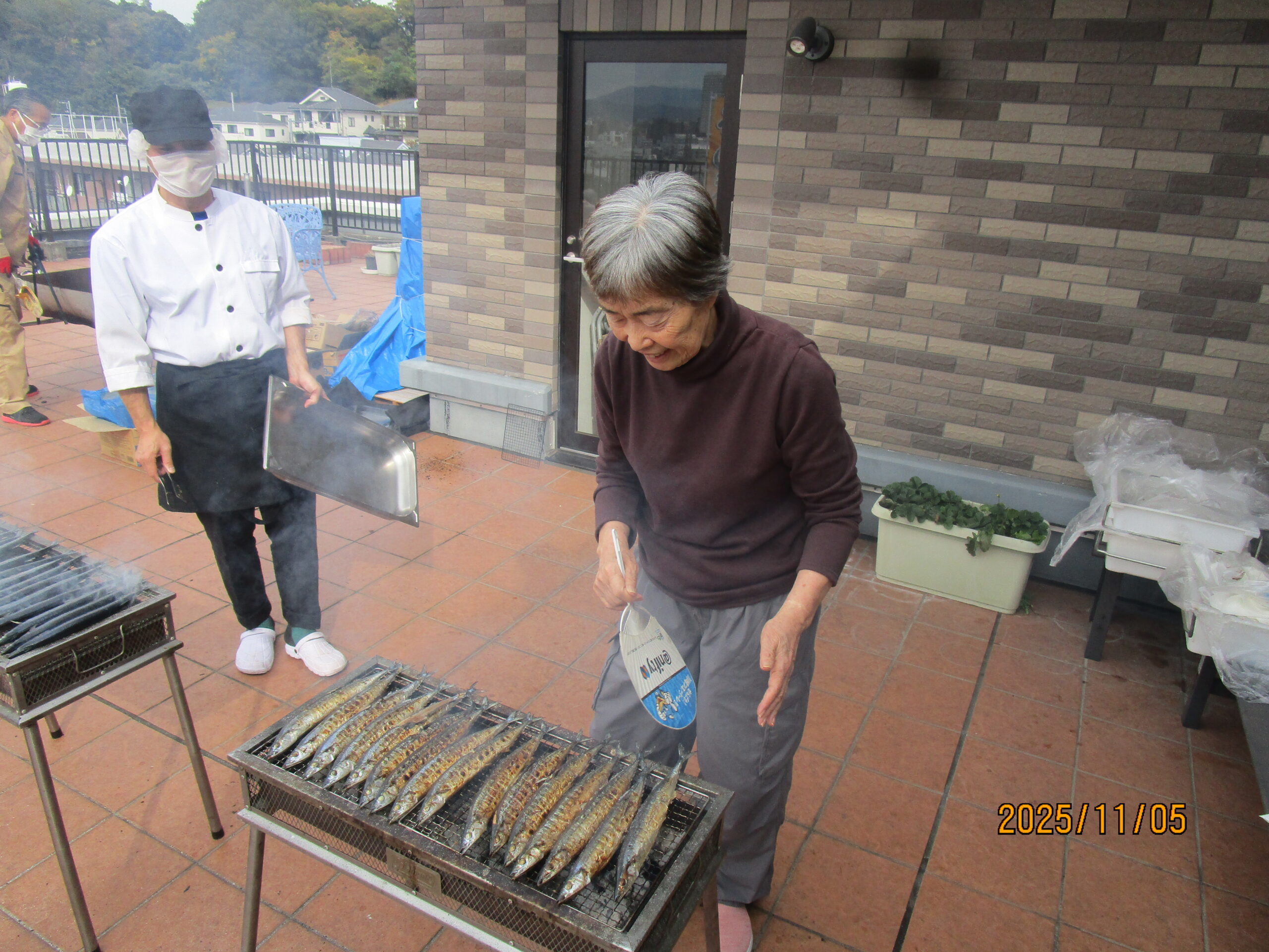 11月5日6階屋上で、さんまを炭火で焼いて昼食に召し上がっていただきました。