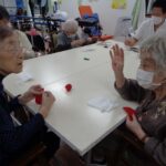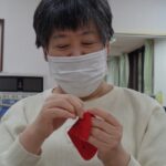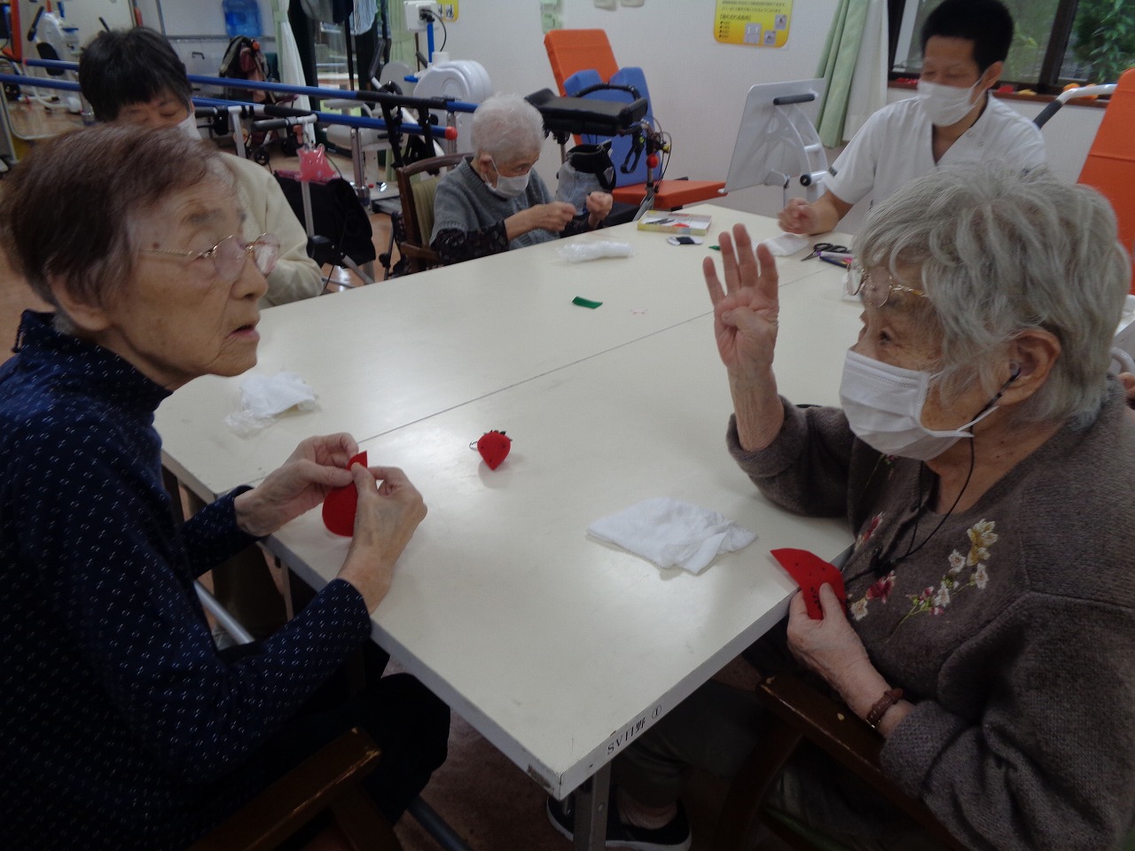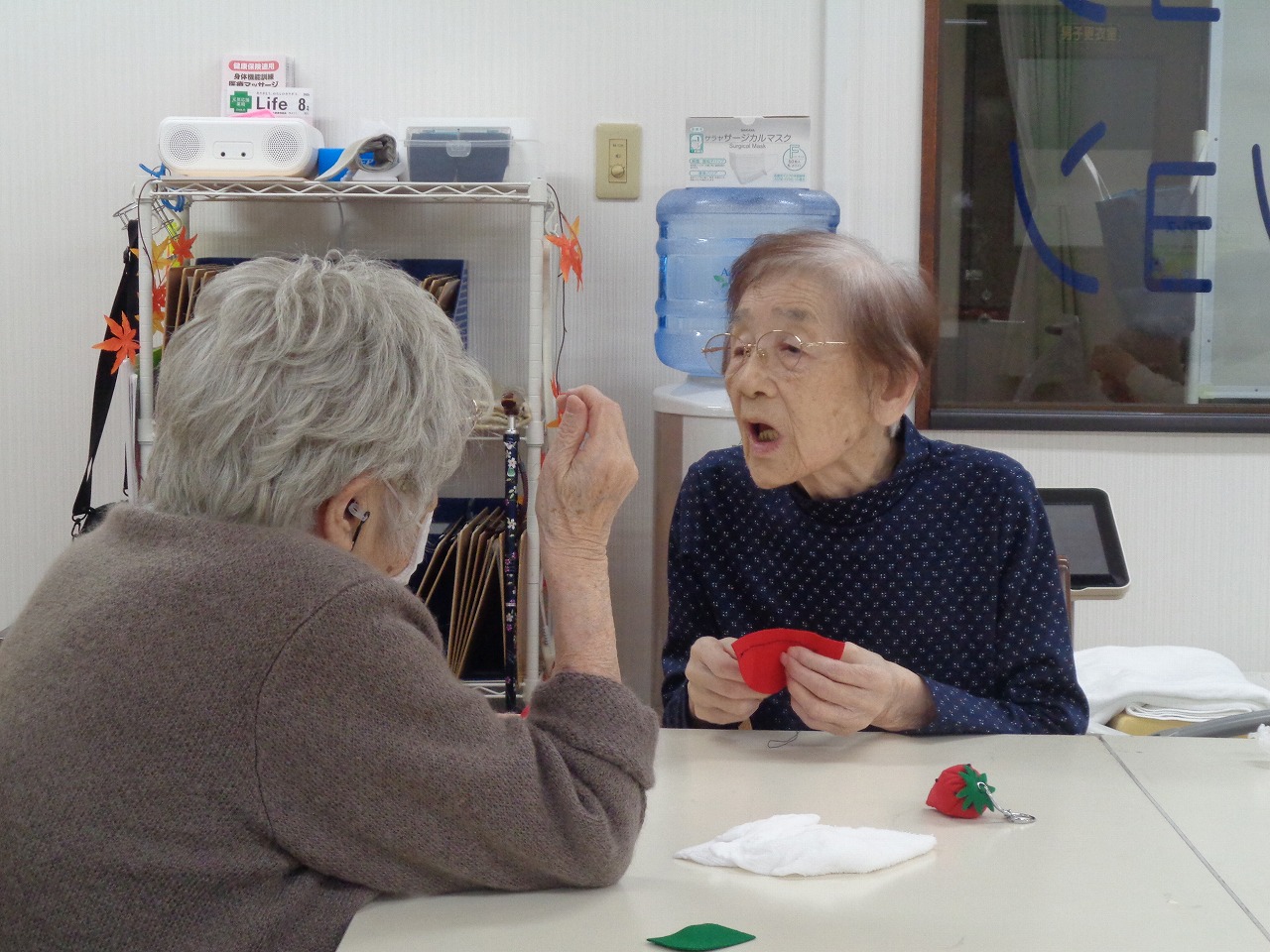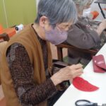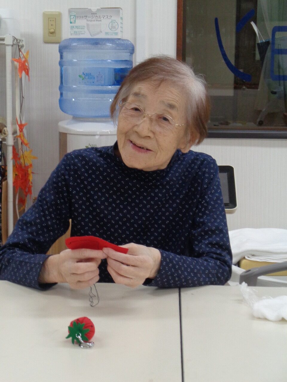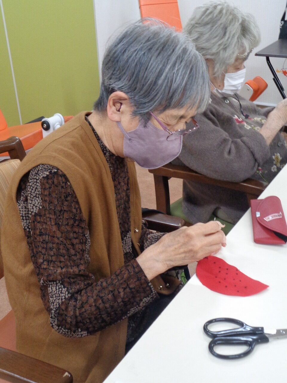 11月5日(水)、本日の手作りクラブはフェルトのマスコット作りです!半月の形に切った赤いフェルトに、黒糸で玉留めを沢山作っていきます…玉留めはお好きな数だけ作ります!おしゃべりしながら、チクチクと沢山作ってくださいました♪