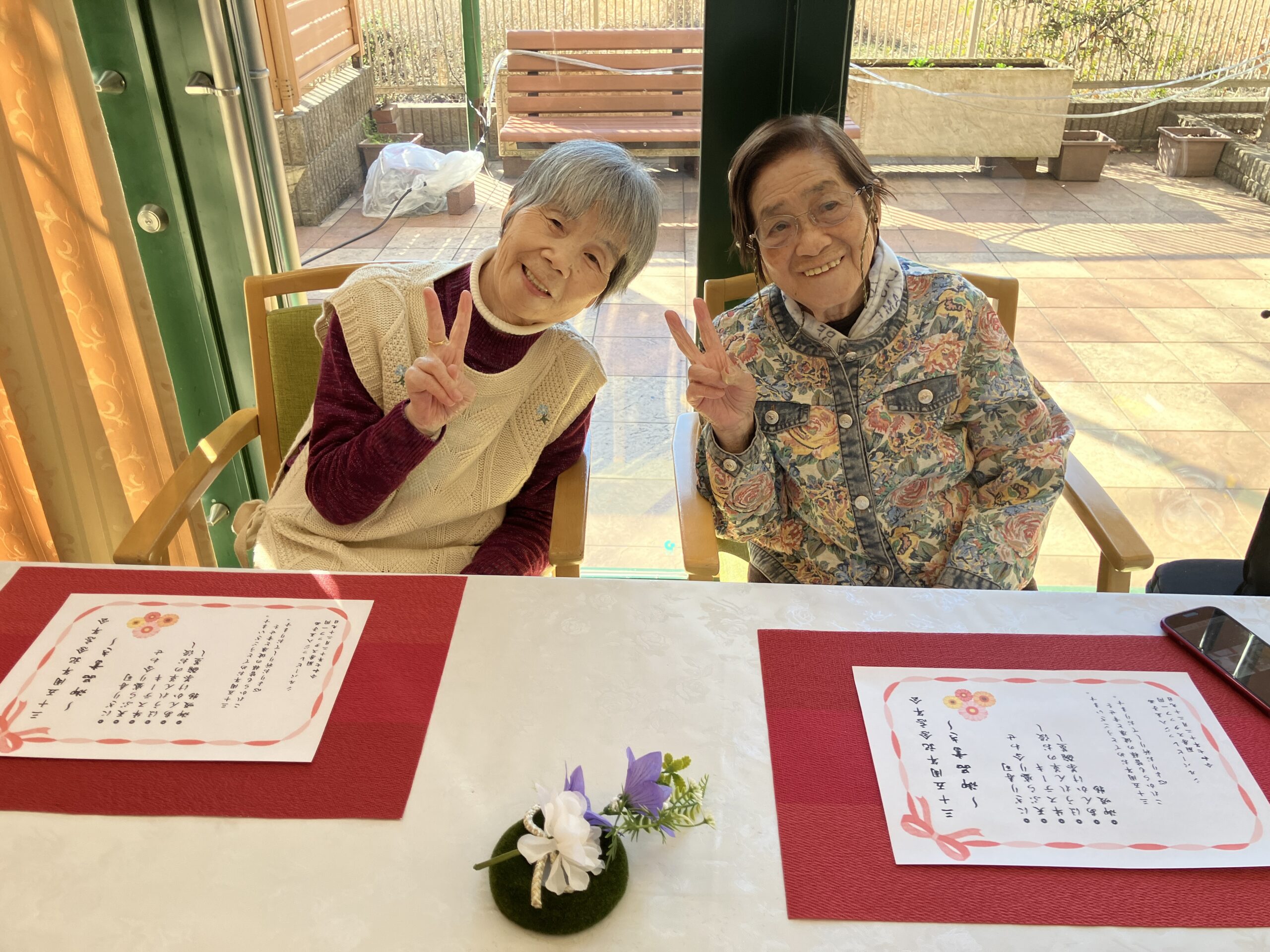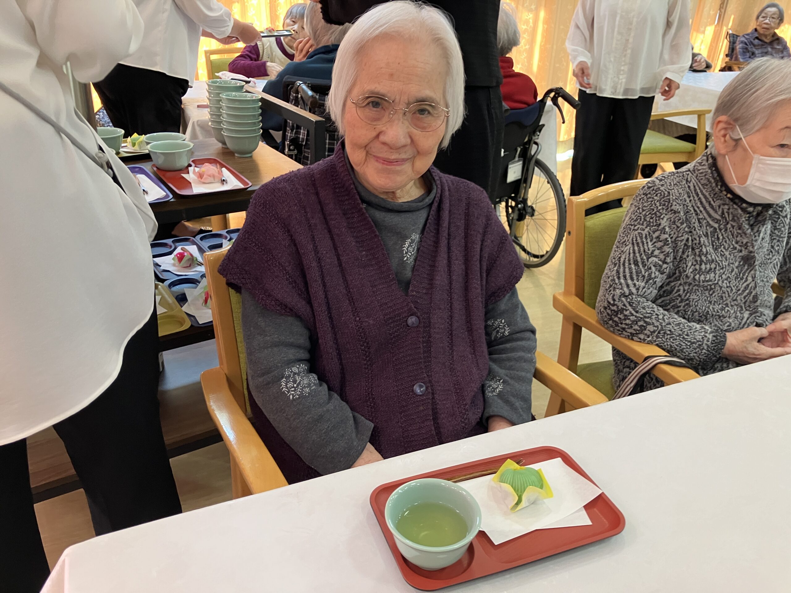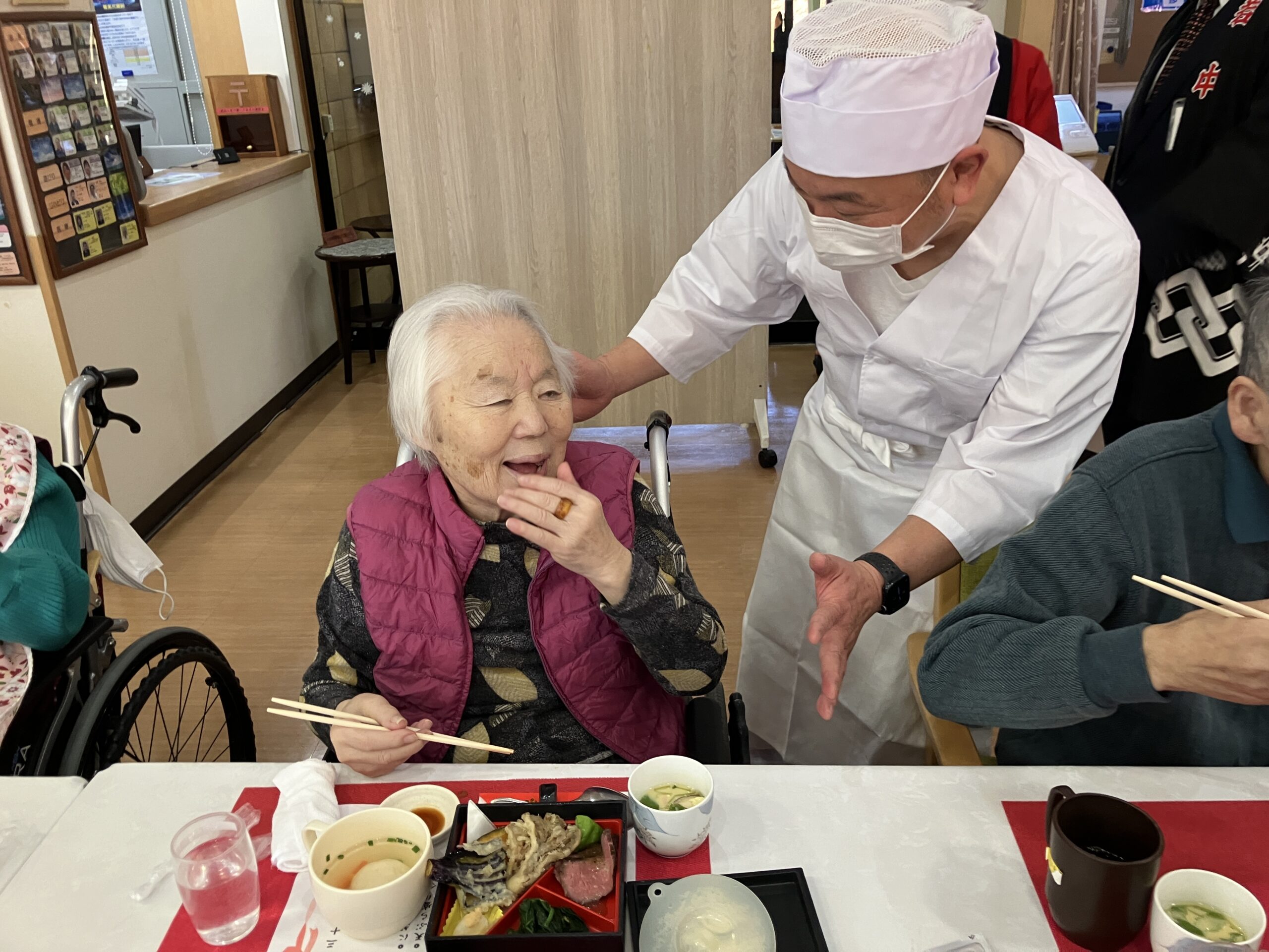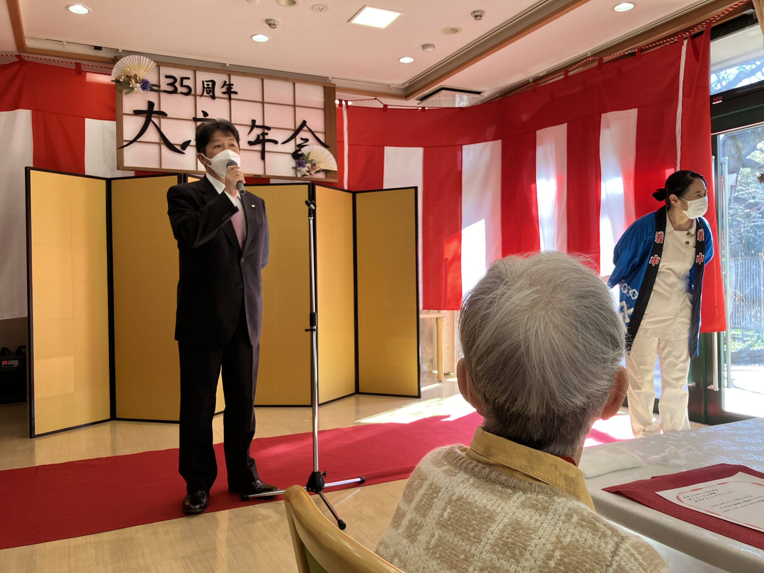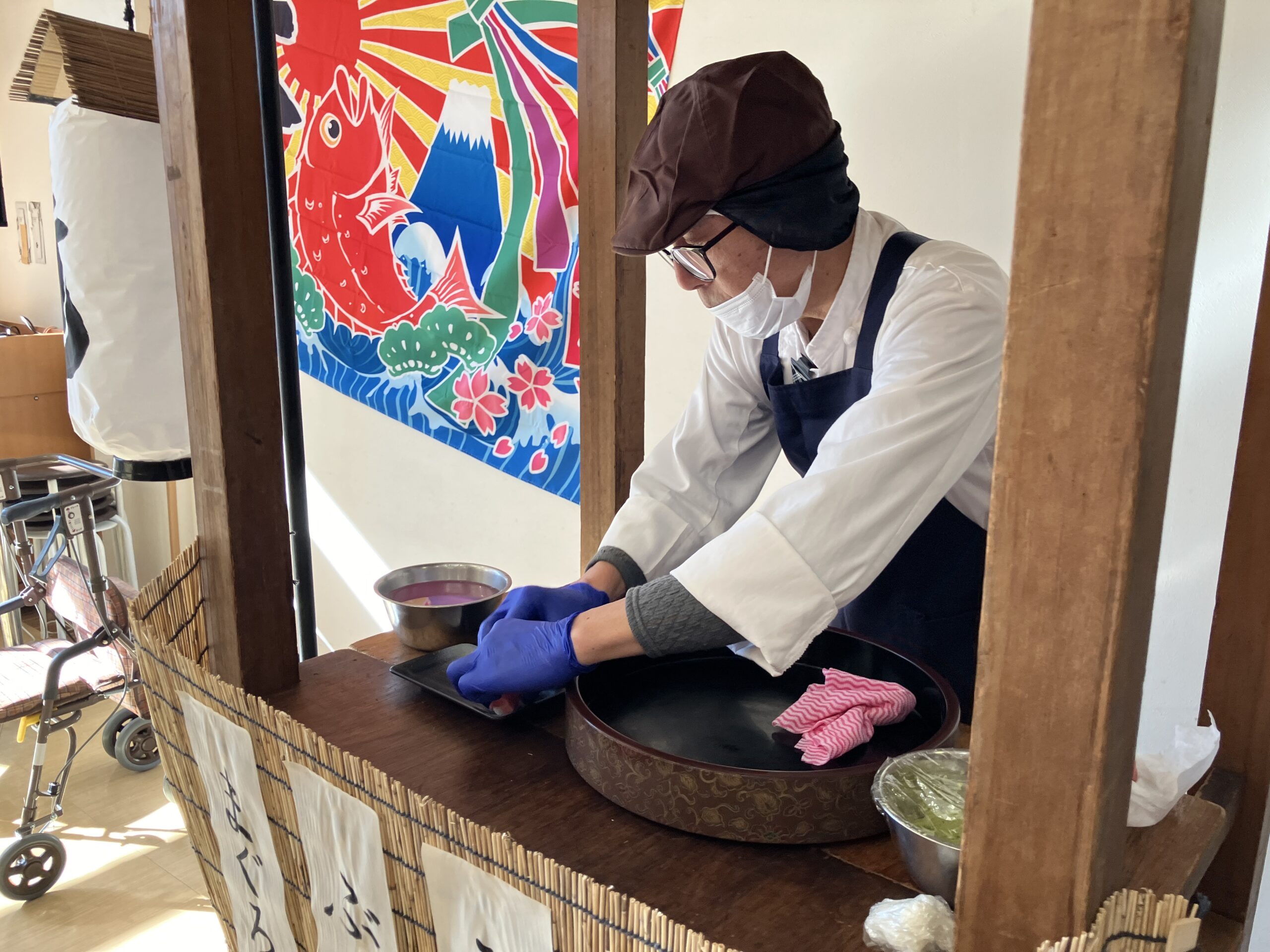 12月29日、当施設はおかげさまで開設35周年を迎えることができました。この節目を記念し、今年は少し特別な大忘年会を開催しました。当日は施設長のご挨拶から始まり、各部署より日頃の感謝を込めた言葉が述べられ、皆様と乾杯。会場は終始、和やかで温かな雰囲気に包まれていました。昼食は豪華なお膳をご用意。さらに厨房職員による握り寿司の実演も行われ「目の前で握ってもらうお寿司は何年ぶりかしら」と、皆様からは大変喜ばれる声が聞こえました。午後のおやつは練り切り・抹茶を提供。その後35年間の歩みを振り返る思い出スライドショーを上映しました。長年勤務されている職員や、長くご入居されている皆様も、懐かしそうに映像を眺めながら、思い出話に花を咲かせていらっしゃいました。これからも感謝の気持ちを忘れず、皆様と共に歩んでまいります。今後ともどうぞよろしくお願い致します。