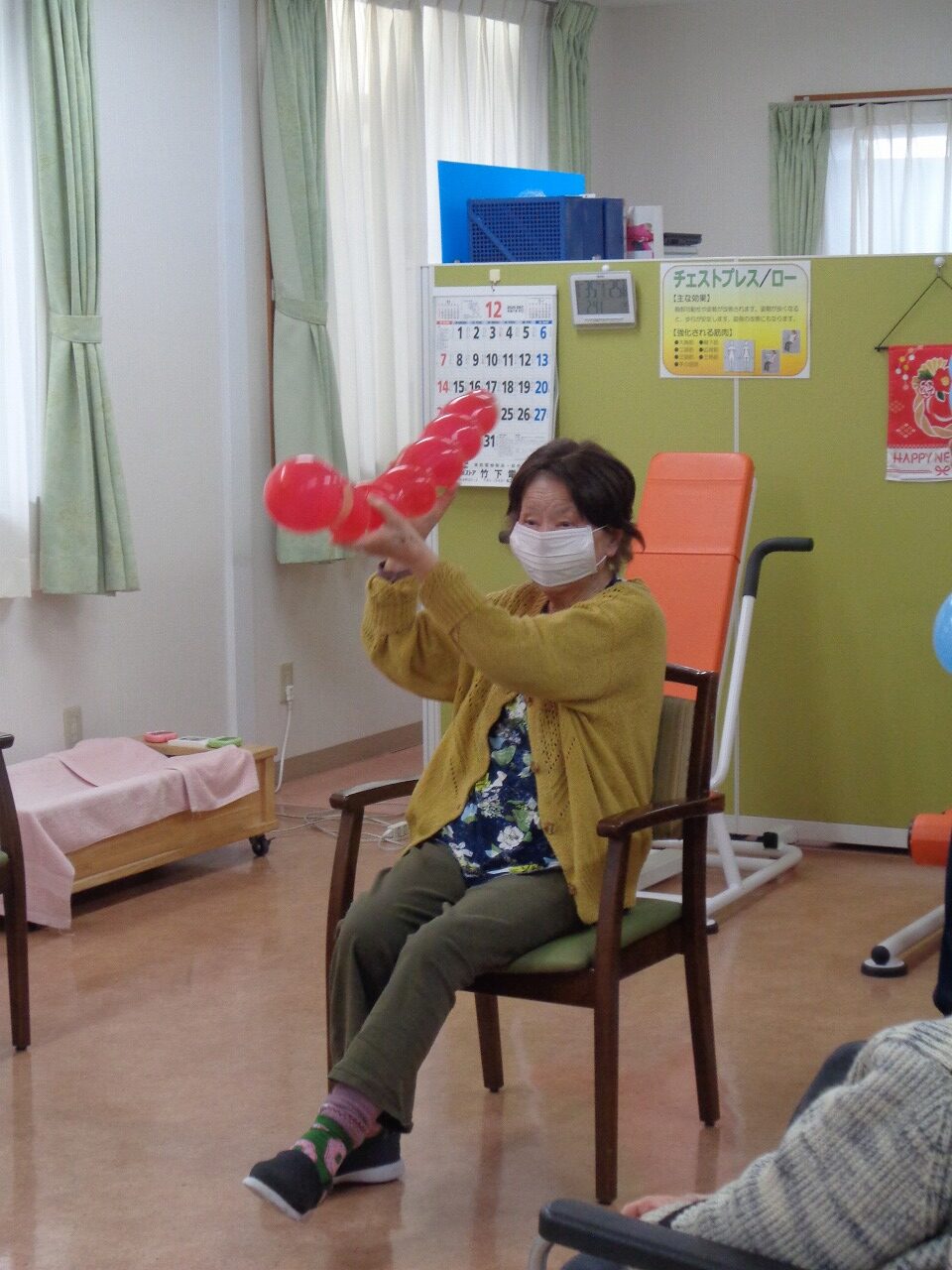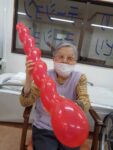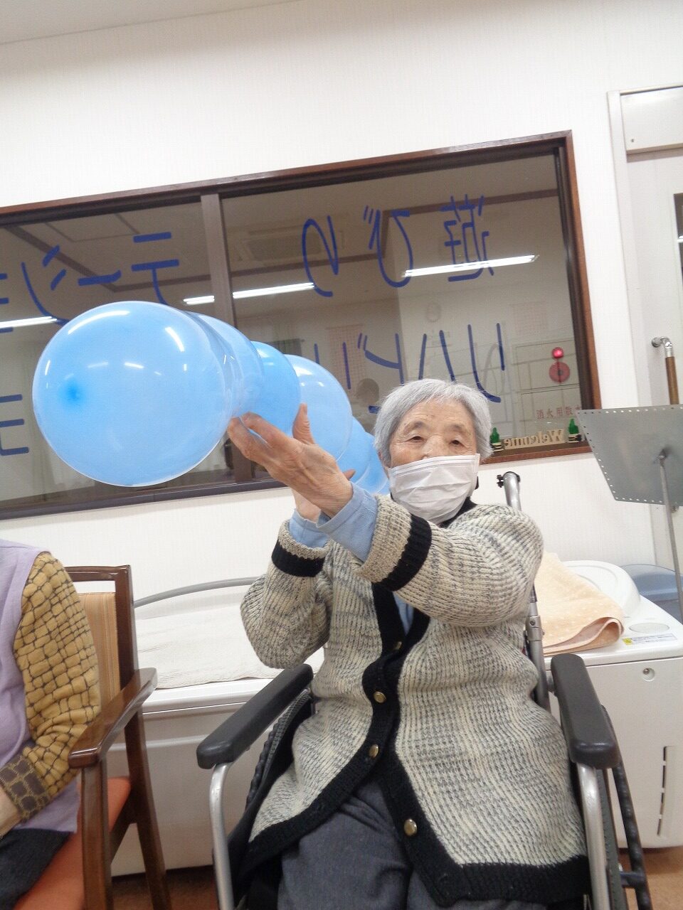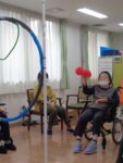 本日は日野リハビリ室にてレクリハクラブを開催し、『風船やりなげ』に挑戦していただきました!やりの様になが―い風船を、輪の中目掛けて投げ合い、2チームで得点を競います。狙いを定めて、見事に輪の中を通った際は、「上手ね!」「やったー!」と拍手と歓声、外れてしまっても「おしい!」「あと少しよ!」と、応援し合いながら盛り上がりました!