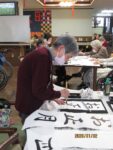 お手本をじっくりと眺め、立ち上がり力強く筆を運ばれる方、