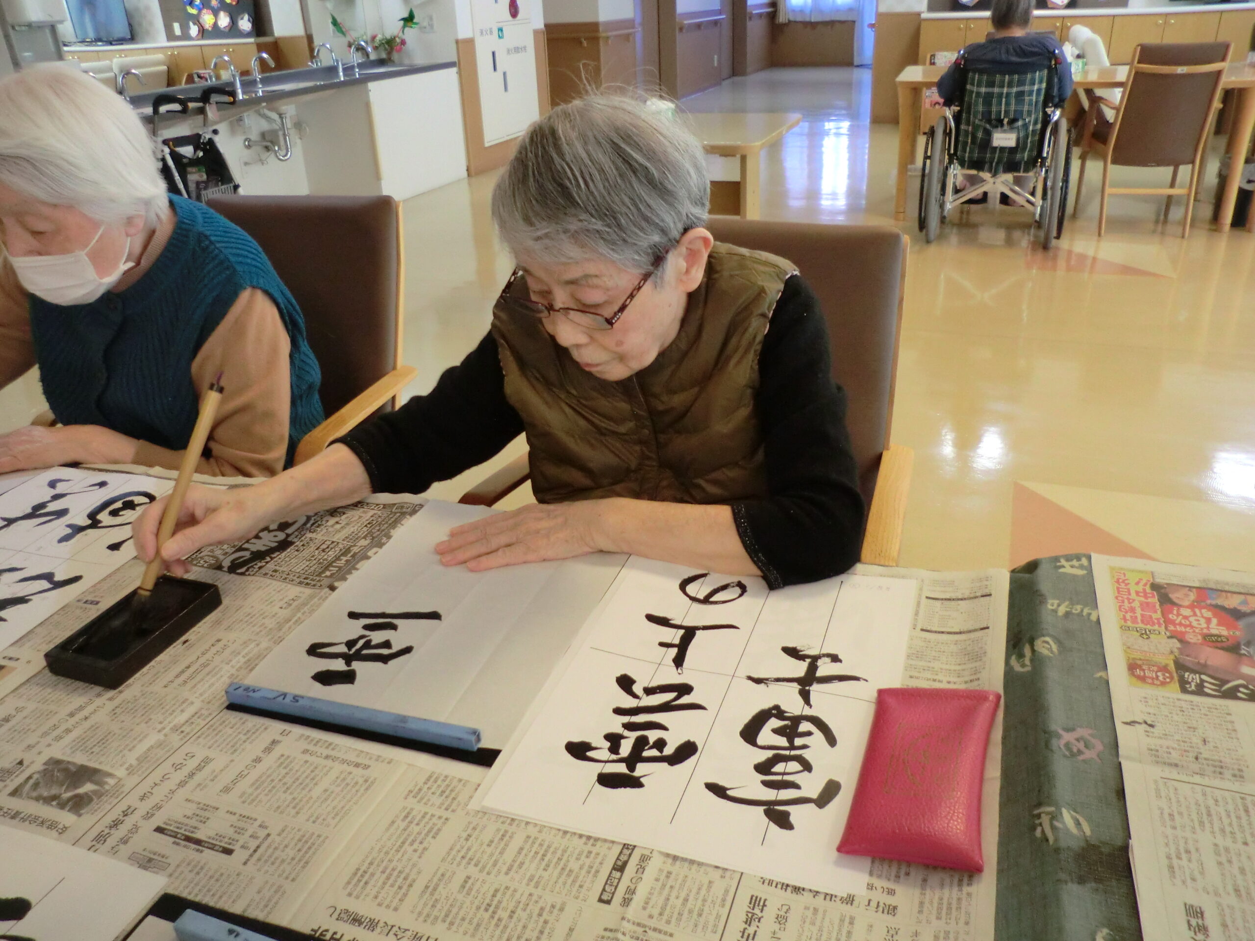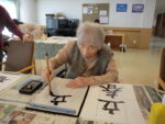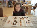 2階ホールにて書道を行いました! 今回のお手本は「ゆき」「駅伝」と冬を連想する言葉から、「立春」「梅林」と春を感じる言葉でした!(^^)! 完成した作品は八巻先生に丸付けをして頂きました。