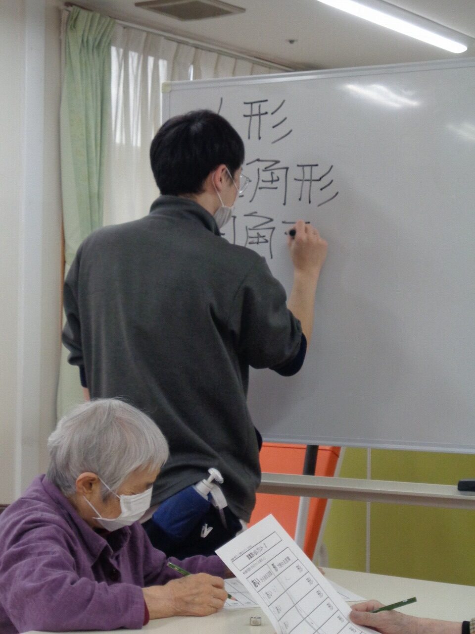 本日は日野リハビリ室にて学習クラブを開催し、『ことば思い出しクイズ』に挑戦していただきました。『あい』から始まる言葉、例えば『あいさつ』等、決められたお題に沿って言葉を思い出そう!というクイズです。